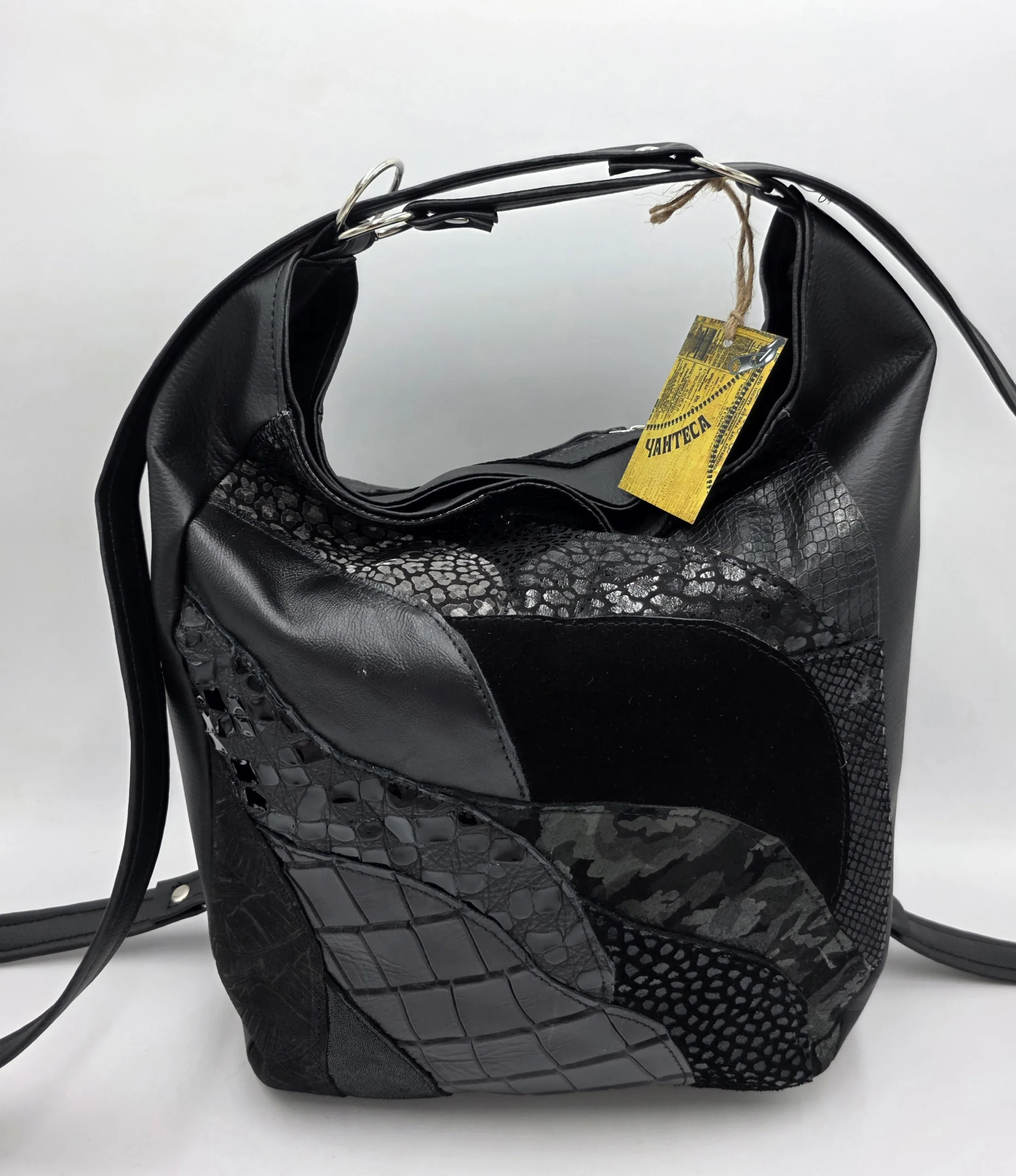 Уникална чанта раница от еко кожа с лице от естествена кожа, две дръжки дължина 90см,външен заден джоб с цип, вътре със средна преграда с цип, вътрешен джоб с цип и допълнителен джоб за телефон. Ширина 26см височина 31см,странично 15см,дъно 24см/15см.