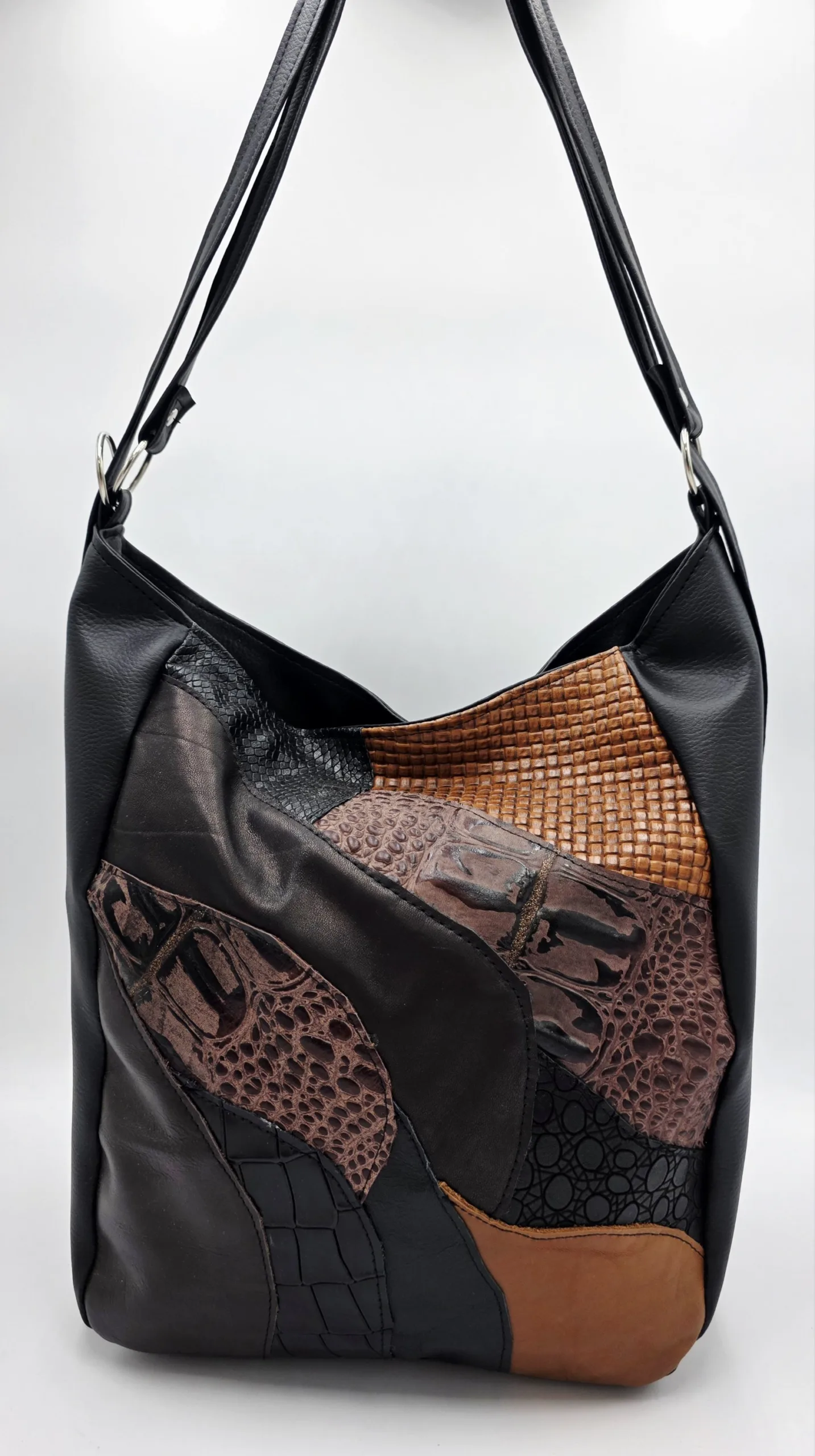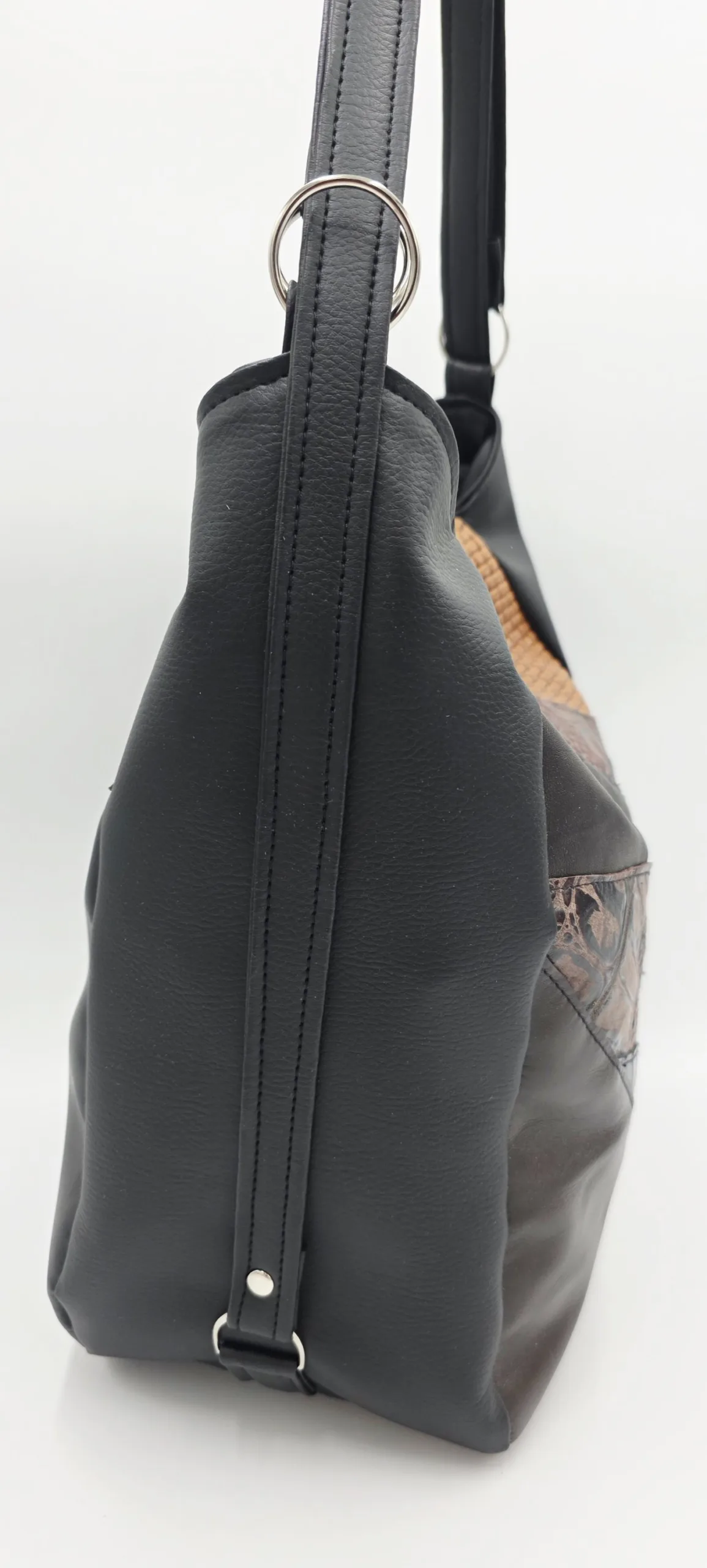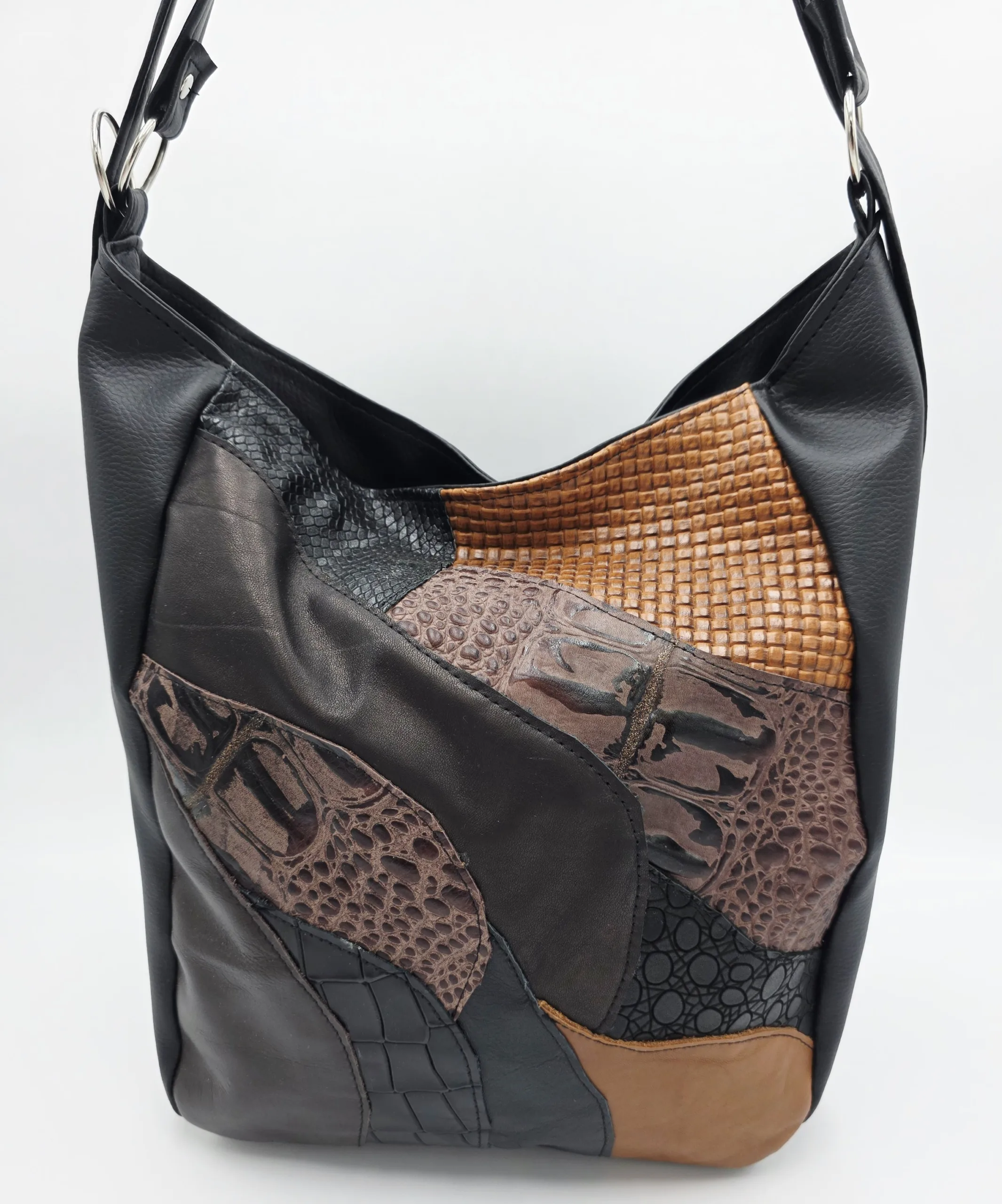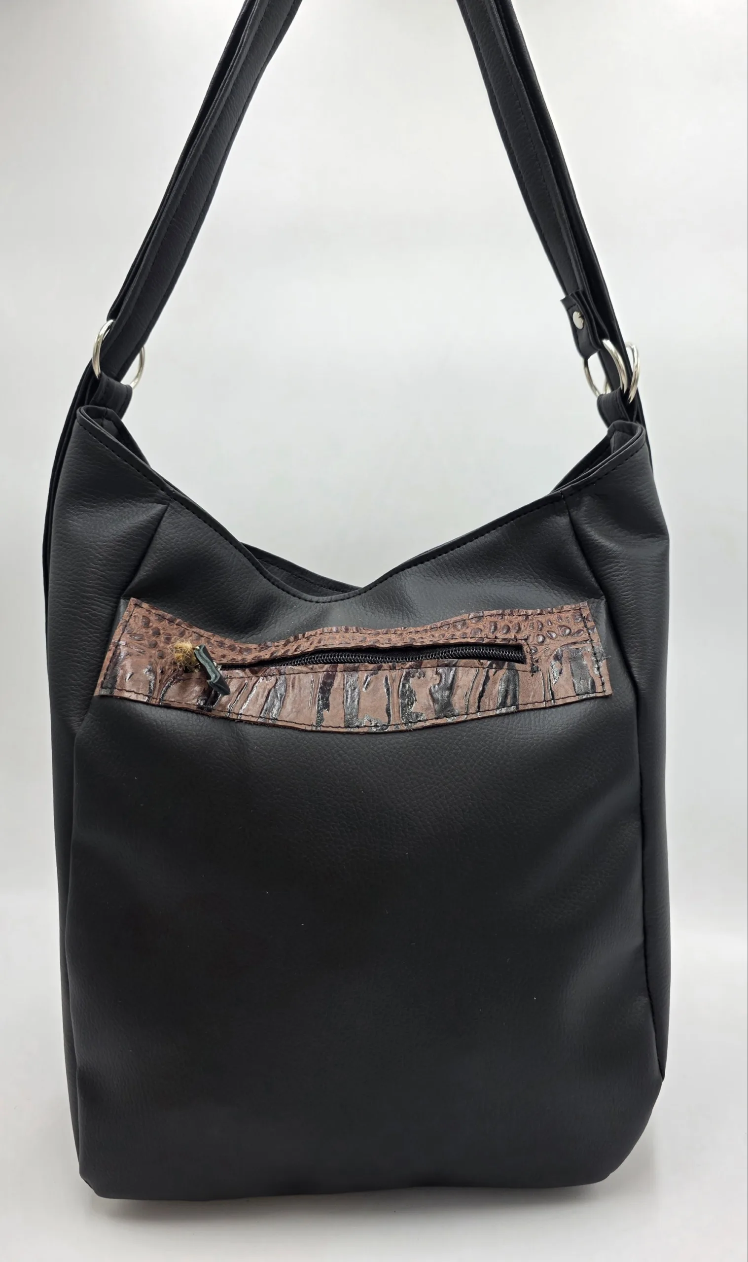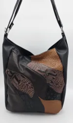 Чанта от еко кожа с нестандартна форма с две вързани регулиращи дръжки 120см максимална дължина, закопчава се с цип и