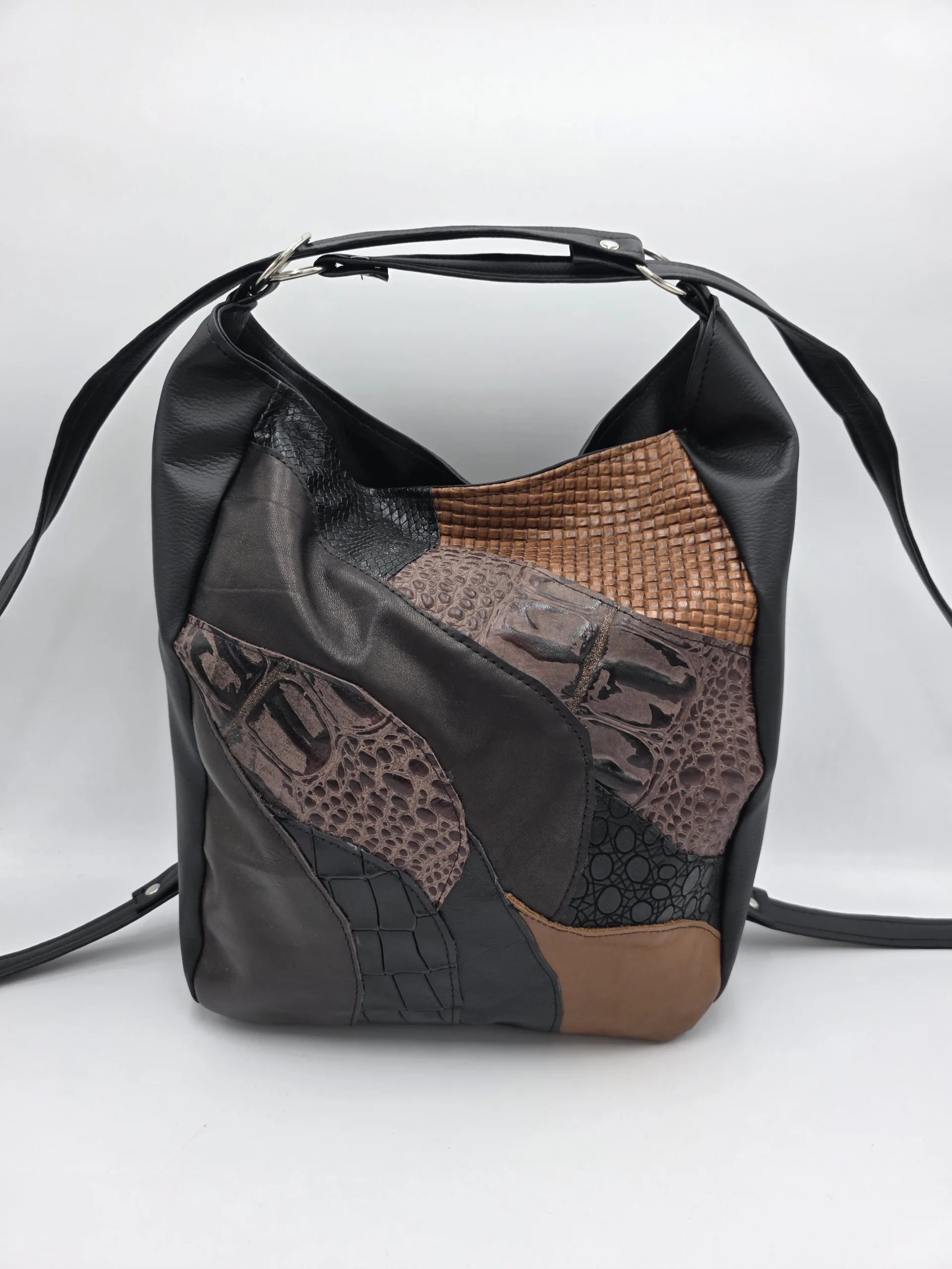Уникална чанта раница от еко кожа с лице от естествена кожа, две дръжки дължина 90см,външен заден джоб с цип, вътре