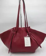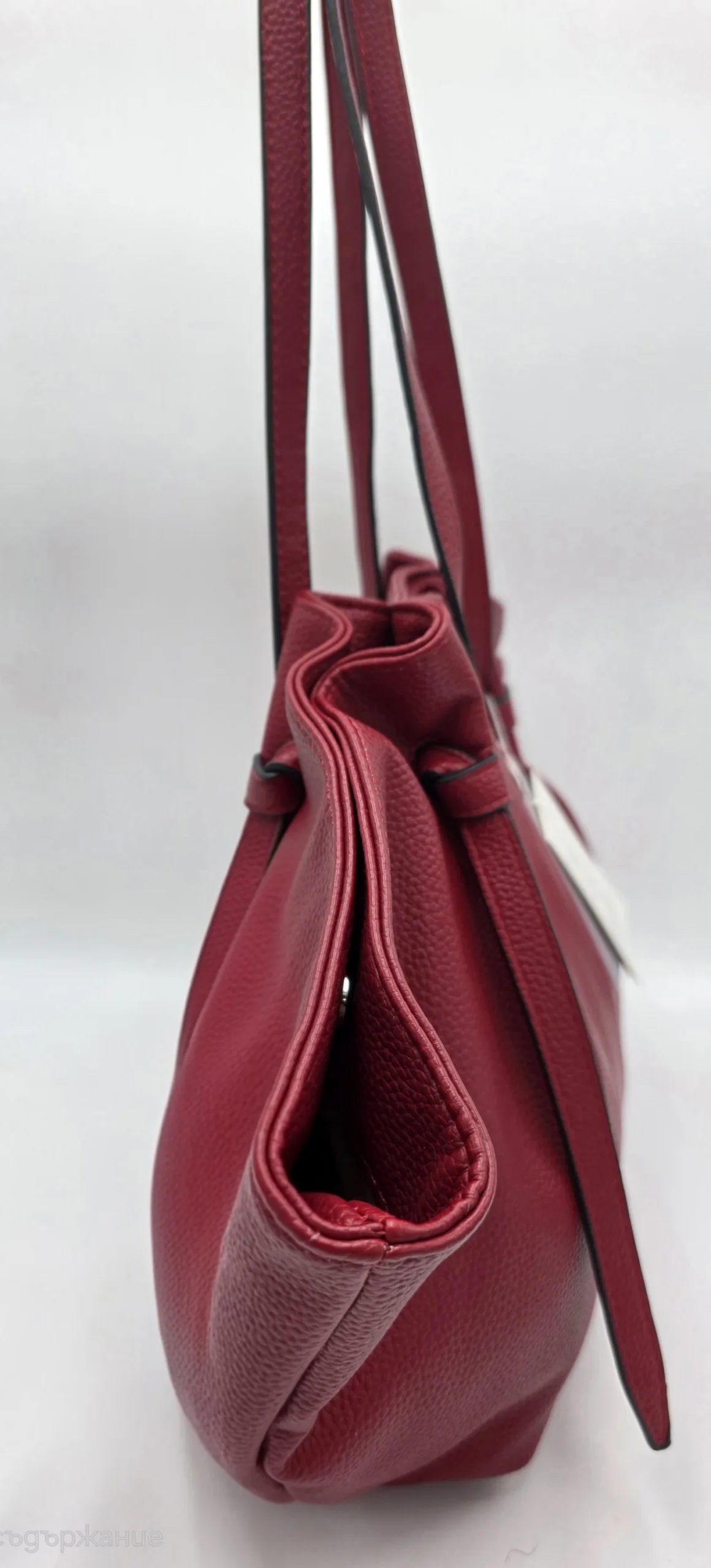 Чанта от еко кожа с нестандартна форма с две вързани регулиращи дръжки 120см максимална дължина, закопчава се с цип и две тик так копчета в двата края ,вътрешен джоб с цип и допълнителни джобове за телефон,ширина в горната част 52см,ширина в долната част 25см,височина 27см,дъно 26см/13см