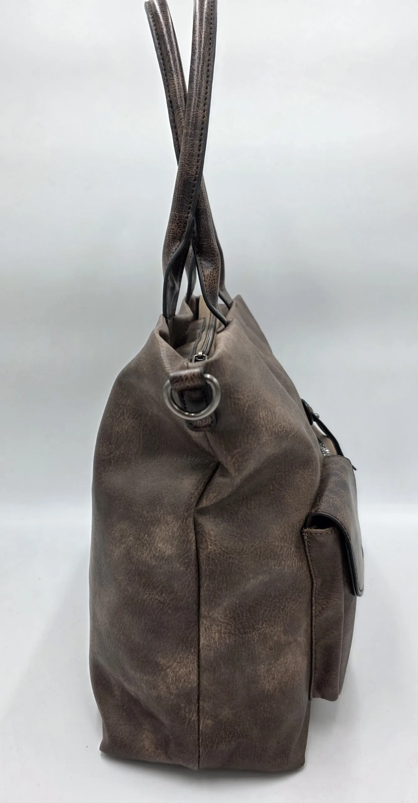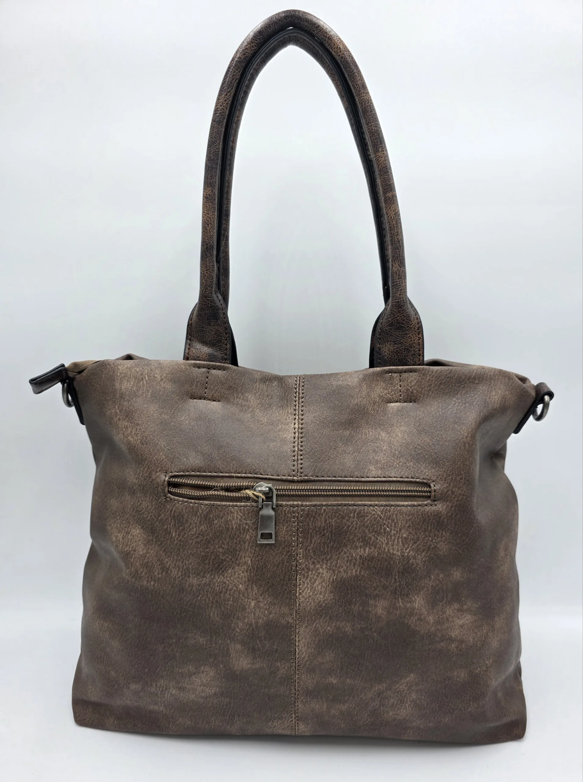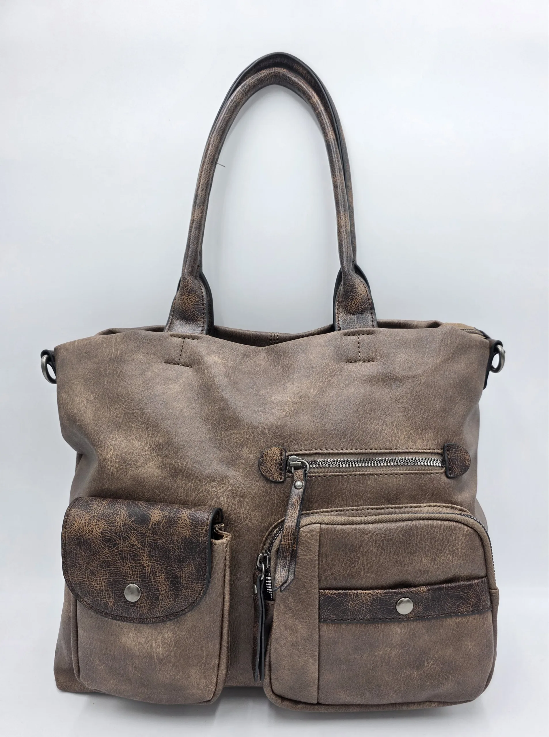 Чанта от еко кожа с две дръжки 51см и допълнителна дълга регулираща се дръжка 150см,закопчаване с цип, с три удобни предни джоба, външен заден джоб с цип,вътре със средна преграда с цип, вътрешен джоб с цип и допълнителни джобове за телефон. Ширина 40см, височина 30см,дъно 35дм/12см
