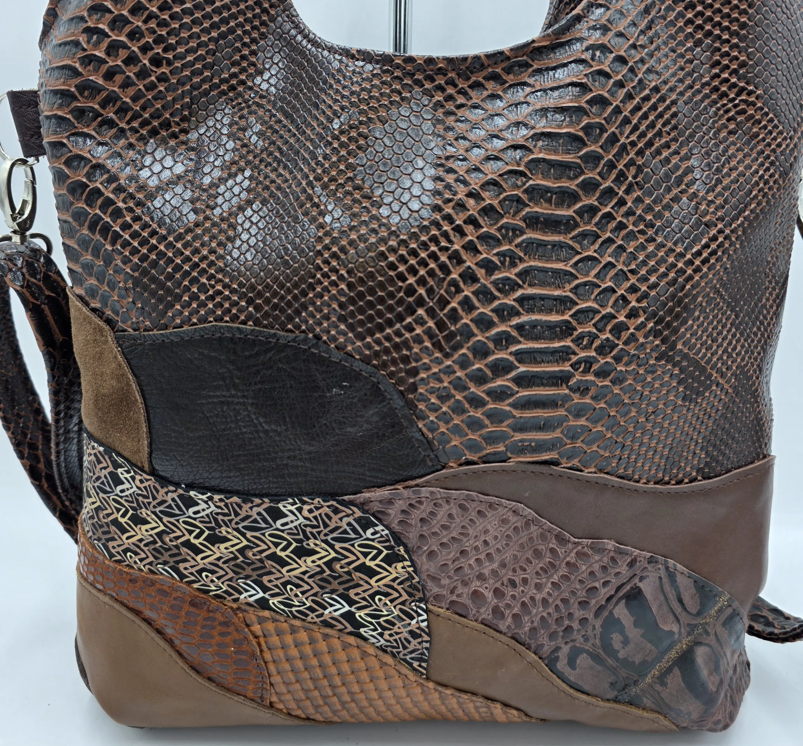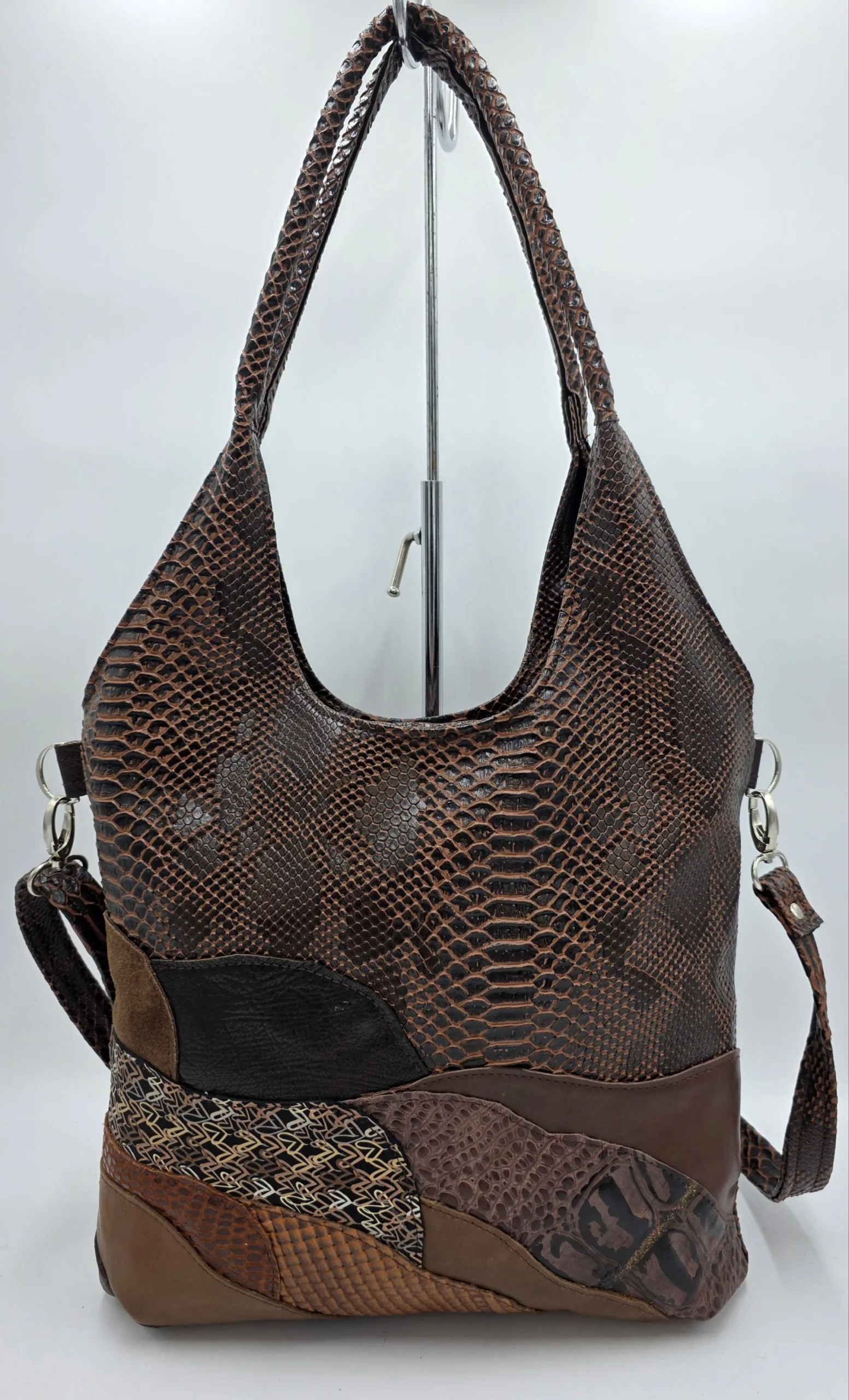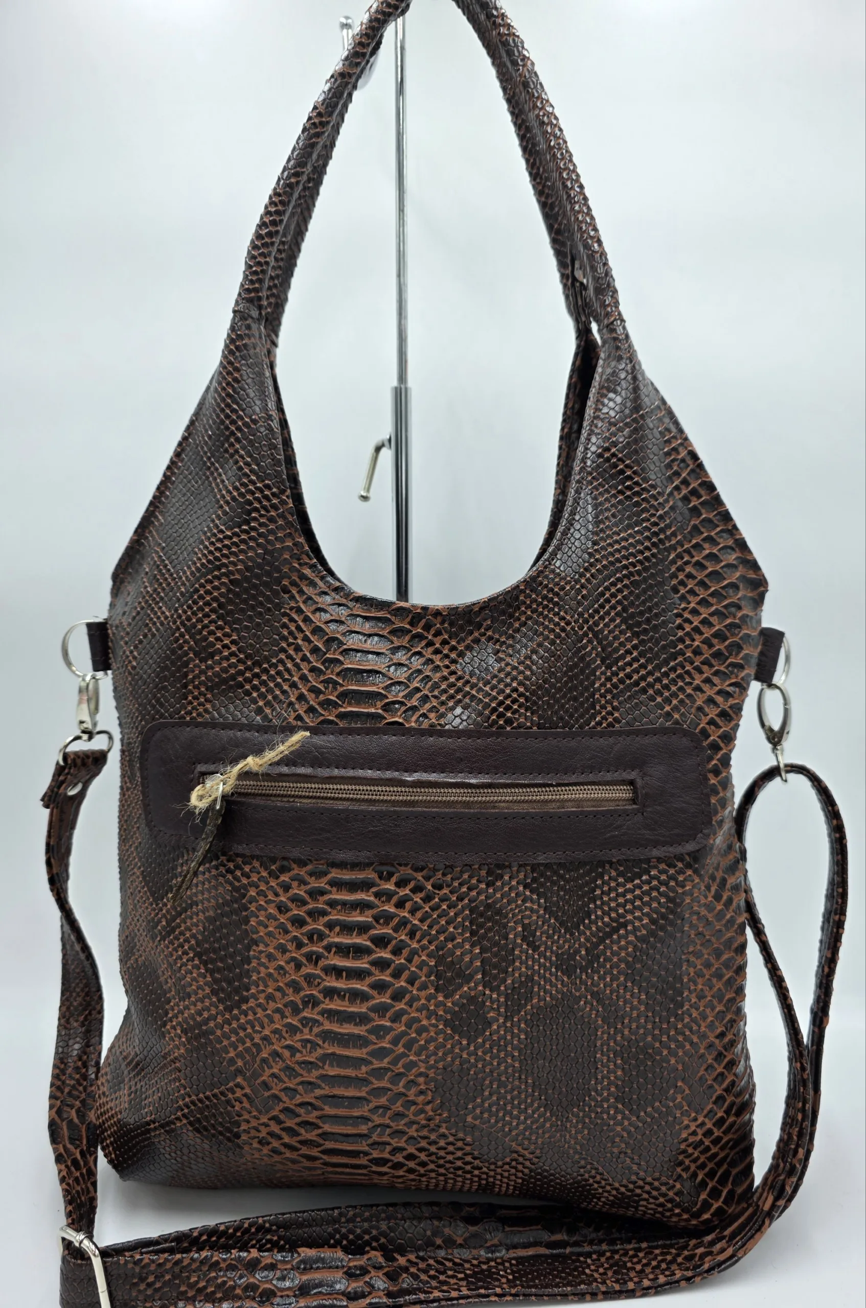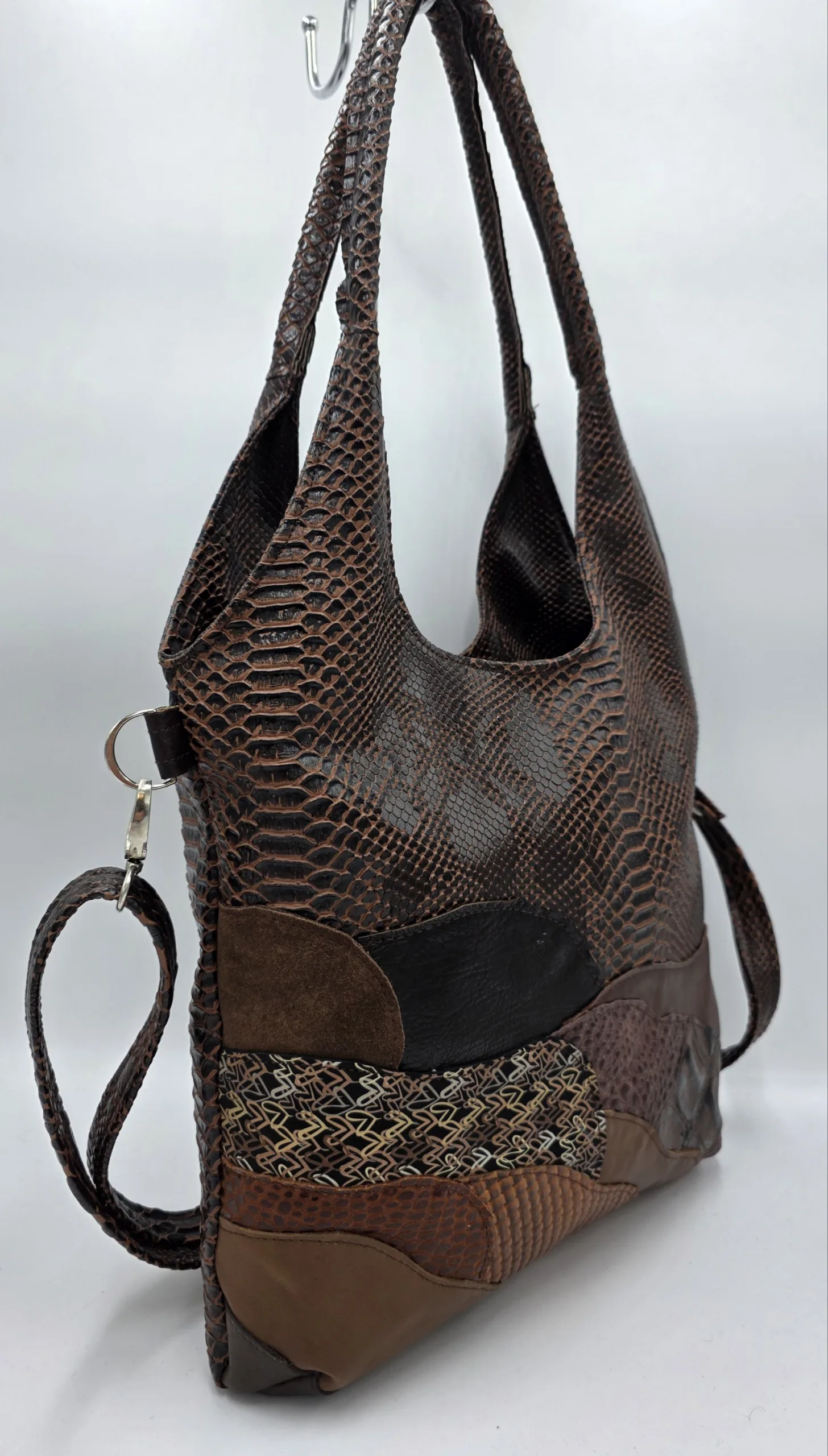 Чанта ръчна изработка от еко кожа с елементи от естествена кожа с две дръжки 65см и допълнителна дълга регулираща се дръжка 150см, с външен заден джоб с цип 20см,вътре със средна преграда с цип ,вътрешен джоб с цип и допълнителен джоб за телефон. Ширина 32см,височина 30см,без оформено дъно