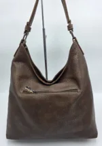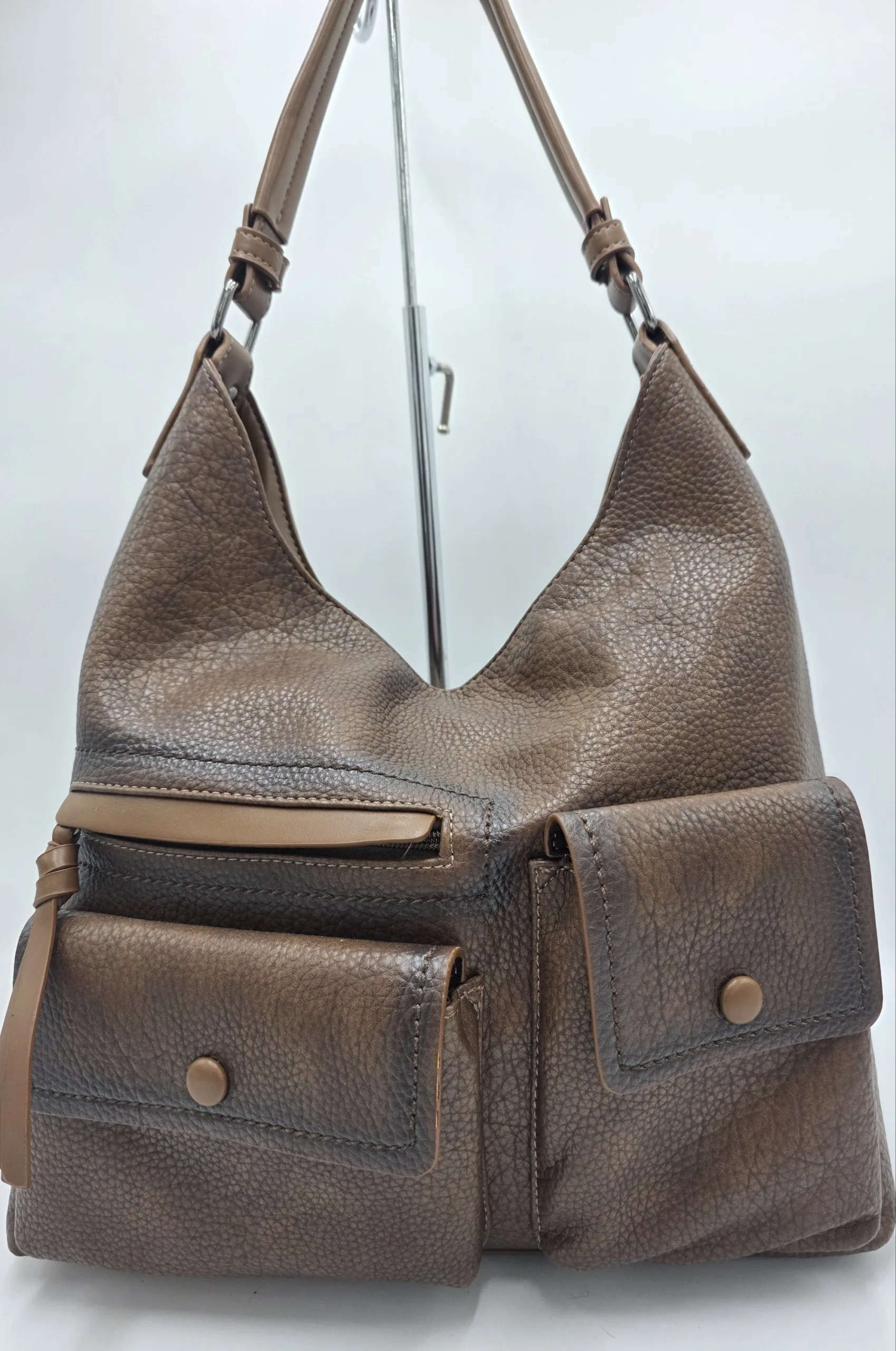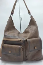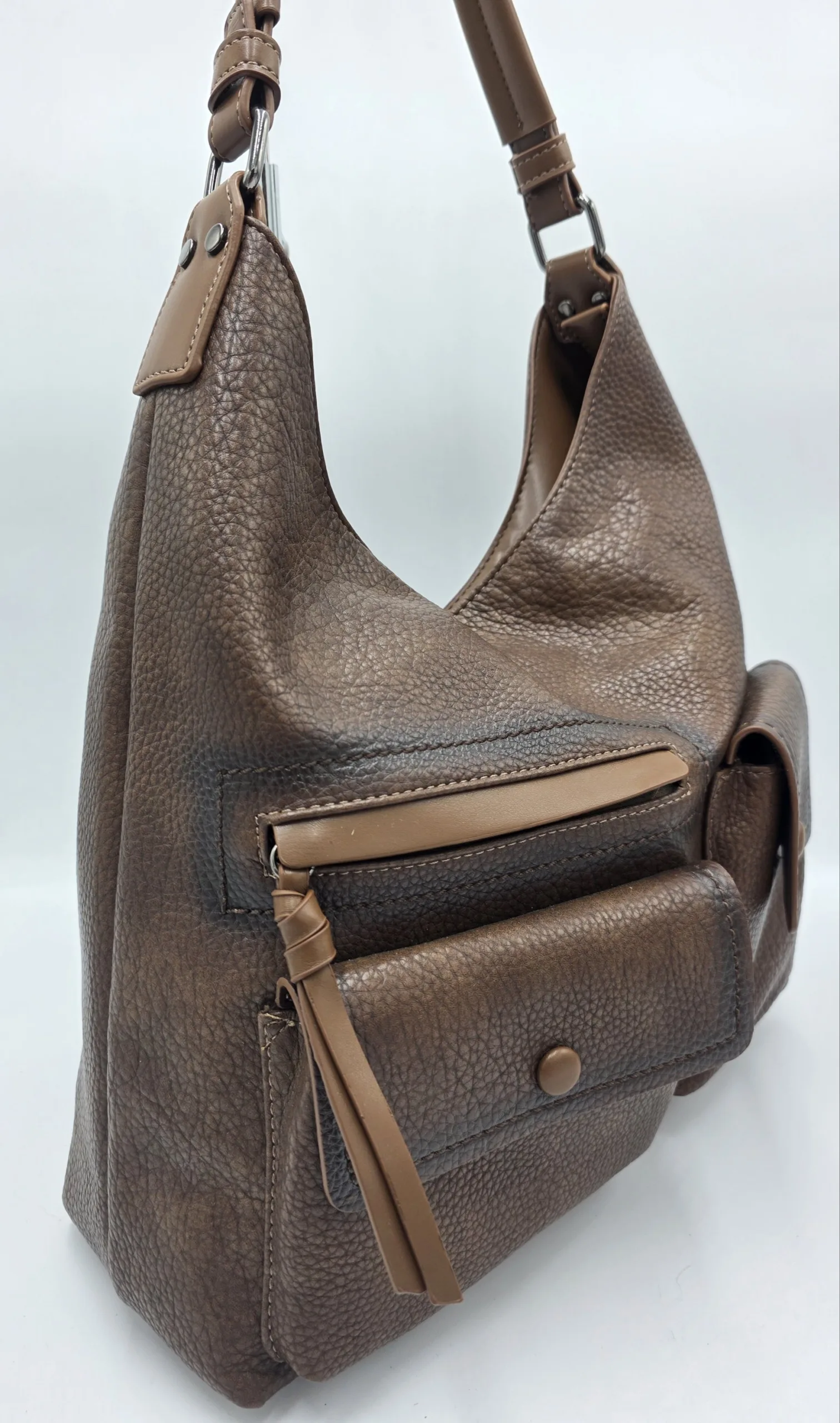 Чанта от еко кожа с една дръжка 44см и допълнителна дълга регулираща се дръжка, с три предни външни джоба,заден външен джоб с цип, вътре със средна преграда с цип,вътрешен джоб с цип и допълнителни джобове за телефон. Ширина 36см,височина 29см,дъно 35см/11см.