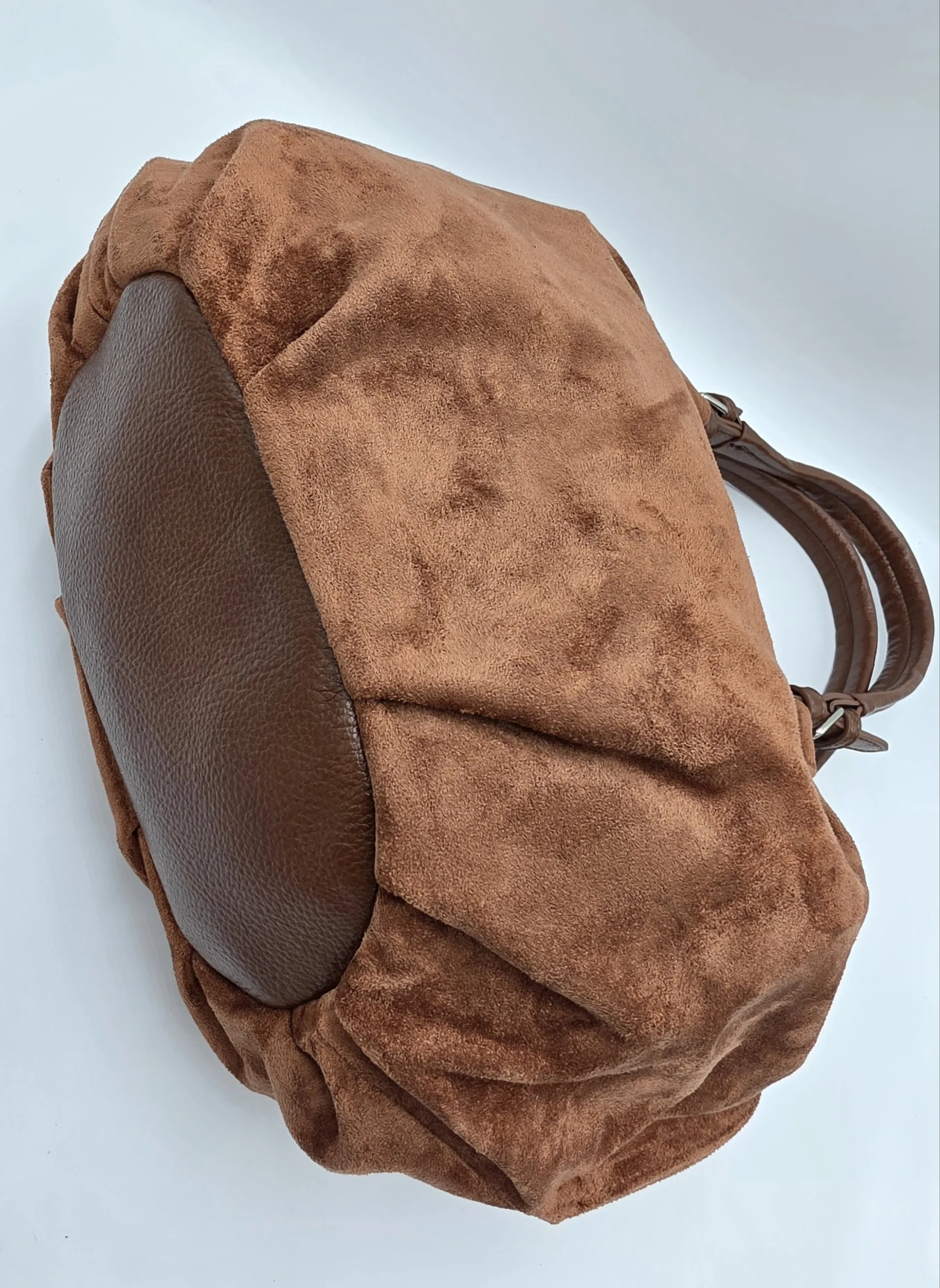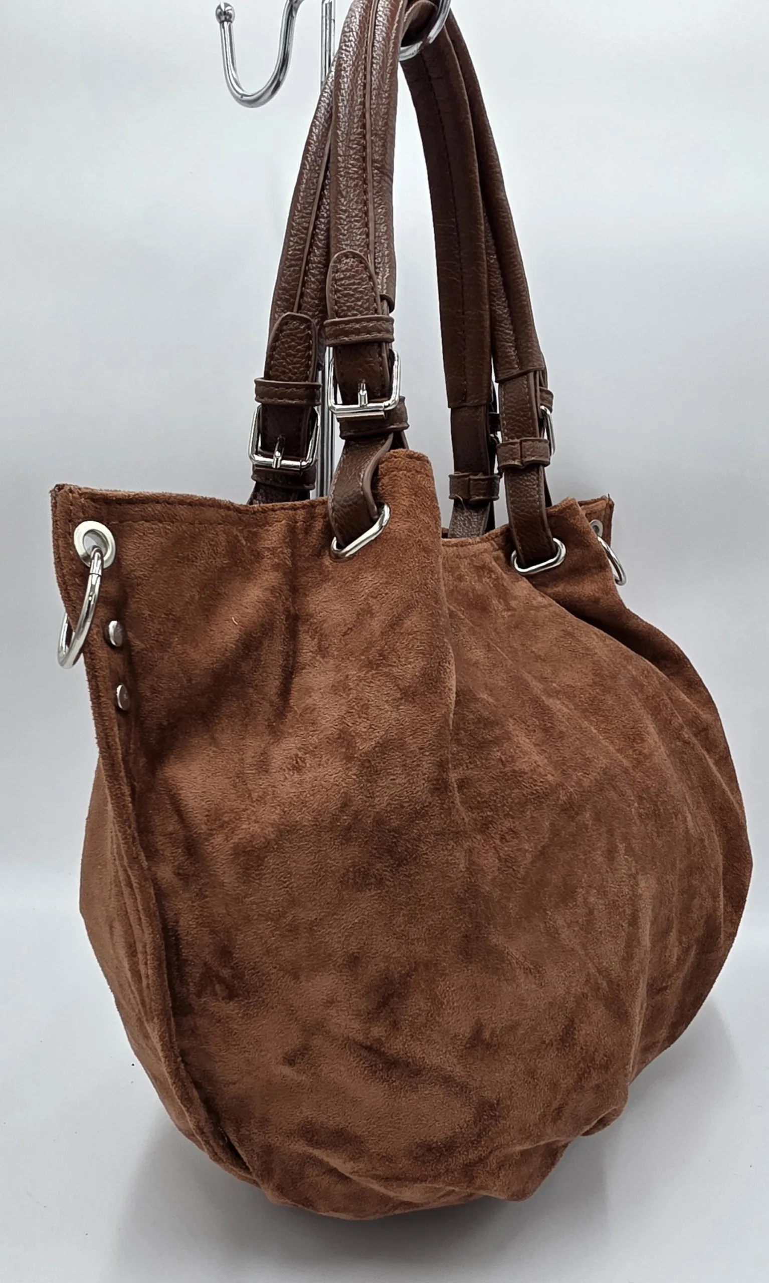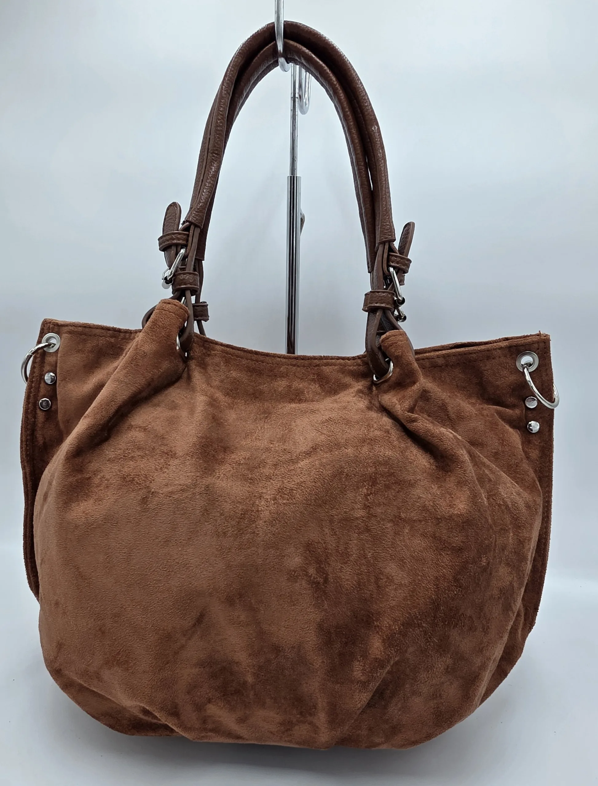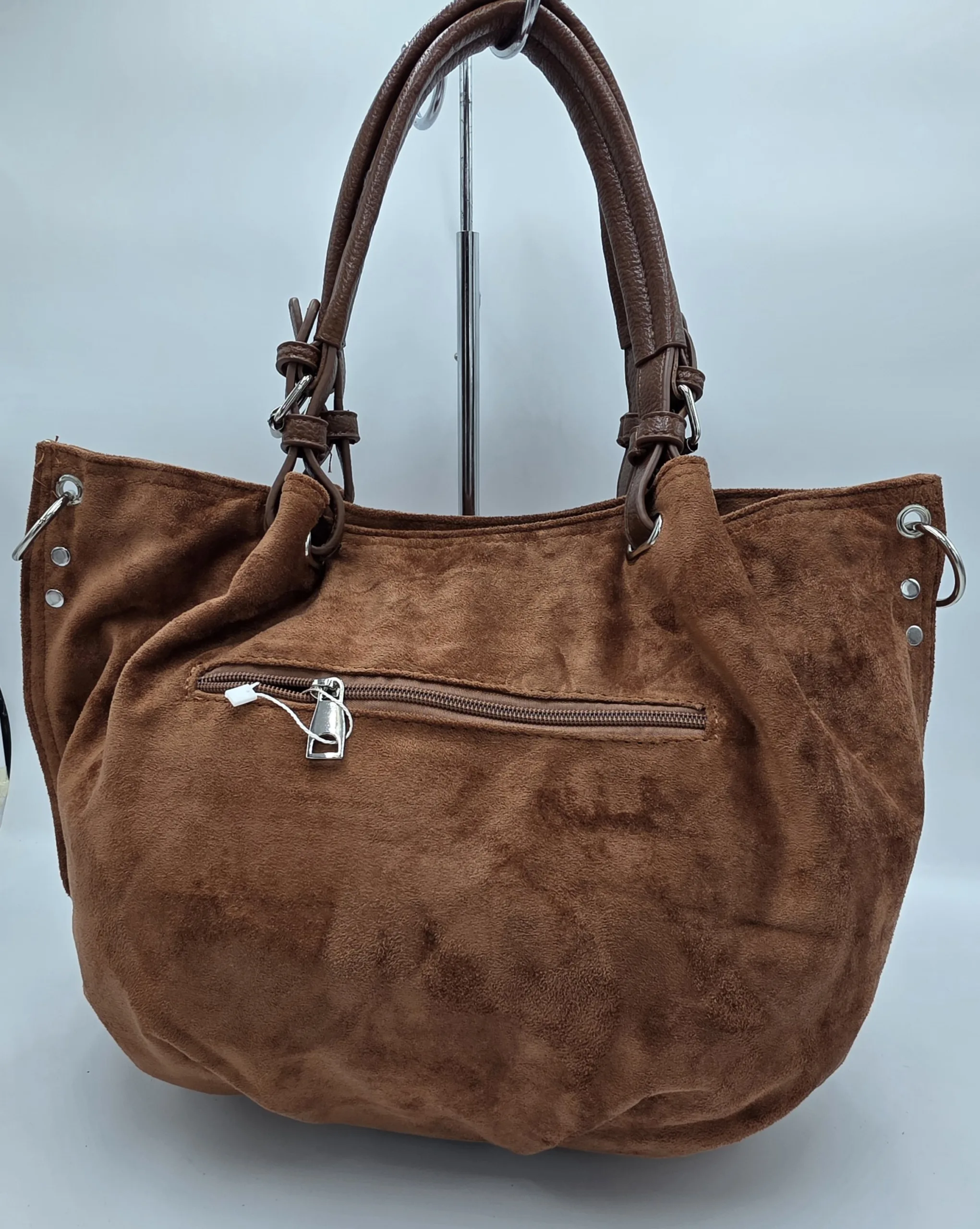 Чанта от еко велур с две къси дръжки 54см,допълнителна дълга регулираща се дръжка, външен заден джоб с цип, вътре с средна преграда с цип, вътрешен джоб с цип и допълнителни джобове за телефон.Ширина 48см,височина 30см,овално дъно 22см/11см.