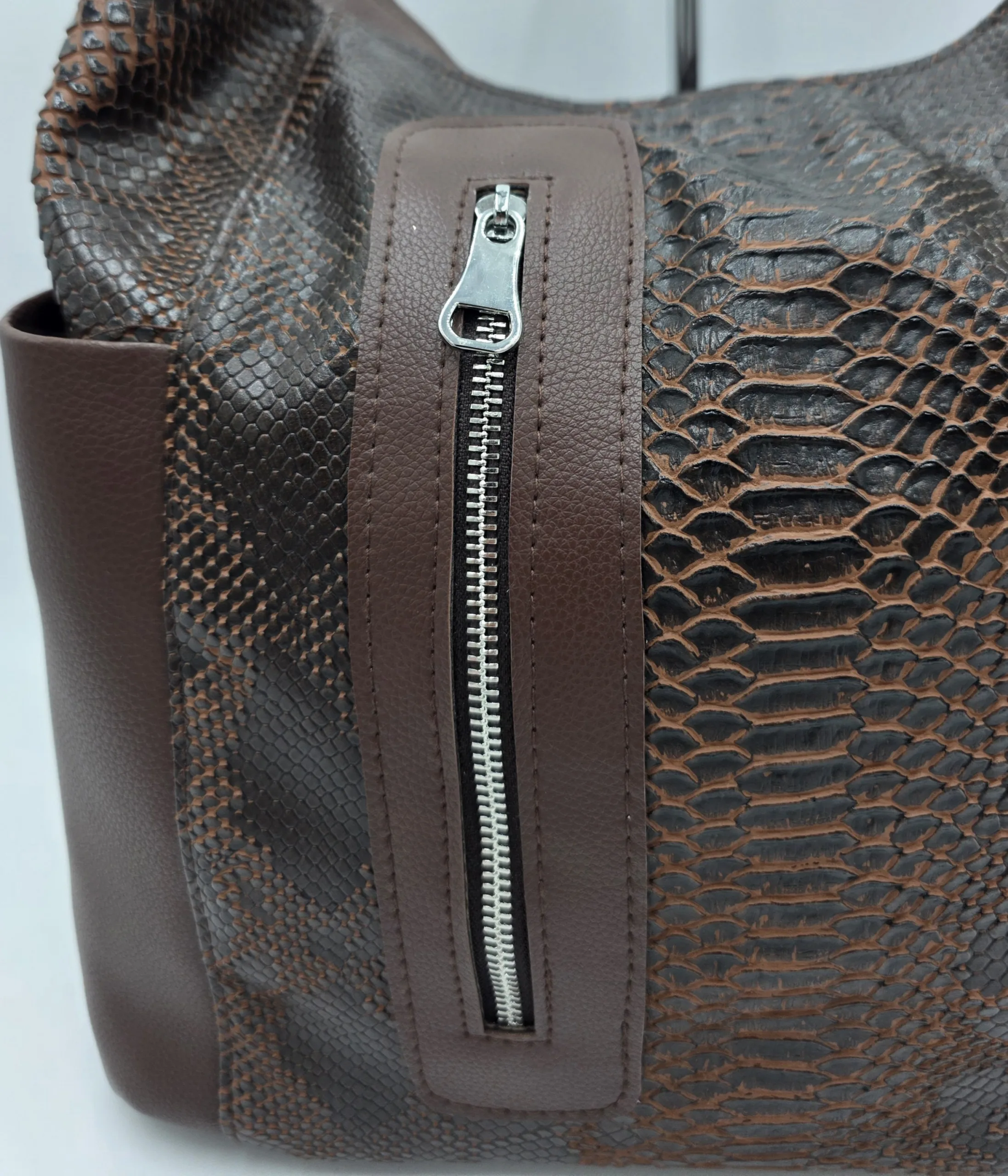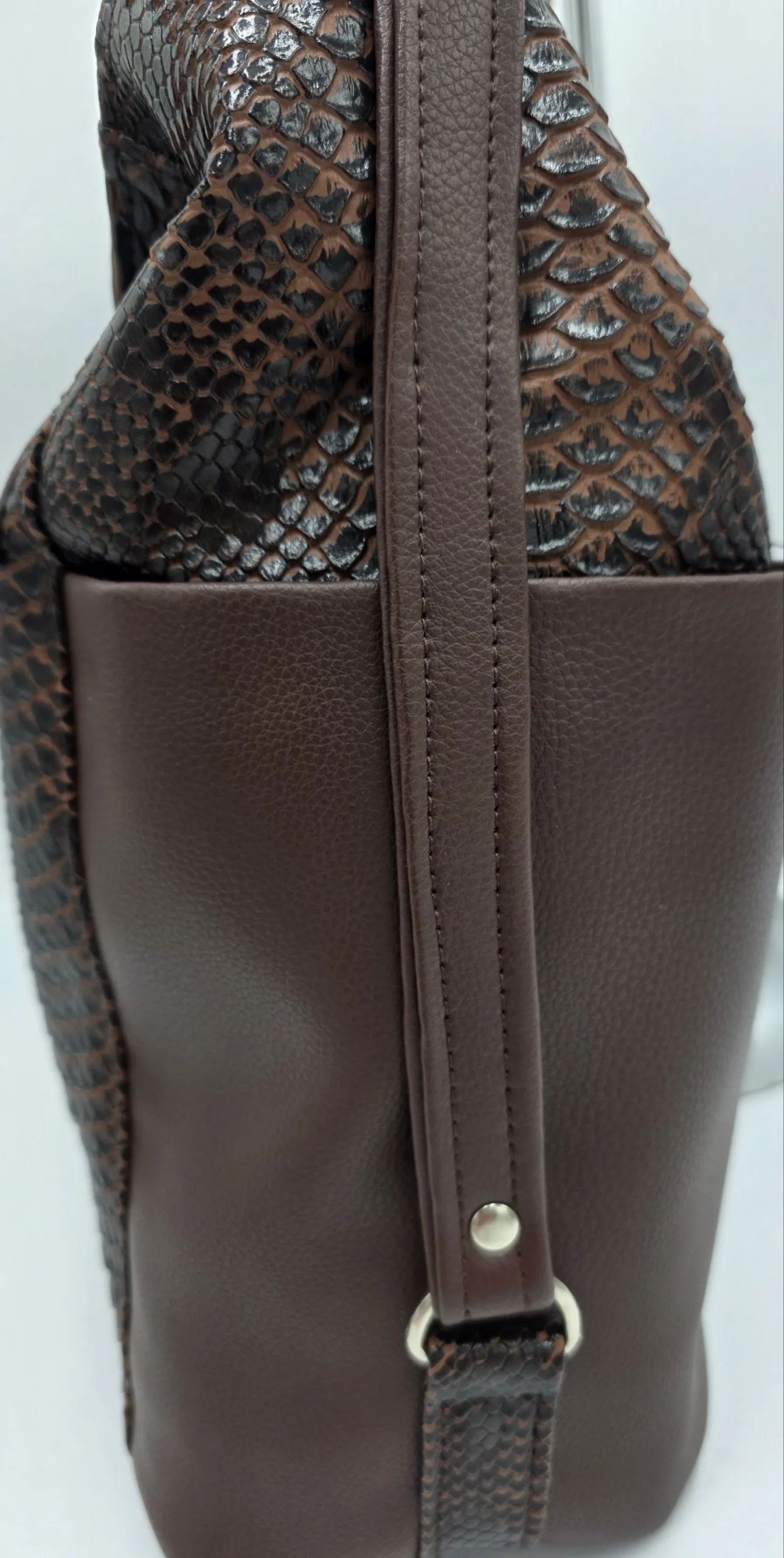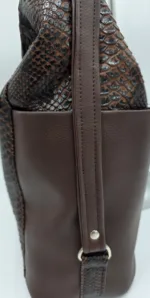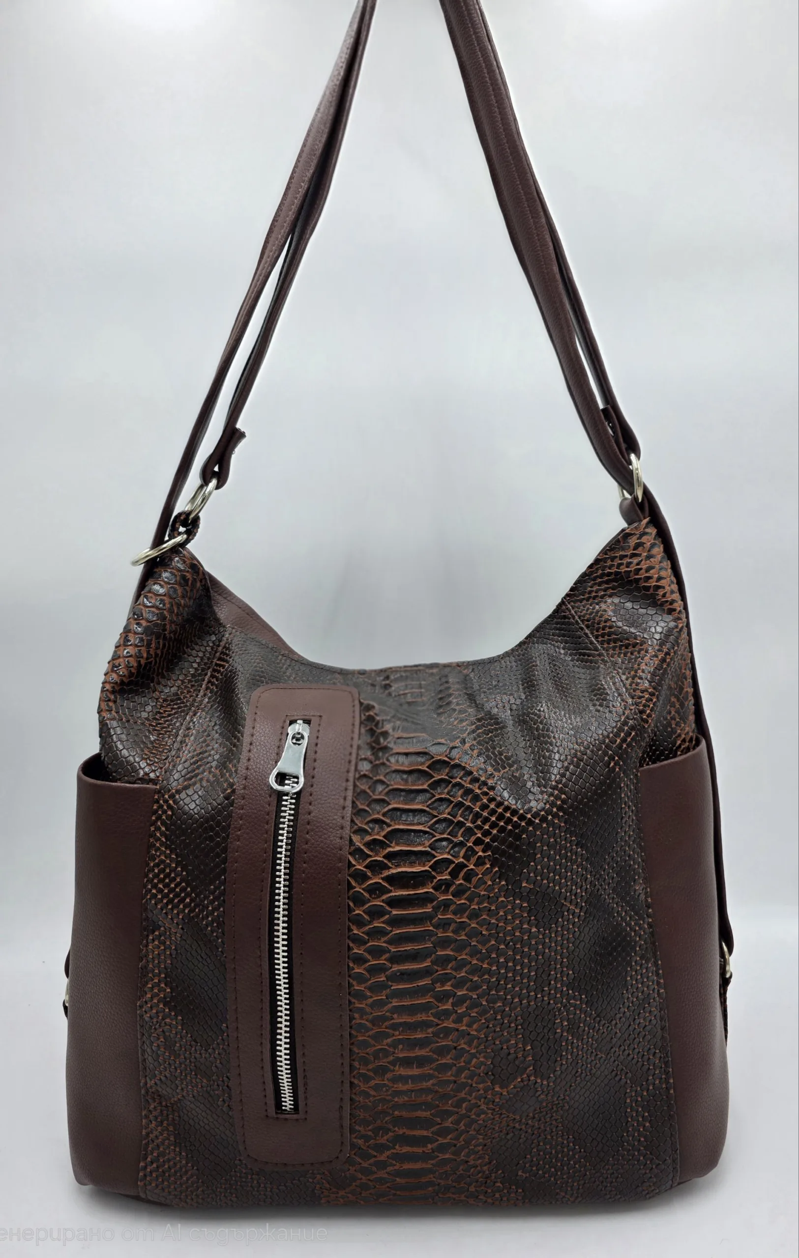 Уникална чанта раница от еко кожа с лице от естествена кожа, две дръжки дължина 90см,външен заден джоб с цип, вътре