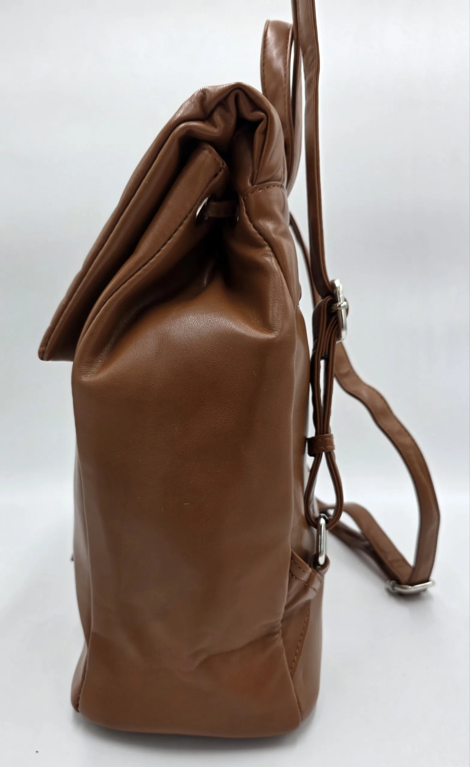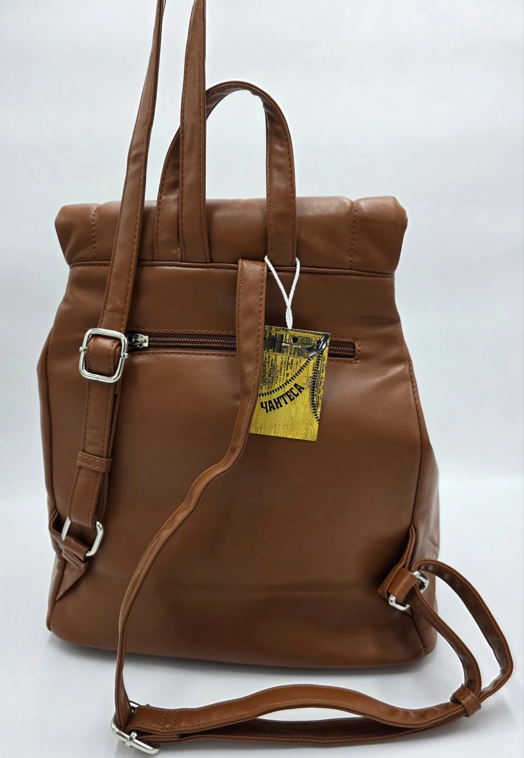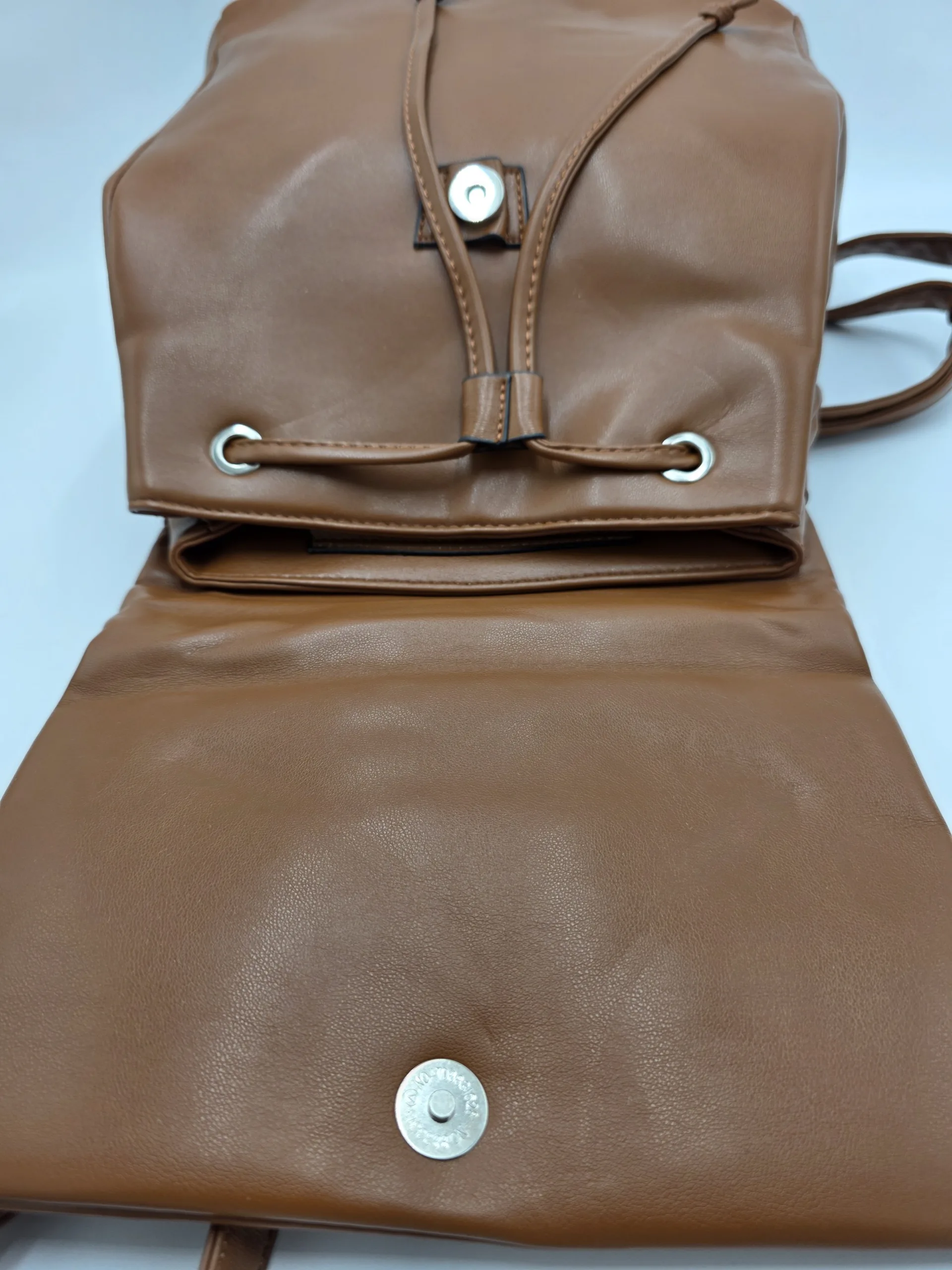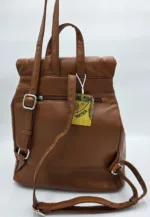 Раница от еко кожа с капак и връзки под капака, външен заден джоб с цип, вътрешен джоб с цип и допълнителни джобове за телефон. Височина 33см,ширина 30см,дъно 30см/14см.