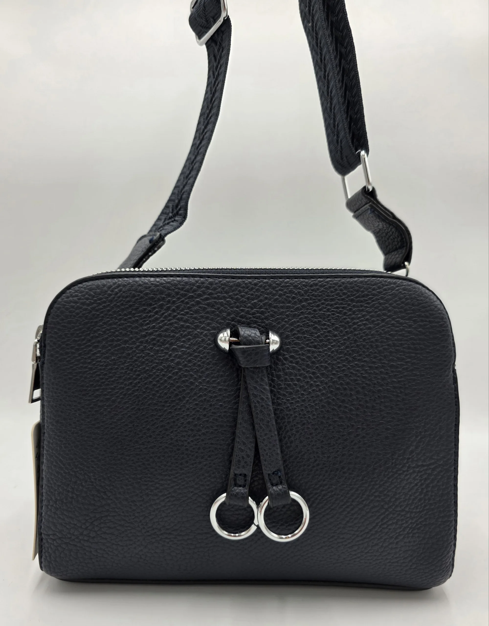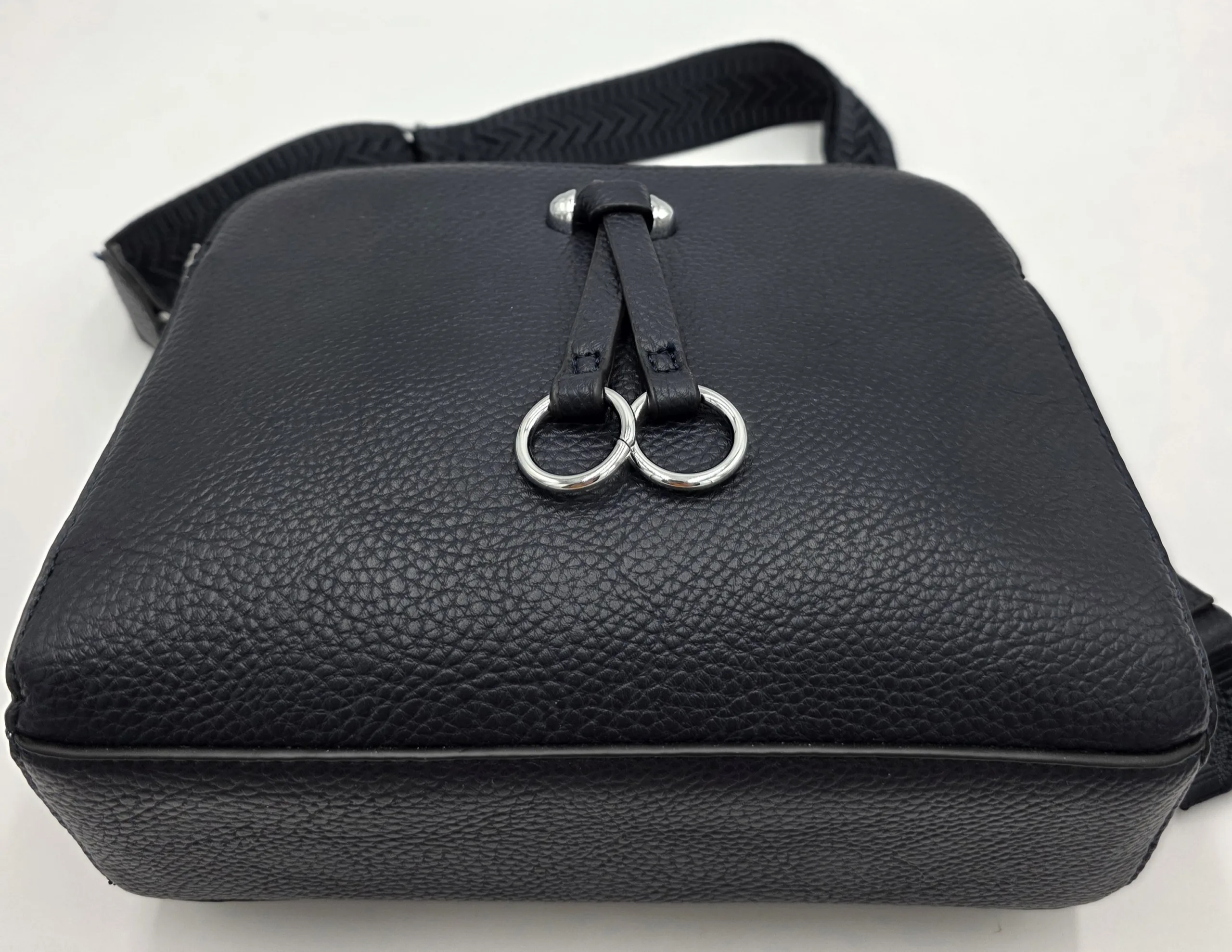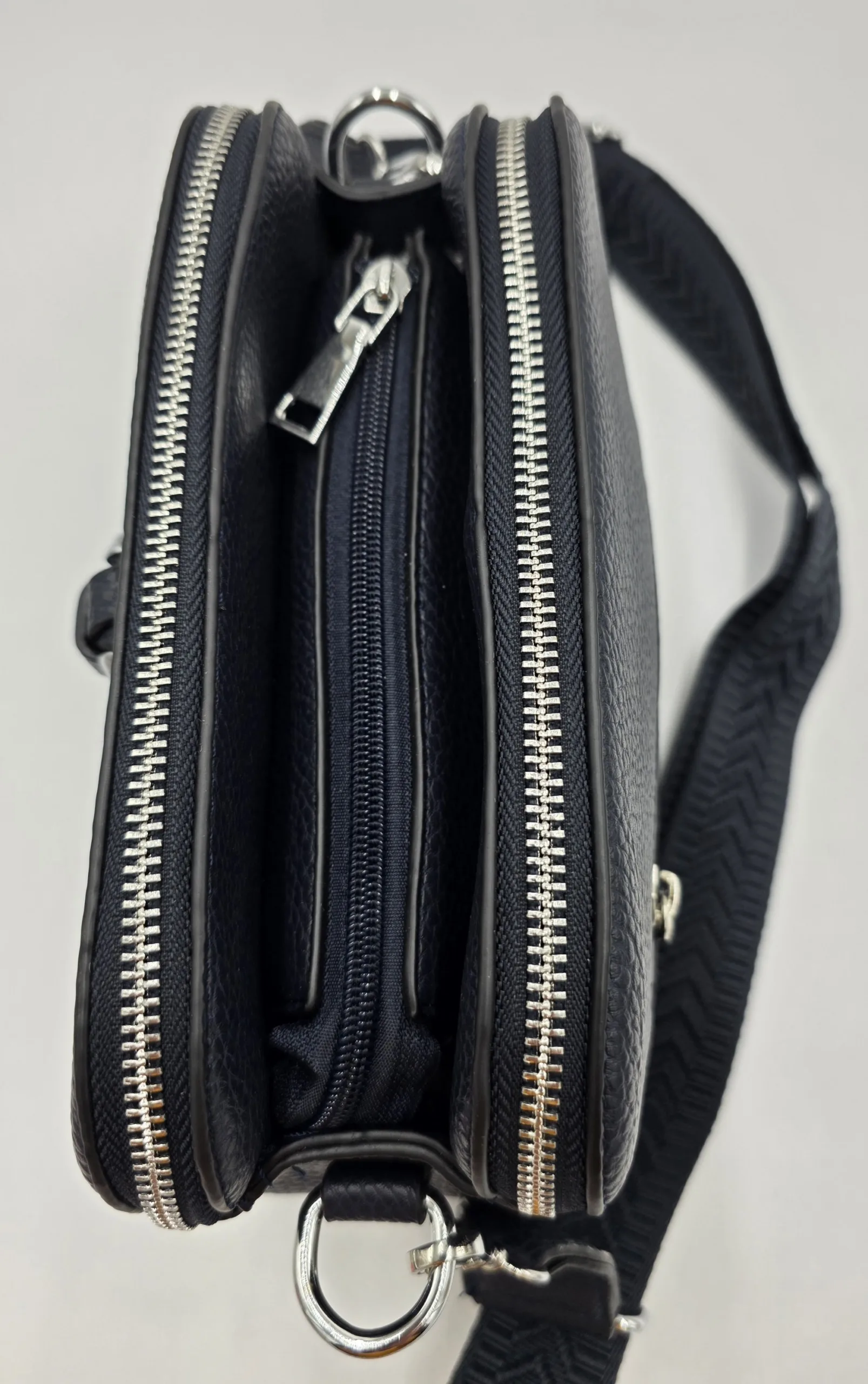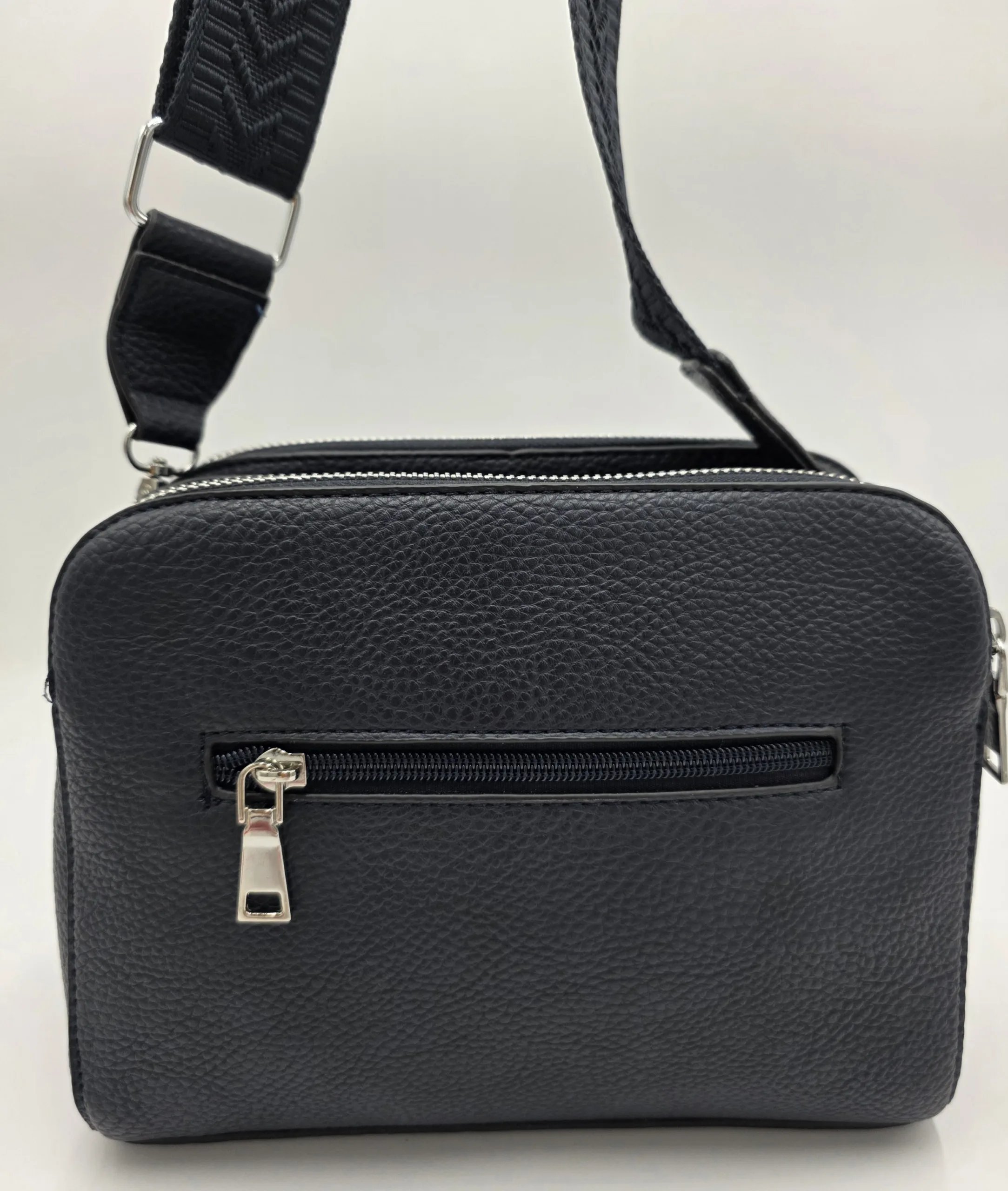 Малка чанта от еко кожа с три отделни прегради затварящи се с цип, заден външен джоб с цип, вътрешен джоб с цип и допълнителни джобове за телефон, дълга текстилна регулираща се дръжка 150см. Ширина 24см, височина 18см,дъно 24см/7см.