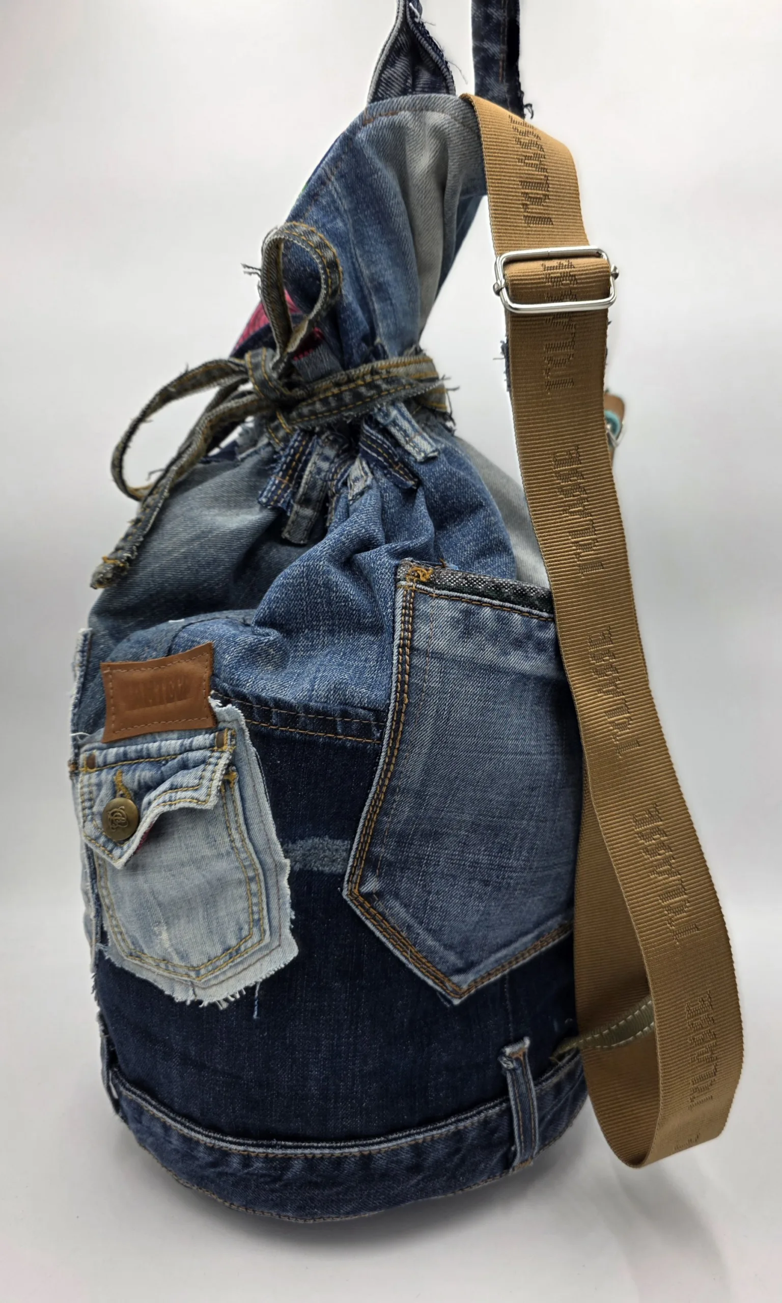 Дизайнерска раница/тип мешка/изработена от естествени материали. Обло дъно 24см,височина 45см,стабилни презрамки от текстил, множество външни и вътрешни джобове,затваряне с връзка.
