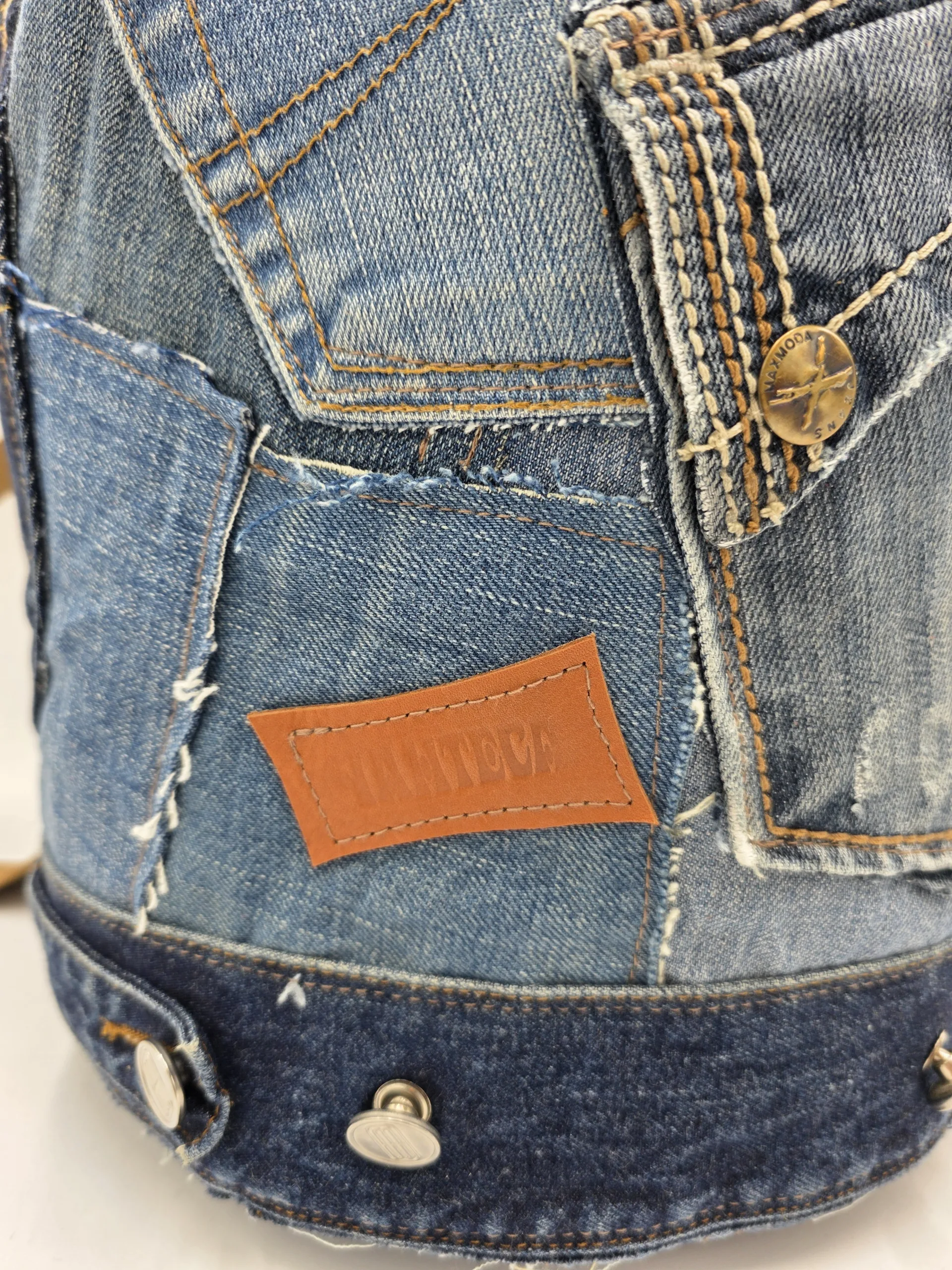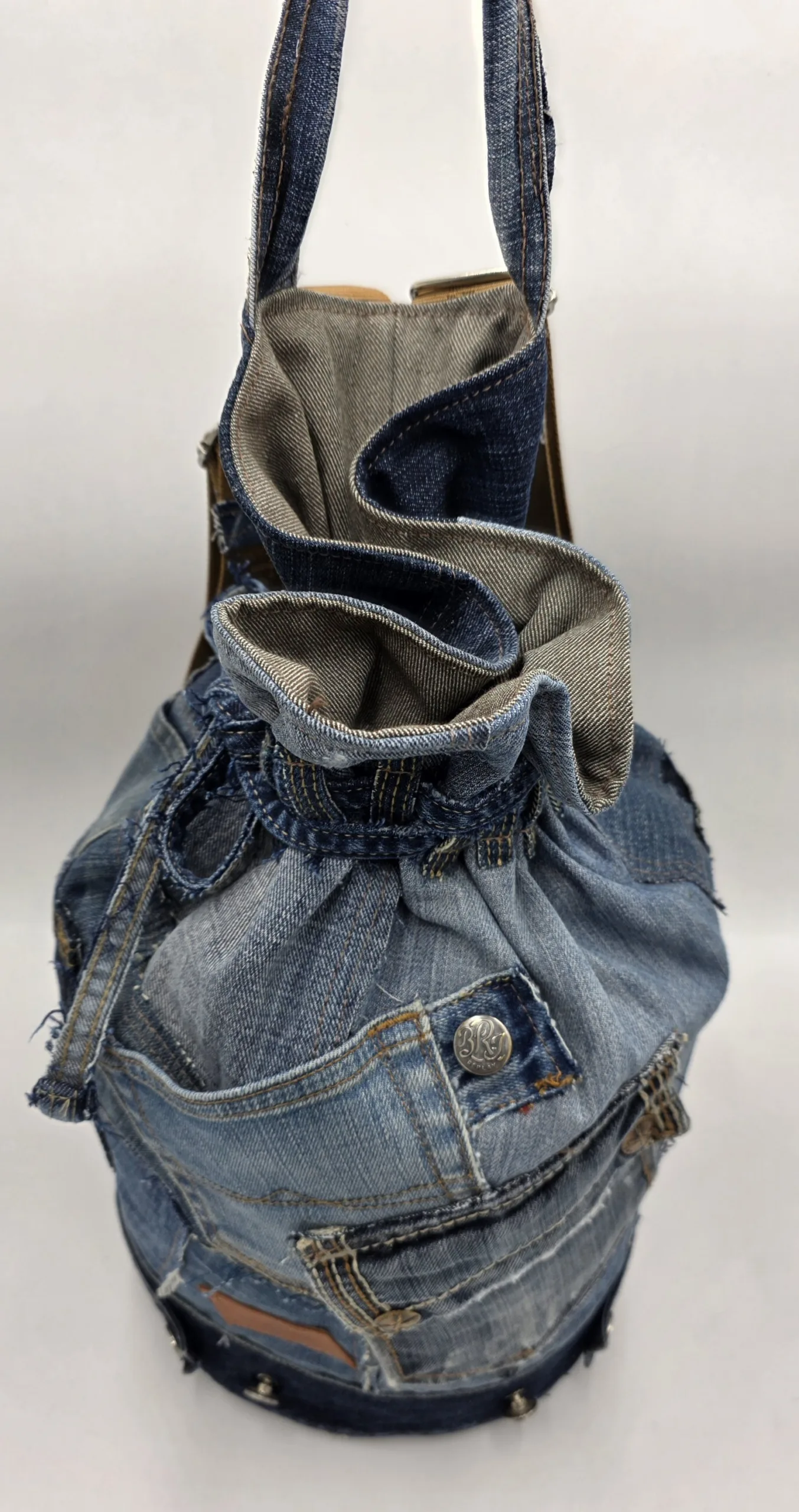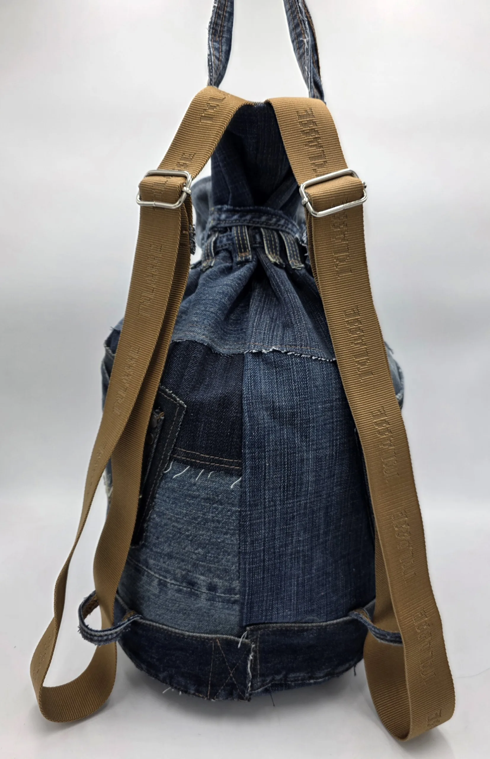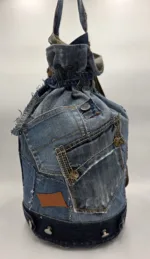 Дизайнерска раница/тип мешка/изработена от естествени материали. Обло дъно 24см,височина 45см,стабилни презрамки от текстил, множество външни и вътрешни джобове,затваряне с връзка.