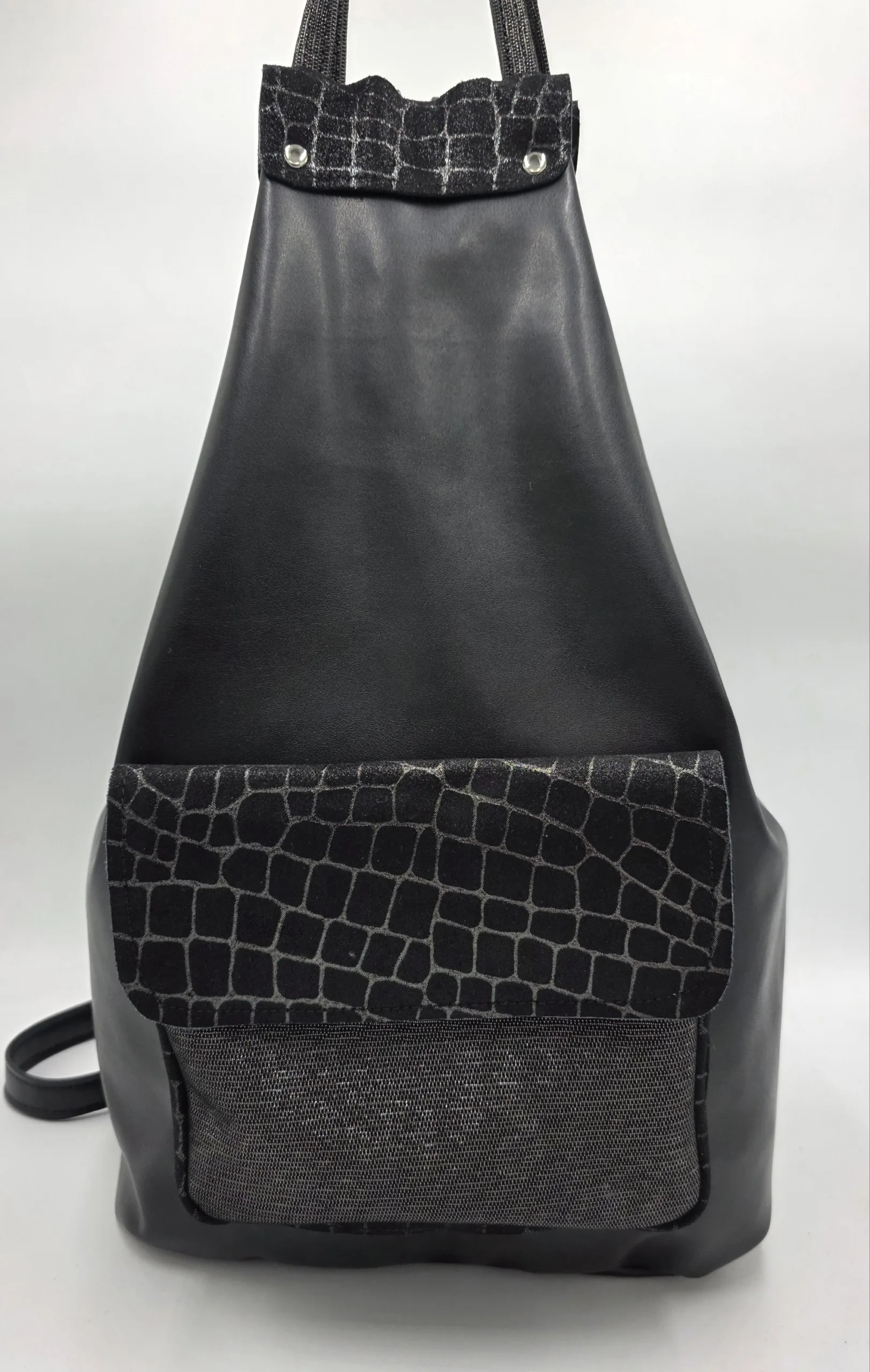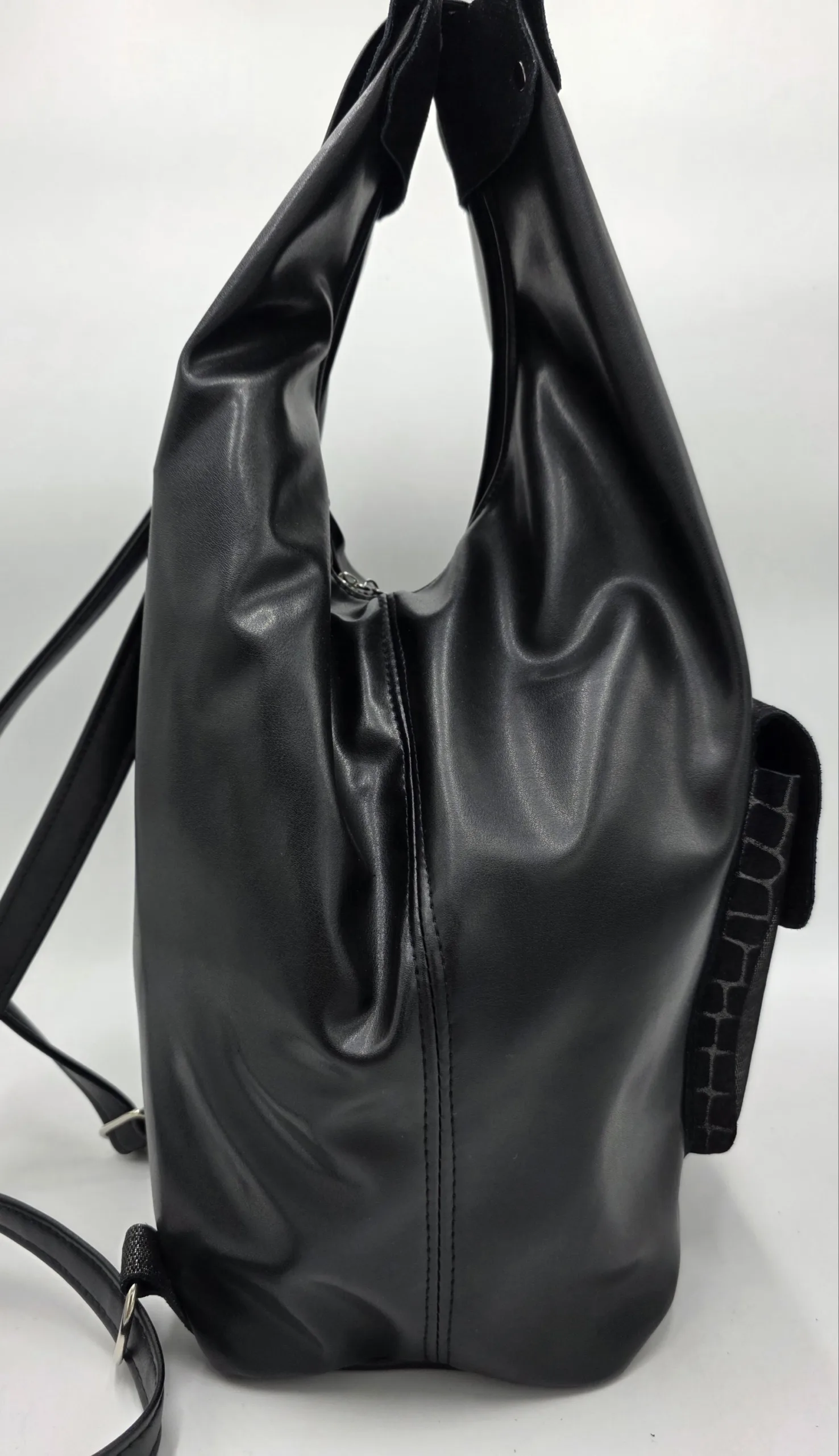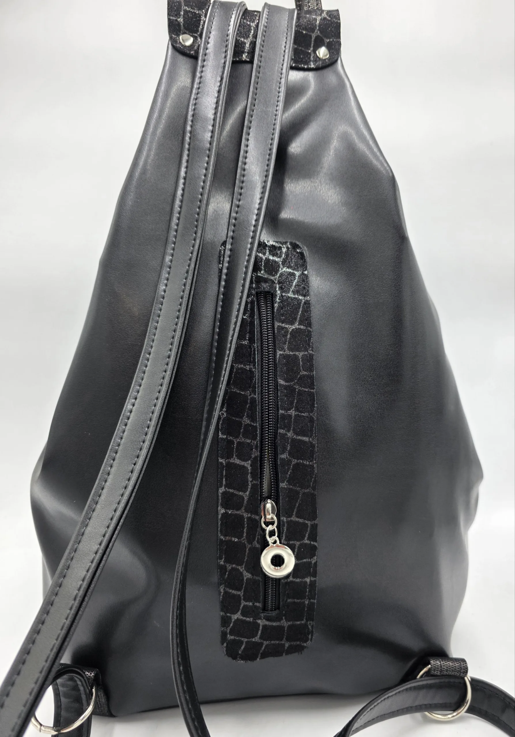 Уникална чанта раница от еко кожа с лице от естествена кожа, две дръжки дължина 90см,външен заден джоб с цип, вътре