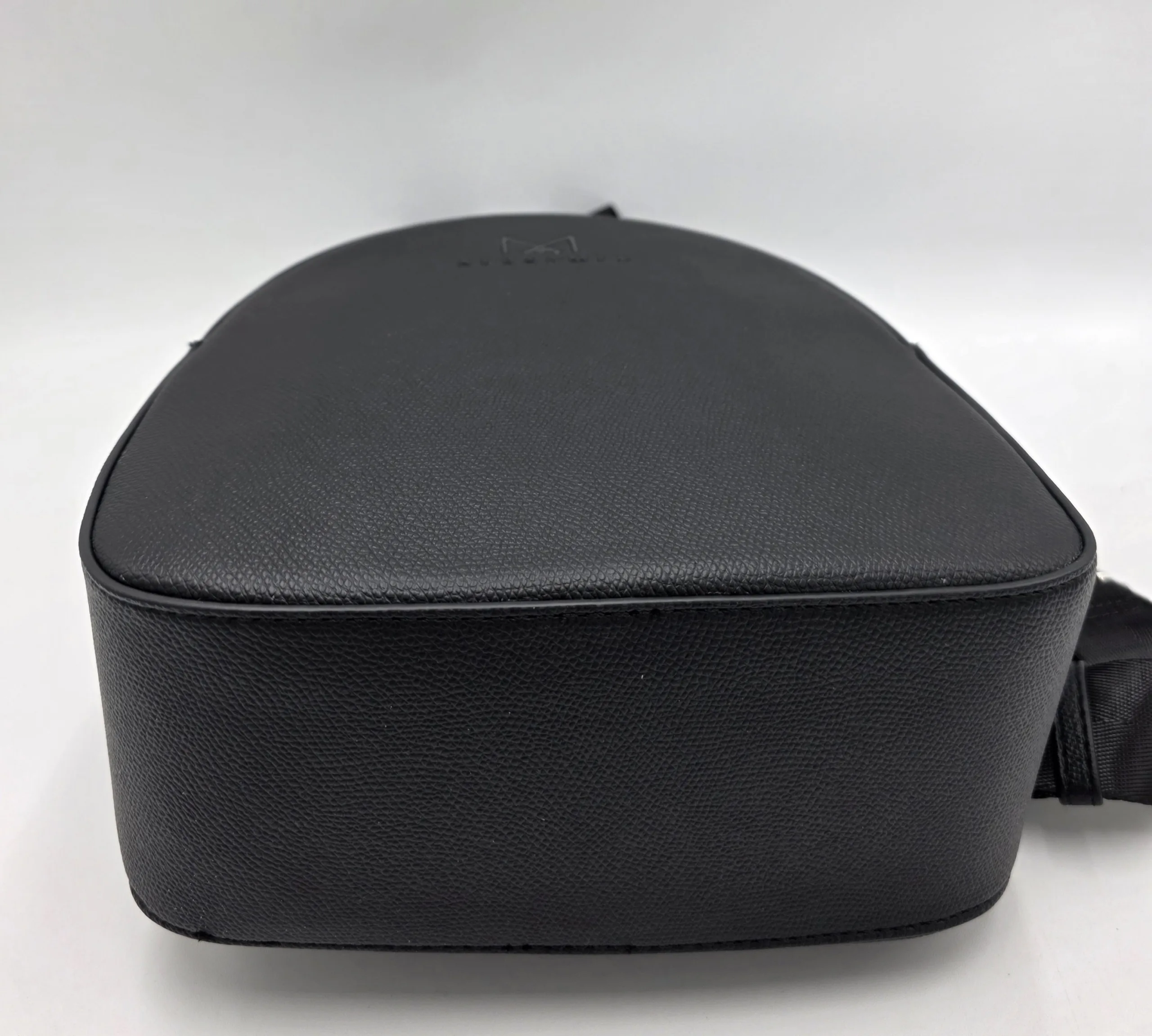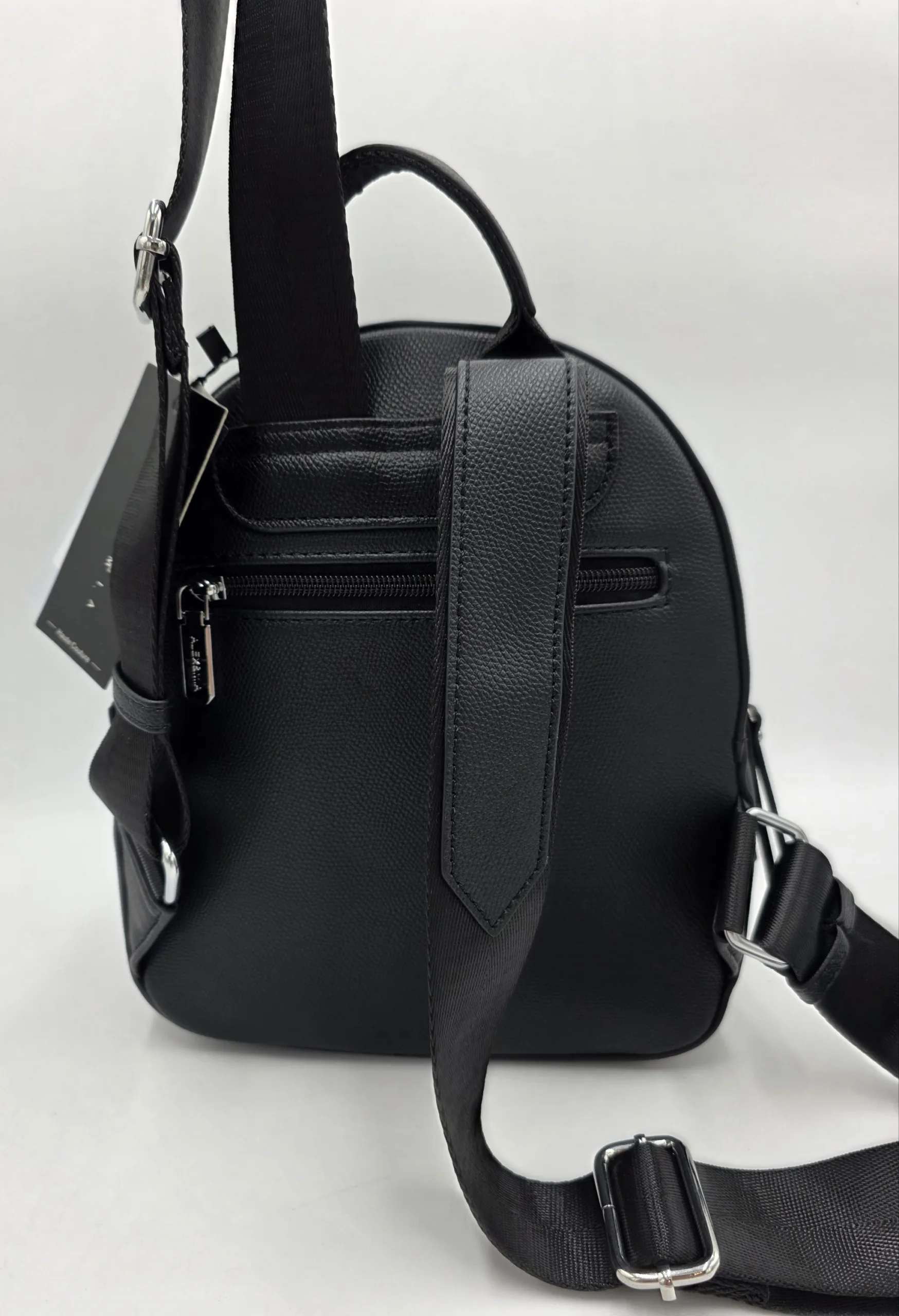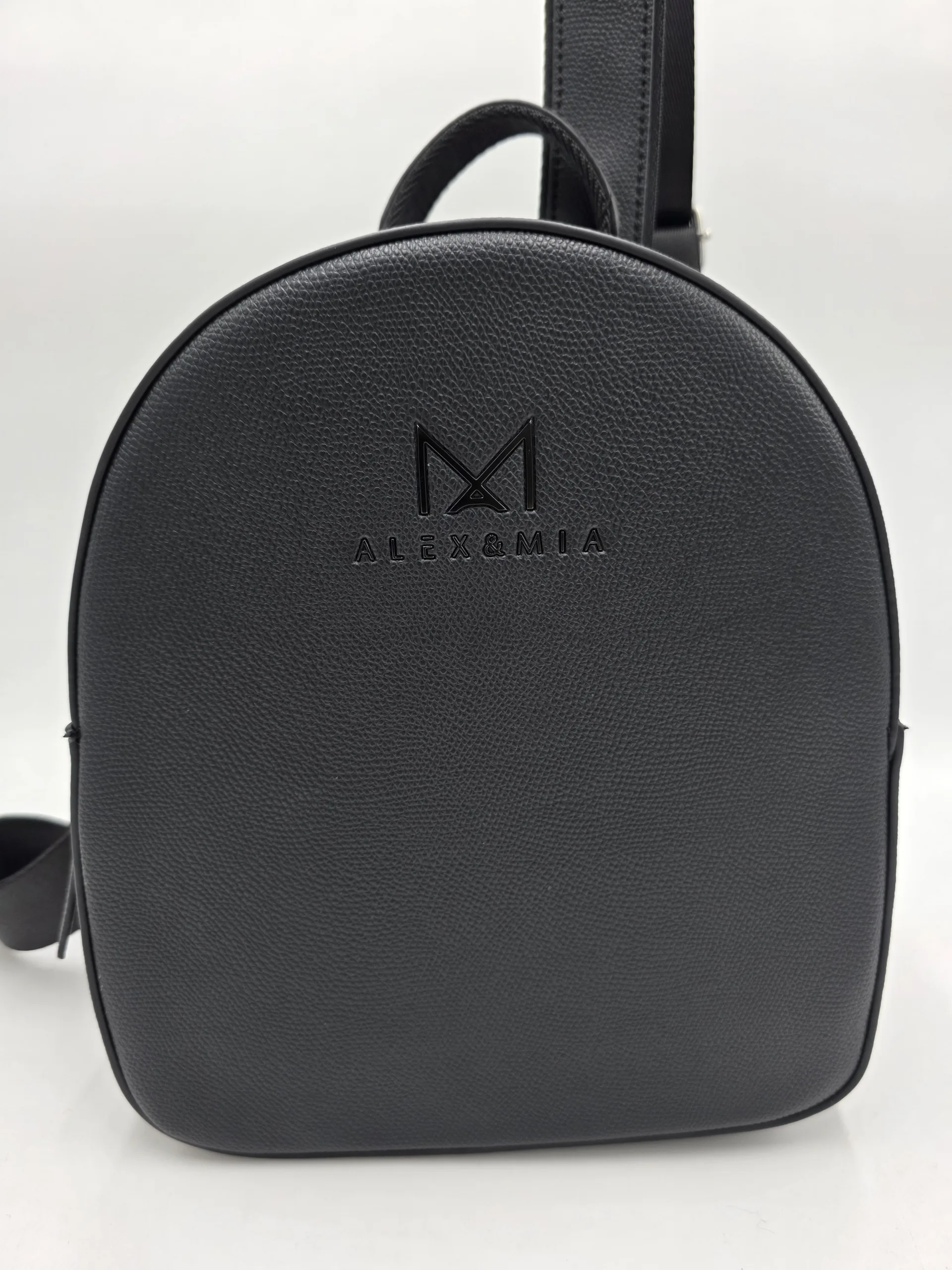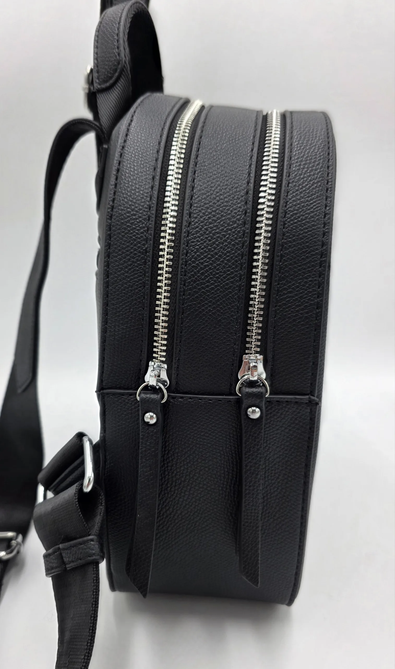 Твърда раница от еко кожа с две отделни прегради затварящи се с цип, заден външен джоб с цип, вътрешен джоб с цип и допълнителни джобове за телефон, текстилни презрамки, ширина 22см, височина 26см, дъно 22см/9см.