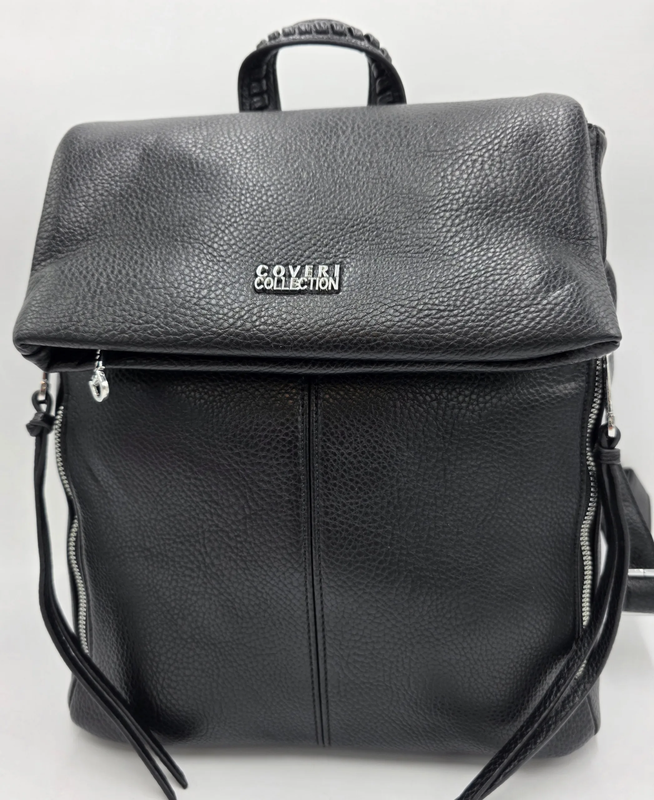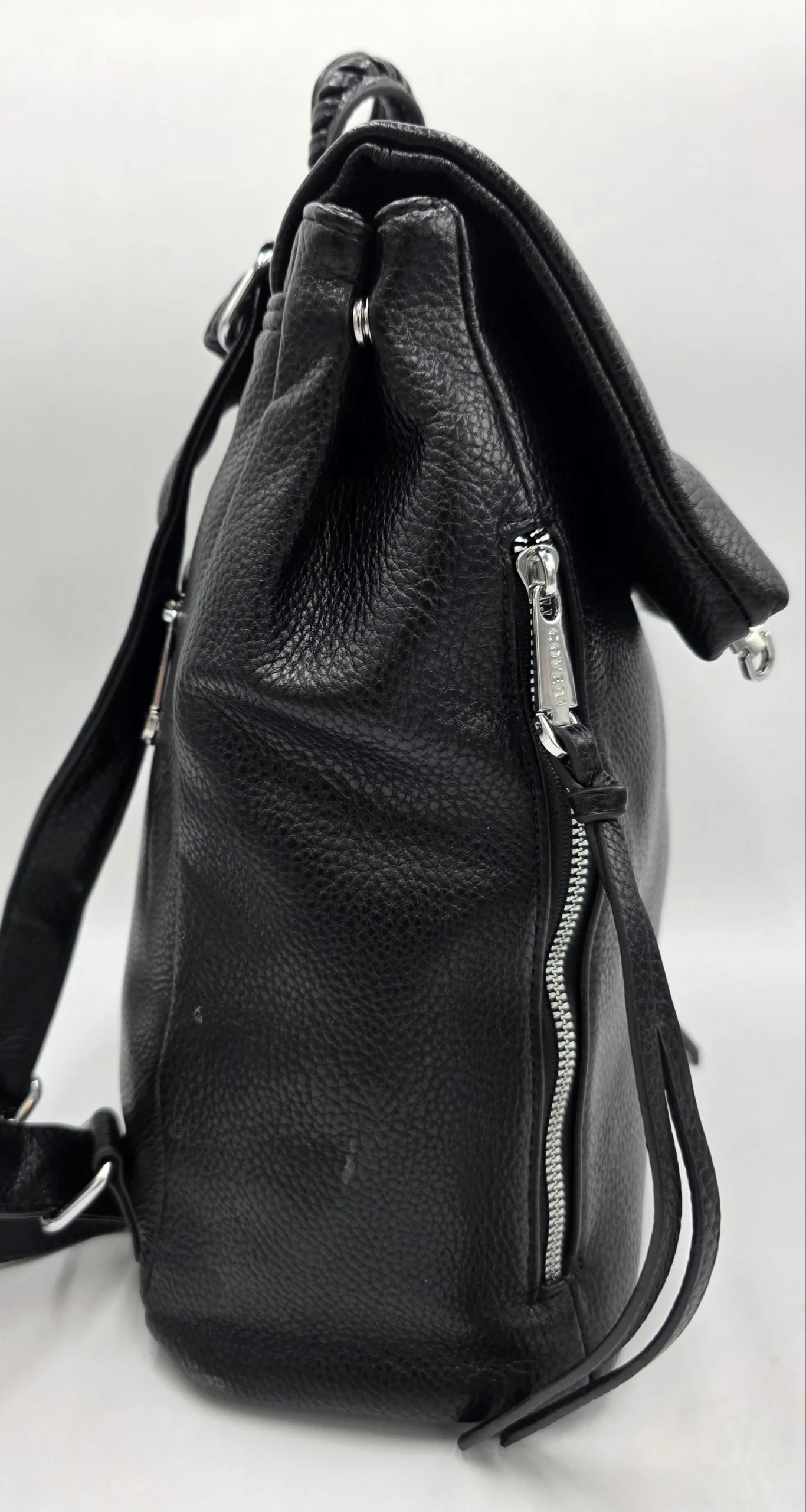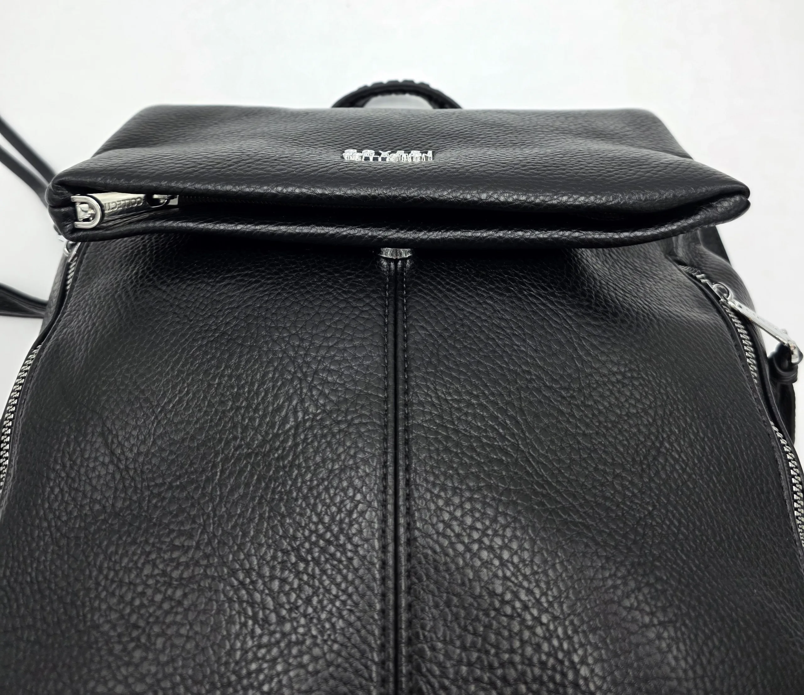 Раница от еко кожа с капак, джоб в капака,цип под него,три външни джоба с цип, вътрешен джоб с и допълнителни джобове за телефон. Ширина37см,височина 30см,дъно 29см/14см.