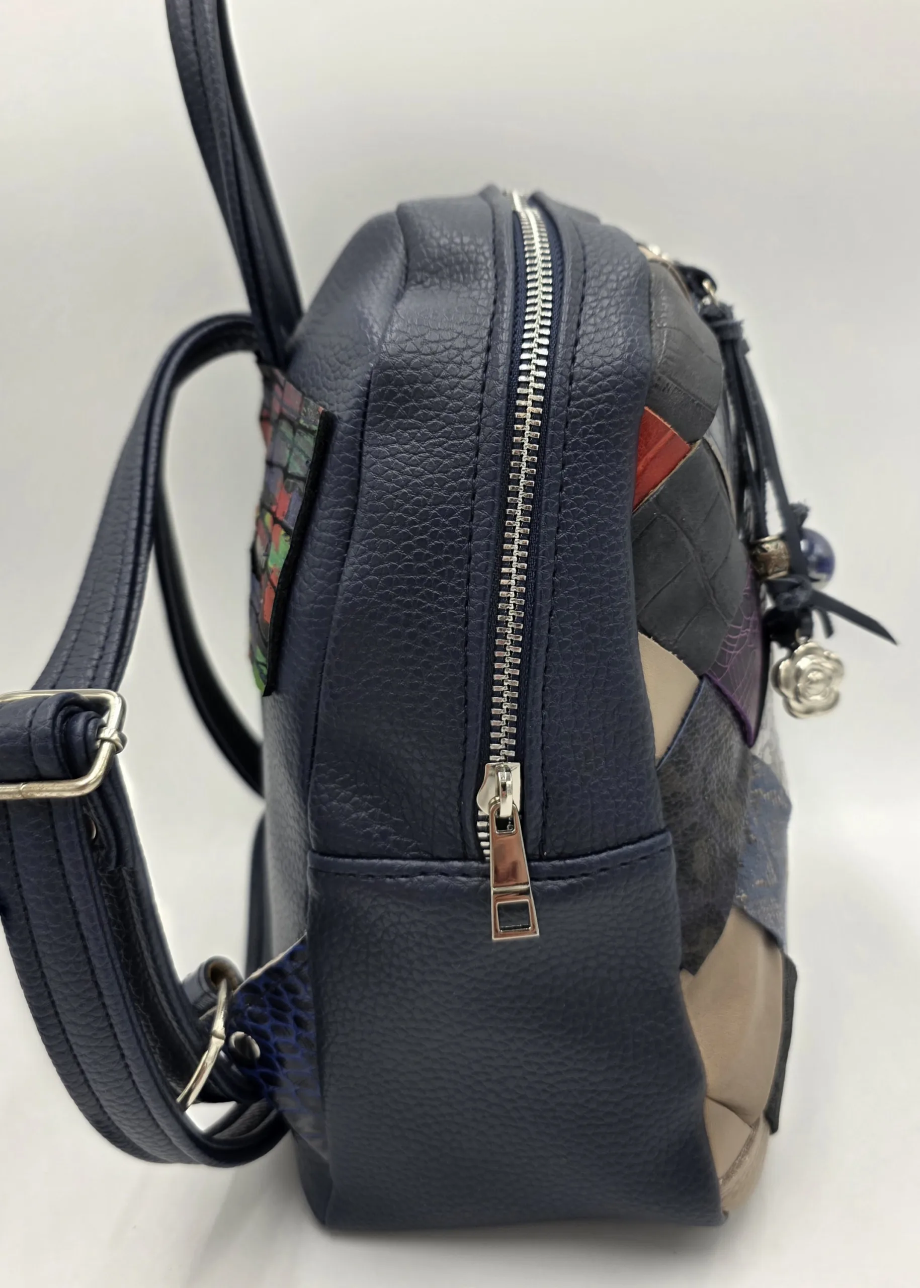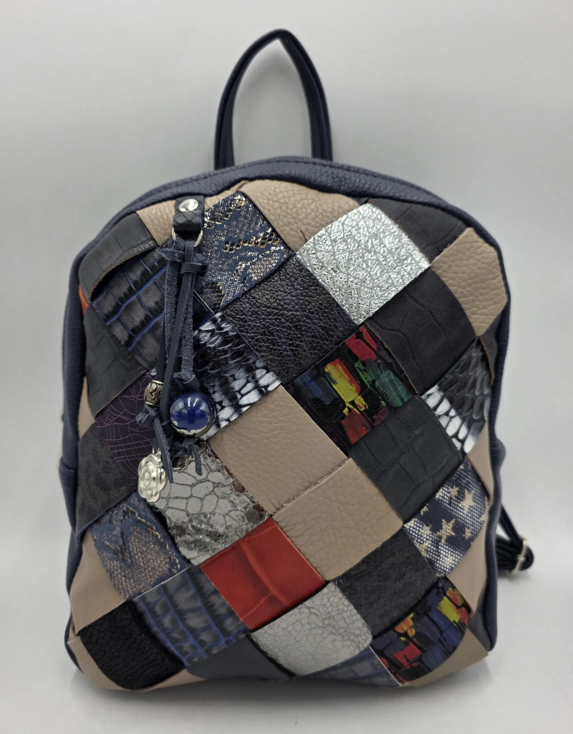 Дизайнерска раница от еко кожа, ръчно изработена, предница от естествена кожа, заден външен джоб, закопчаване с цип, вътрешен джоб с цип и допълнителен джоб за телефон ,височина 26см, ширина 25см, дъно 23см/11см.
