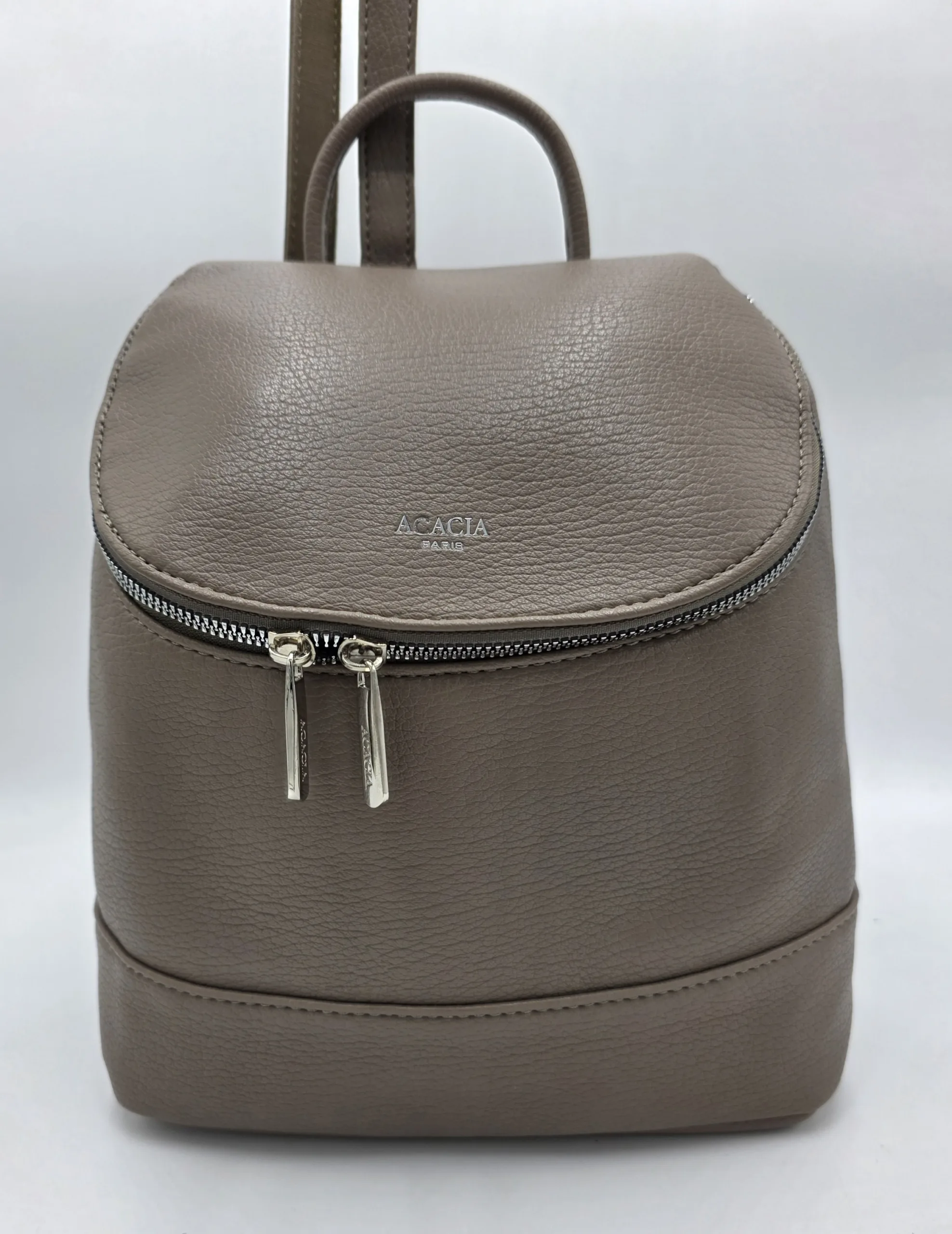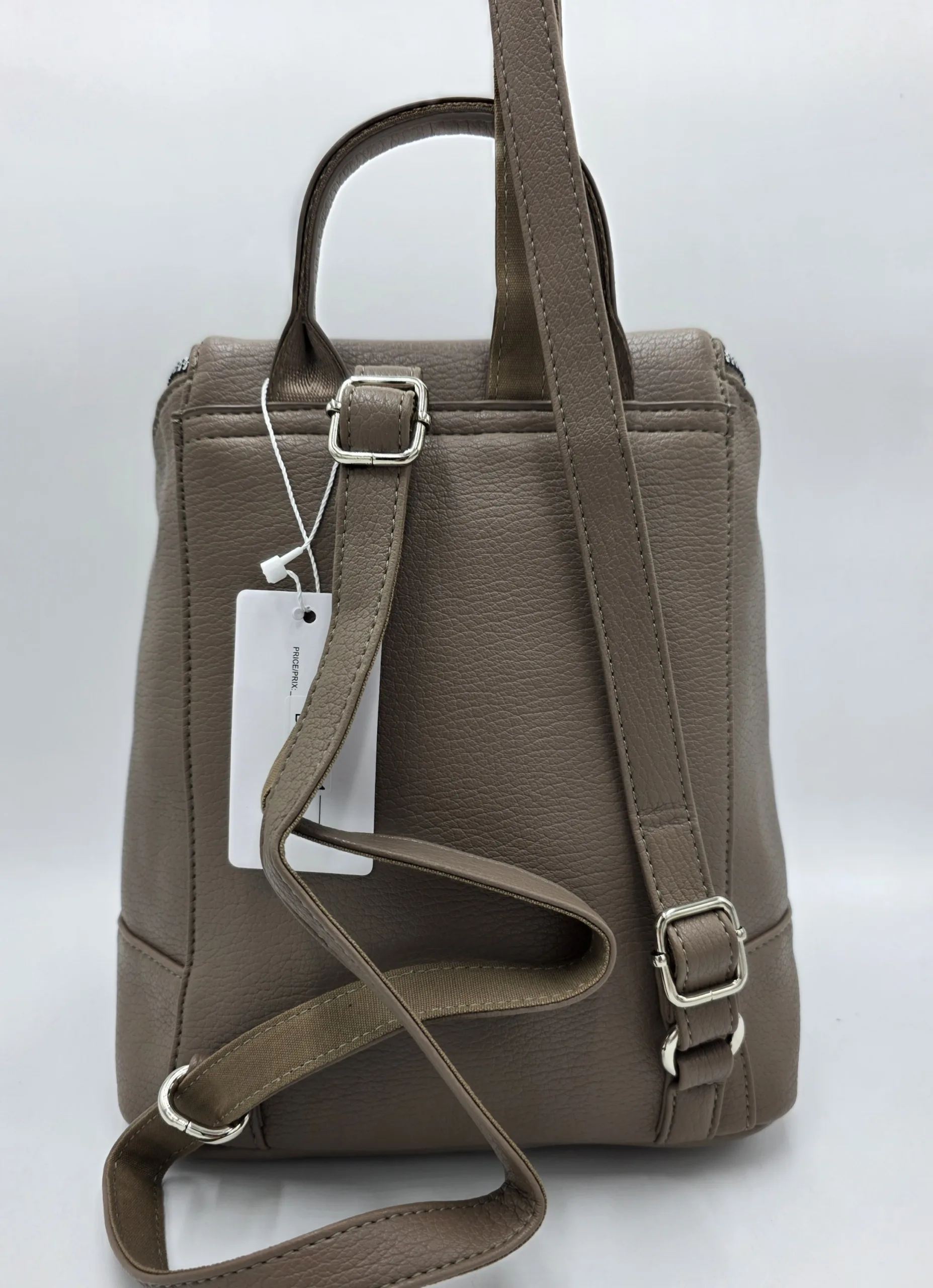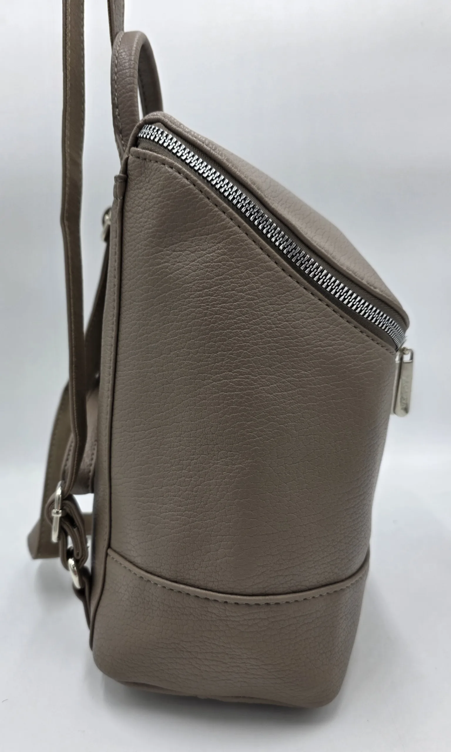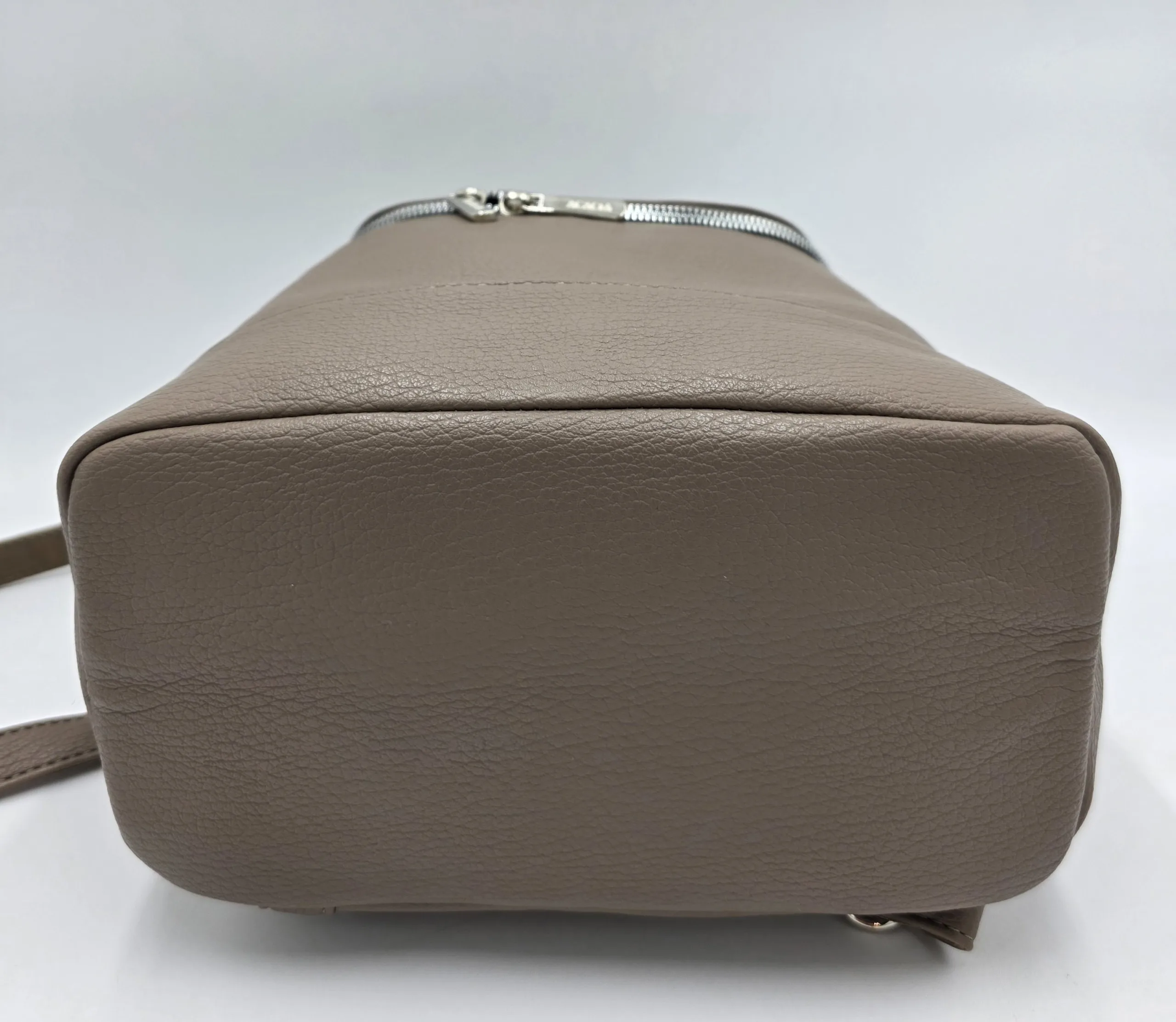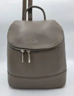 Раница от еко кожа с нестандартно закопчаване тип капак с цип, вътрешен джоб с цип, ширина 30см, височина 27см, дъно 24см/13см