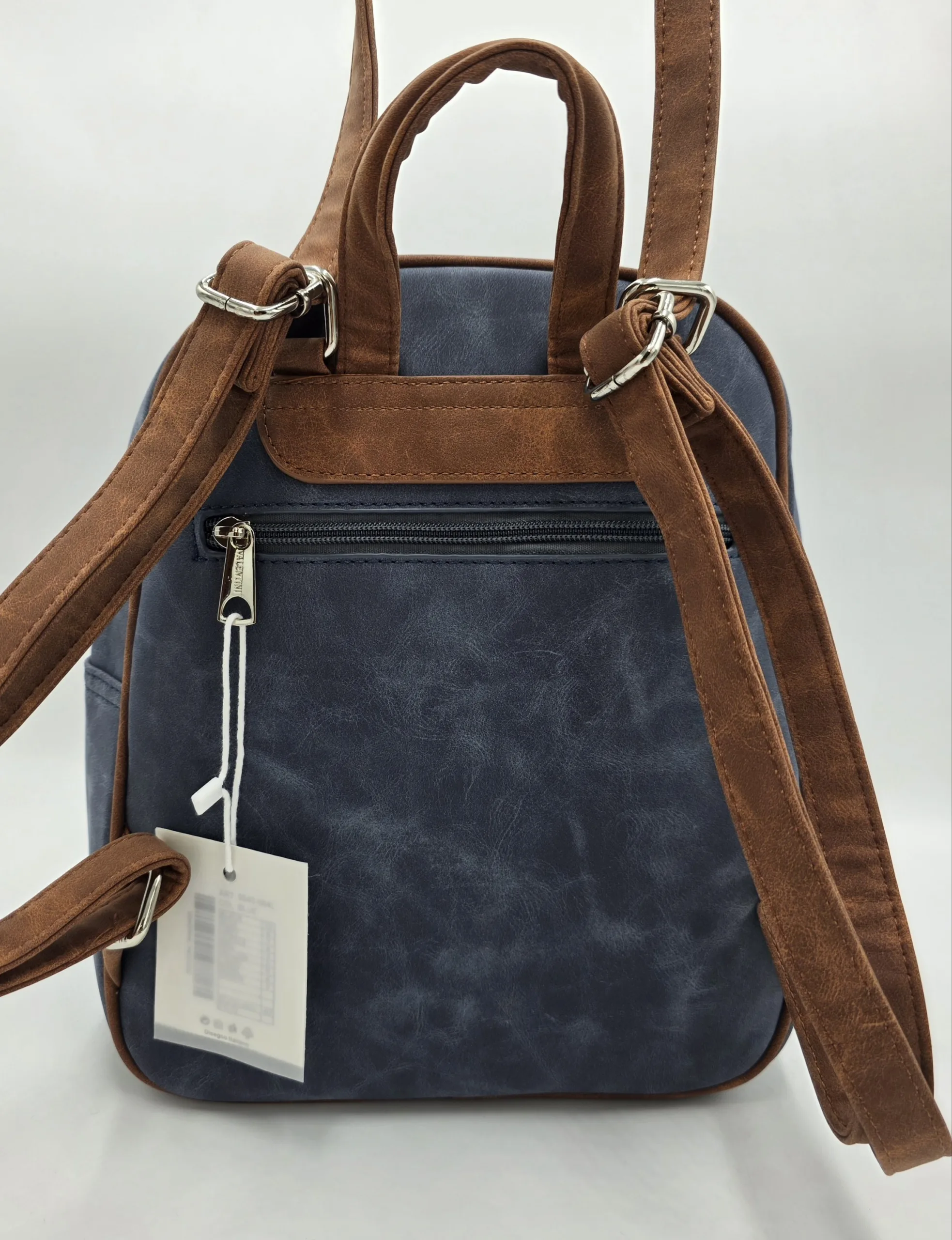 Раница от еко набук с две отделни прегради затварящи се с цип, заден външен джоб с цип, вътре със джоб с цип и допълнителни джобове за телефон. Ширина 28см, височина 31см, дъно 24см/11см.