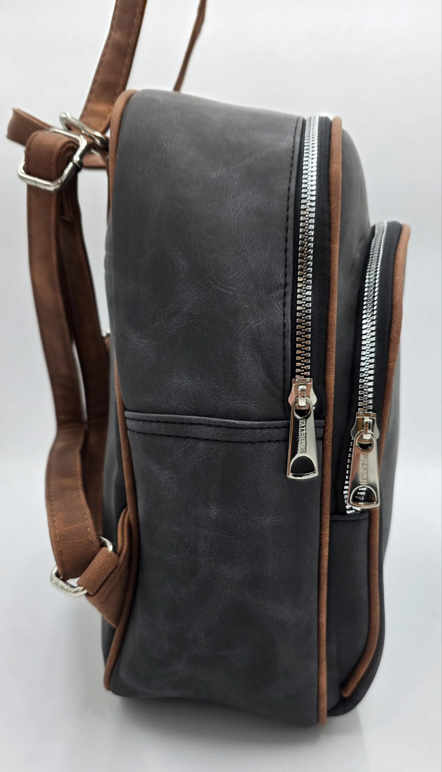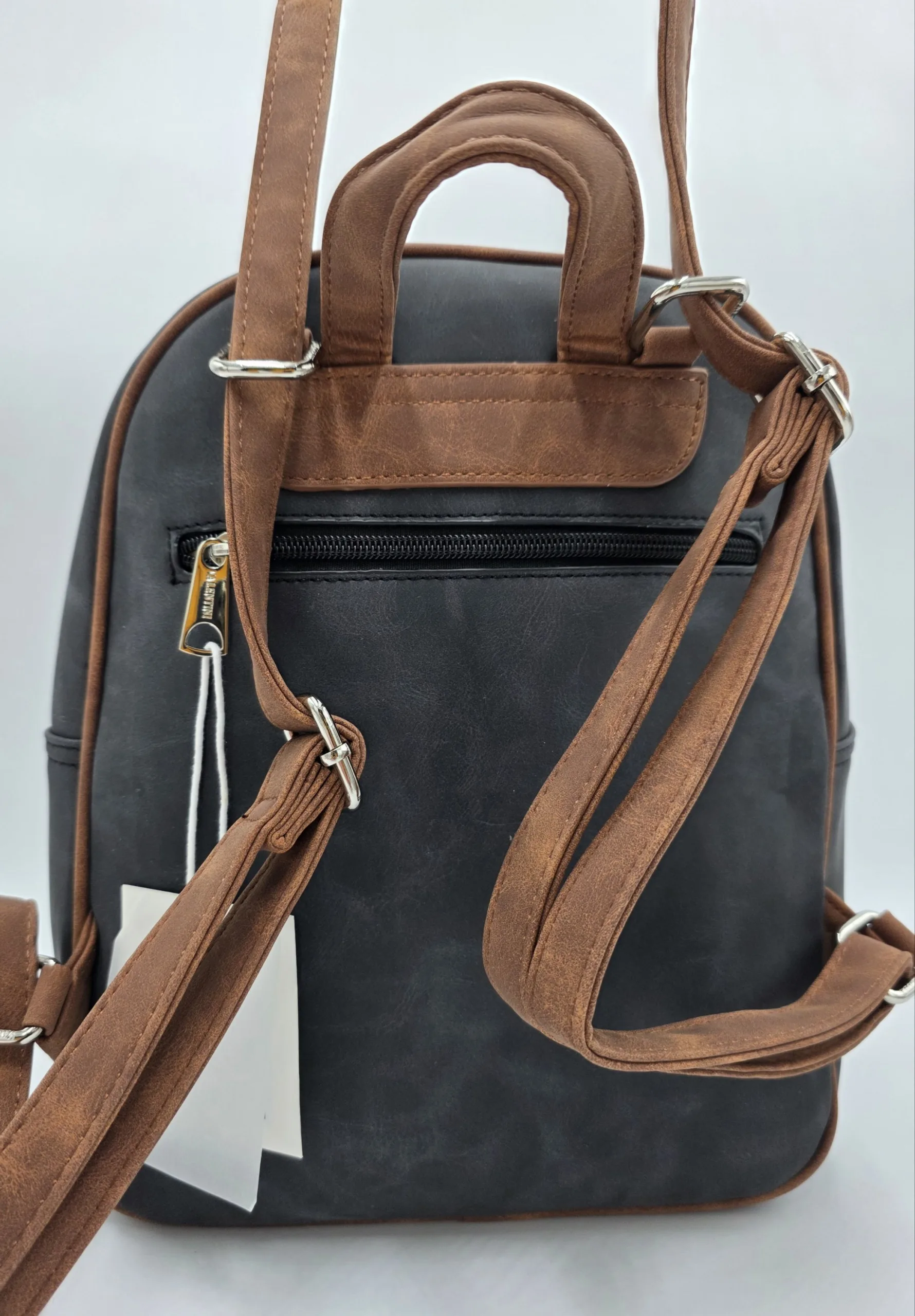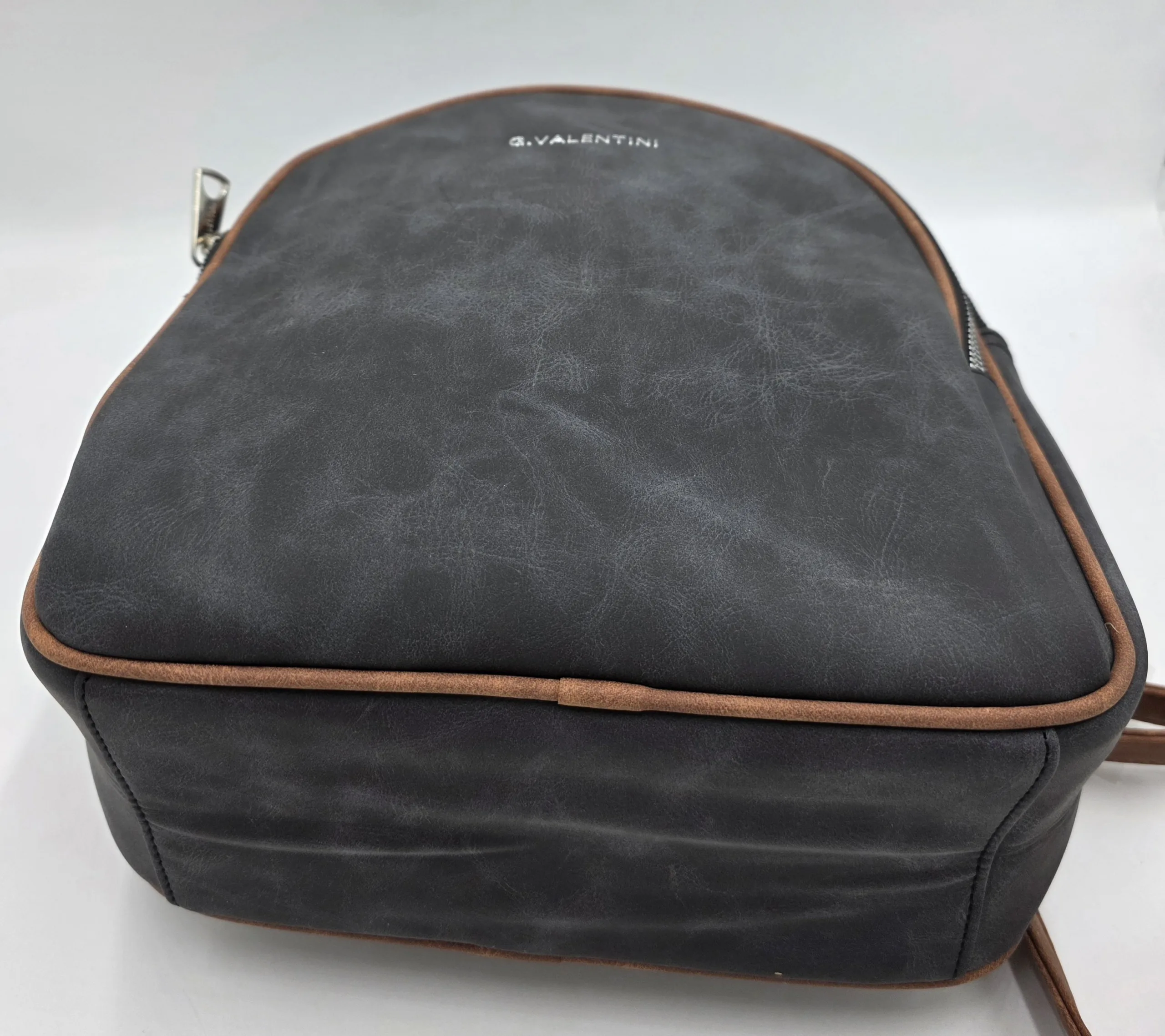 Раница от еко набук с две отделни прегради затварящи се с цип, заден външен джоб с цип, вътре със джоб с цип и допълнителни джобове за телефон. Ширина 28см, височина 31см, дъно 24см/11см.
