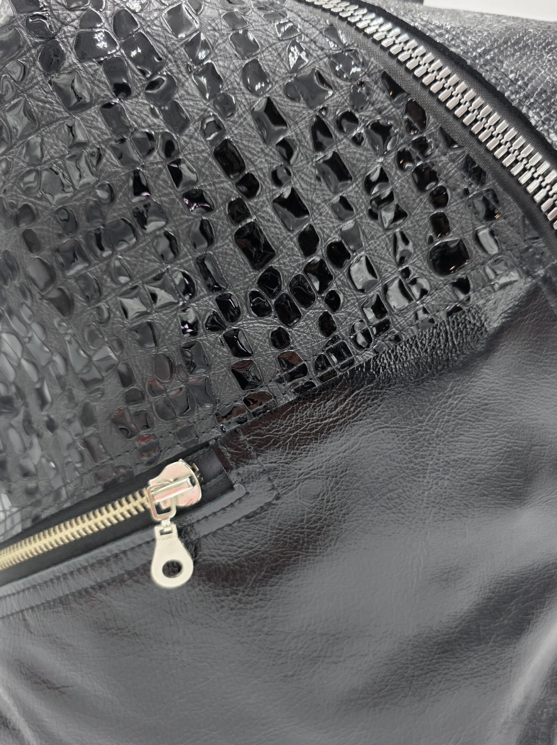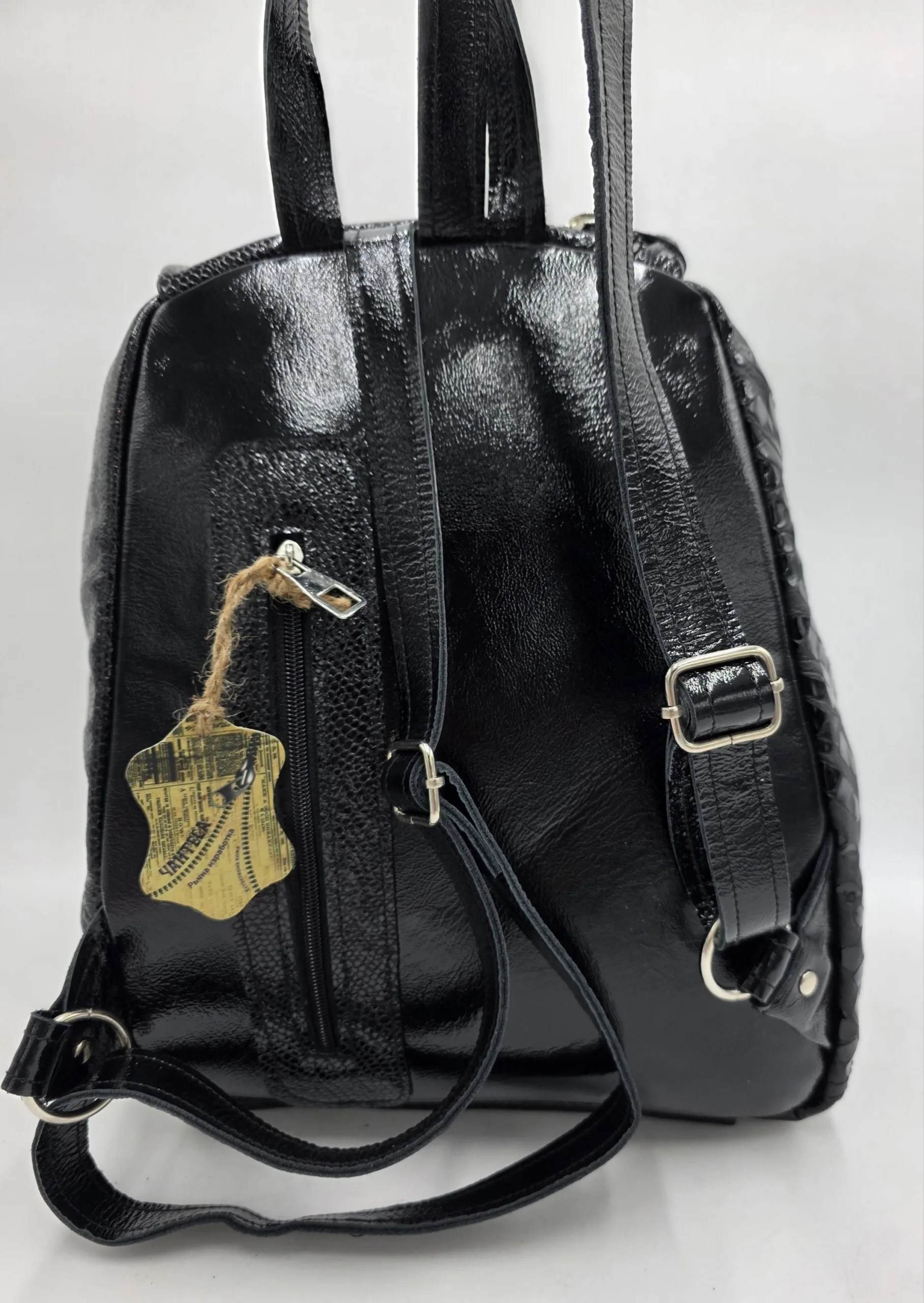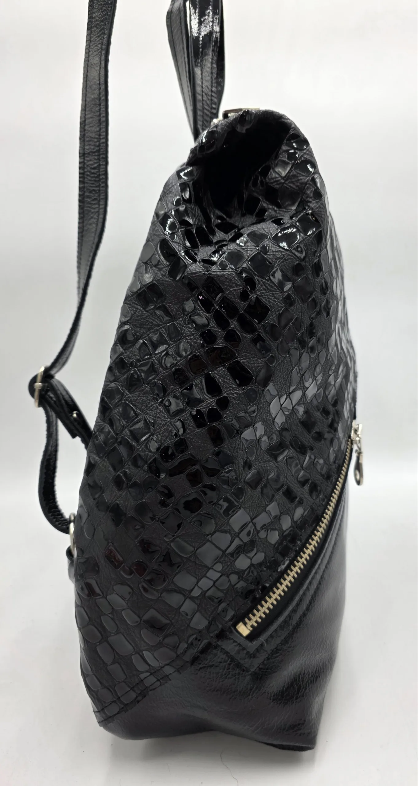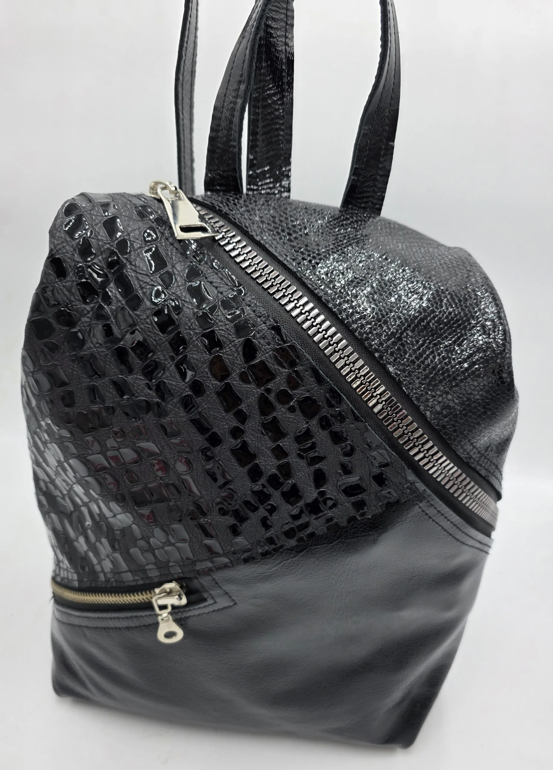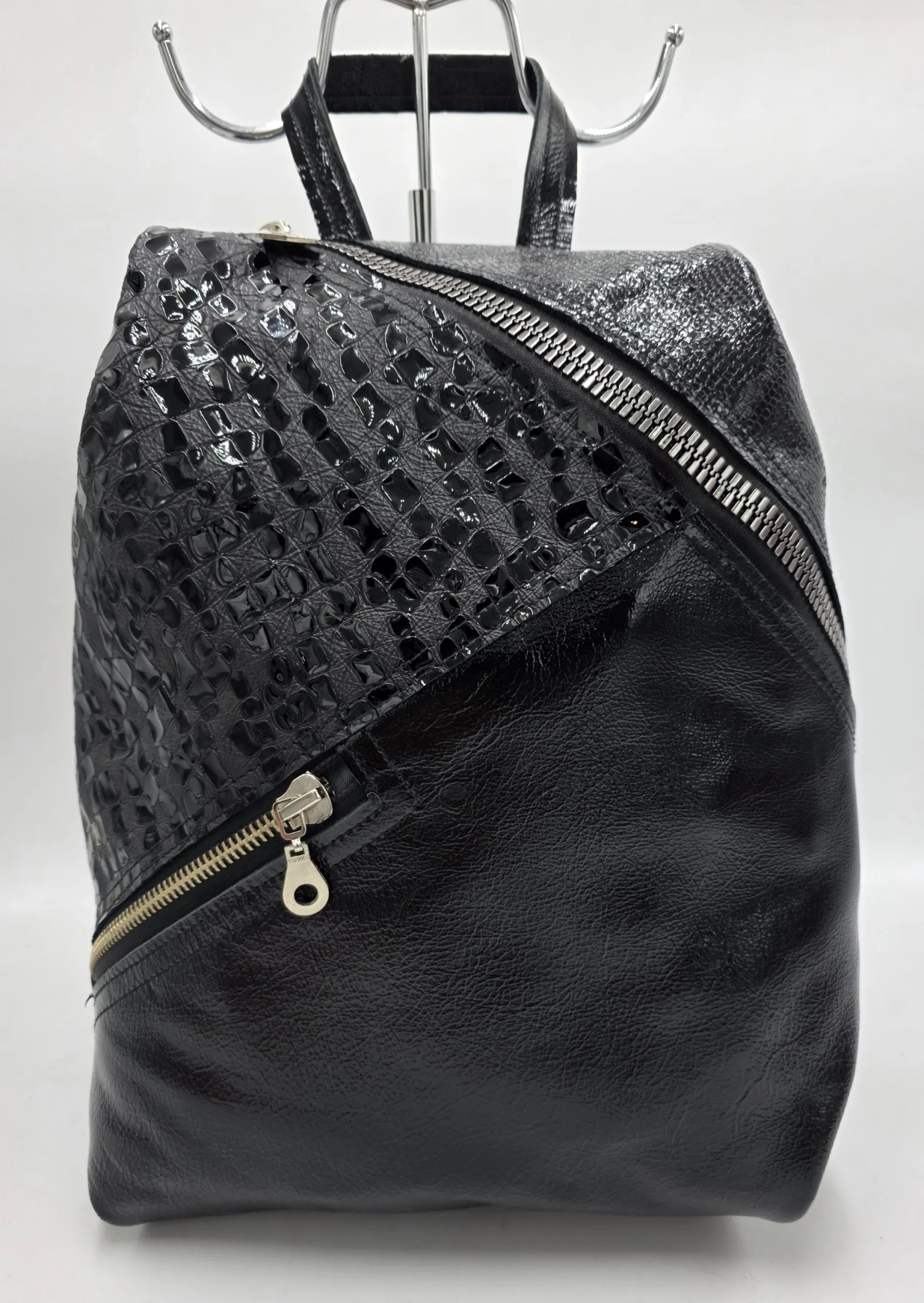 Нестандартна раница от естествена кожа ръчна изработка с асиметрично закопчаване с декоративен цип,преден джоб с цип, заден външен джоб с цип, вътрешен джоб с цип и допълнителен джоб за телефон, дръжки 95см, ширина 33см, височина 37см,дъно 28см/12см