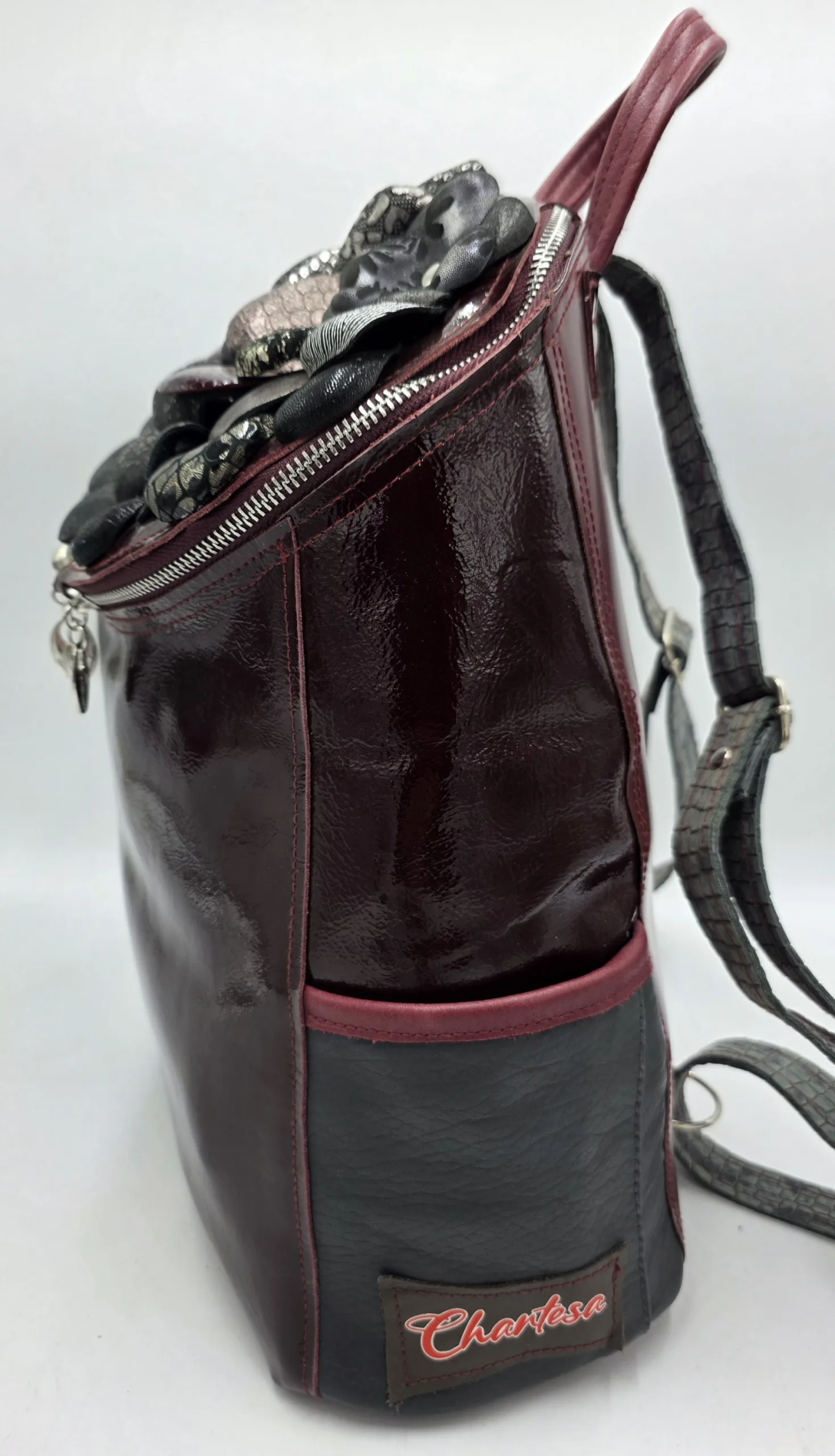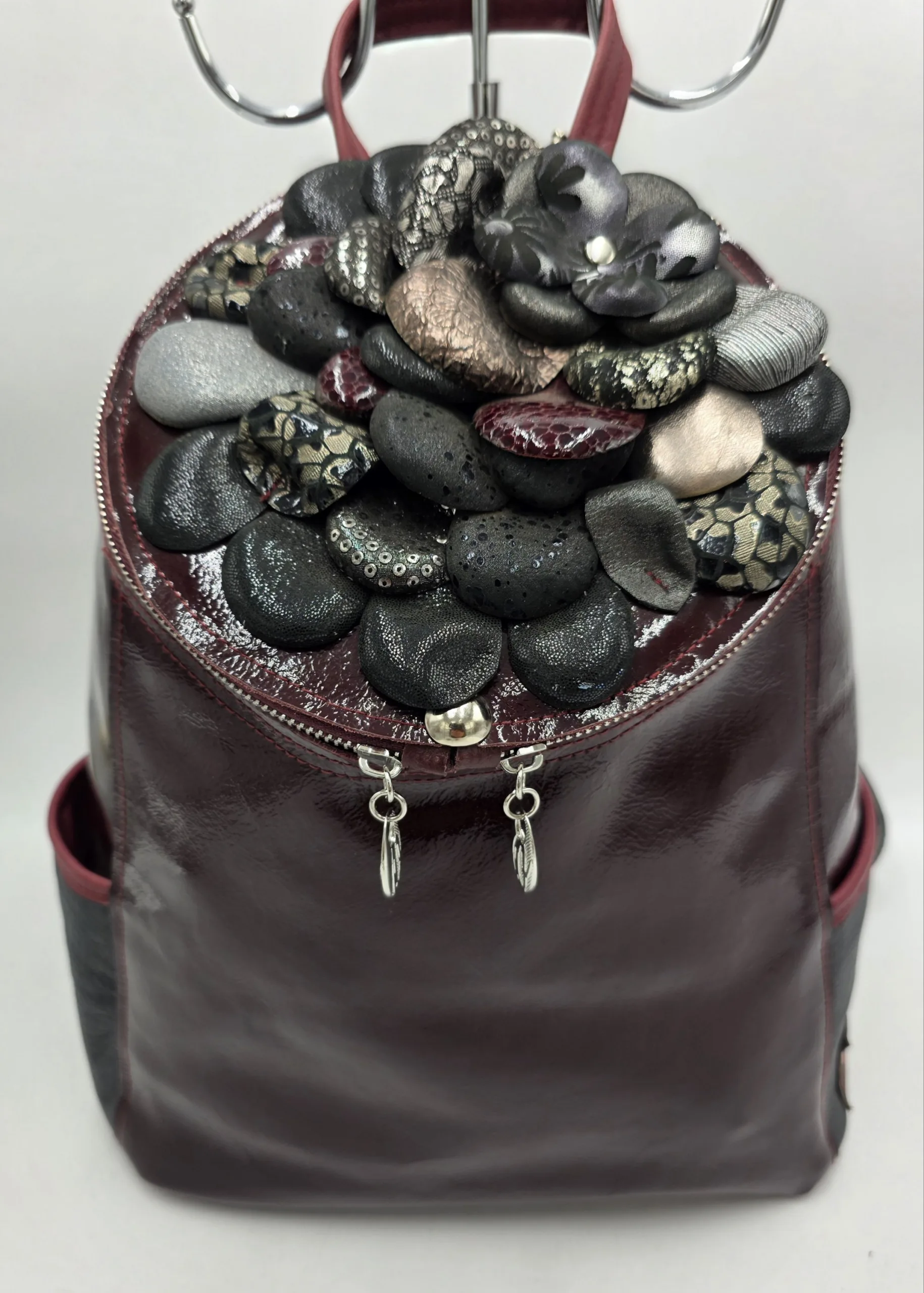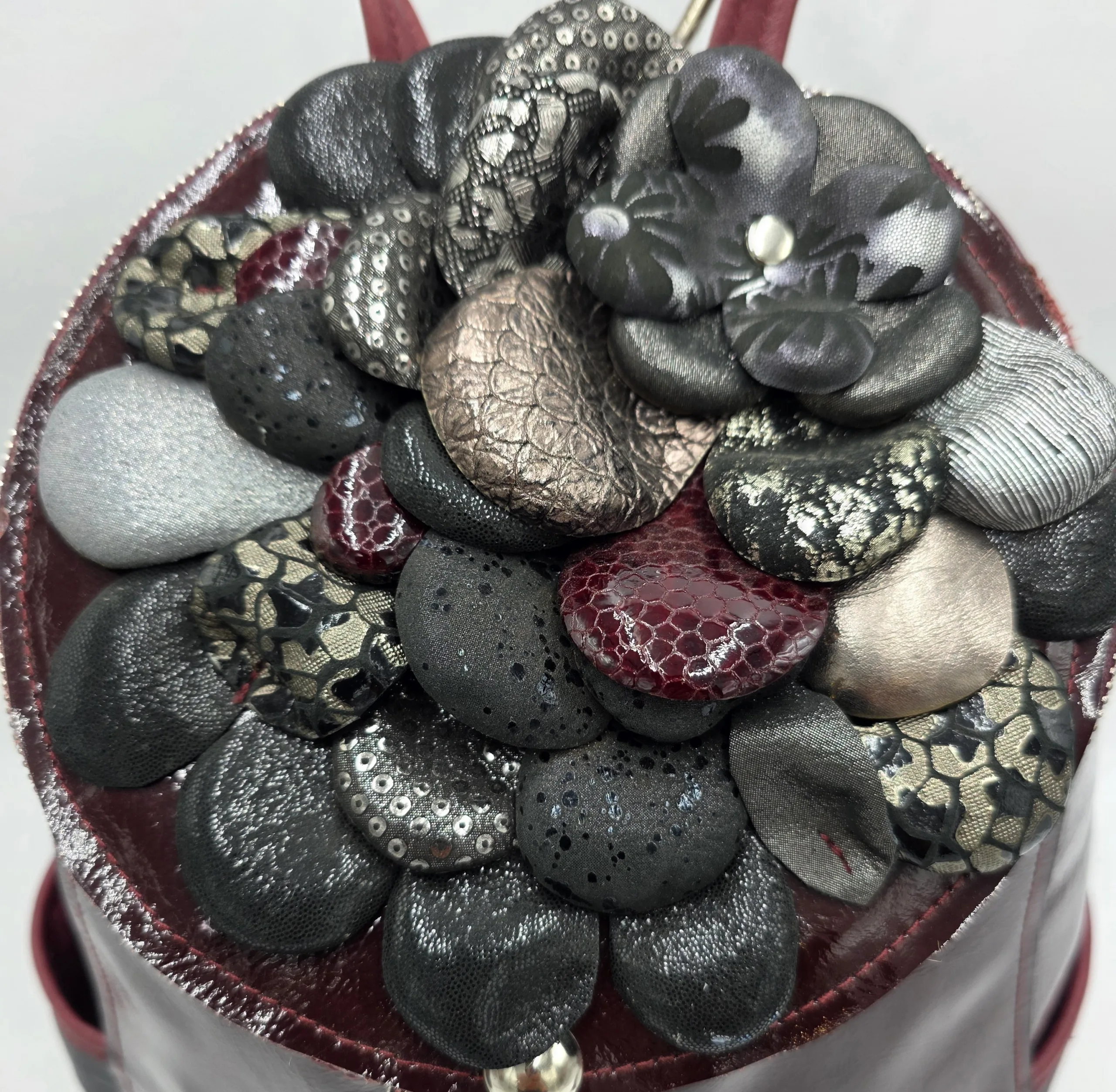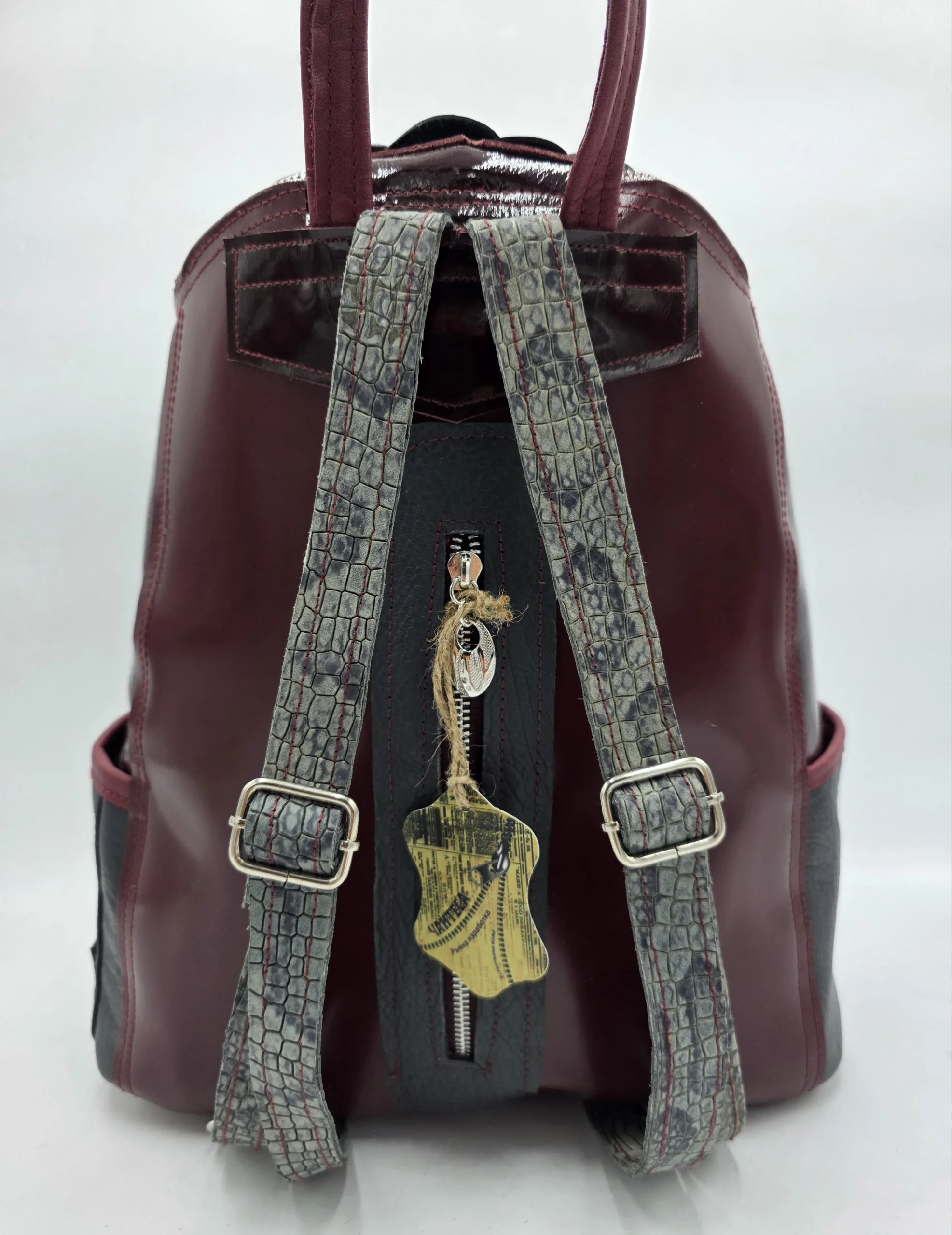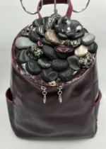 Нестандартна раница от кожа естествена кожа ръчна изработка с кръгъл капак,два странични джоба, заден джоб с цип, вътрешен джоб с цип и допълнителен джоб за телефон. Ширина 32см, височина 34см,дъно 32см/14см