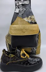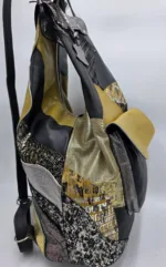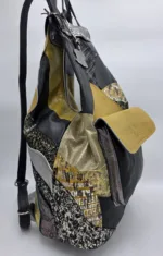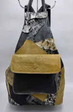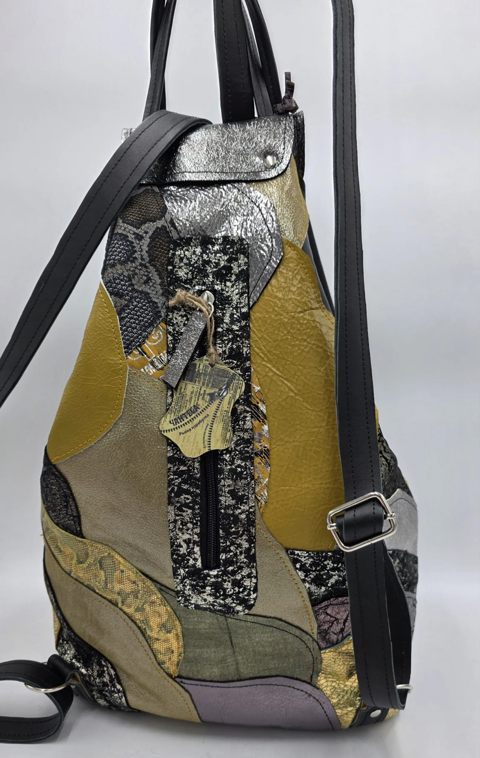 Супер нестандартна раница от естествена кожа ръчна изработка, затваряне с цип,преден джоб с капак, заден външен джоб с цип, вътрешен джоб с цип и допълнителен джоб за телефон, дръжки 100см,височина 50см в най високата част,в най ниска 29см,ширина 33см,дъно 28см/16см