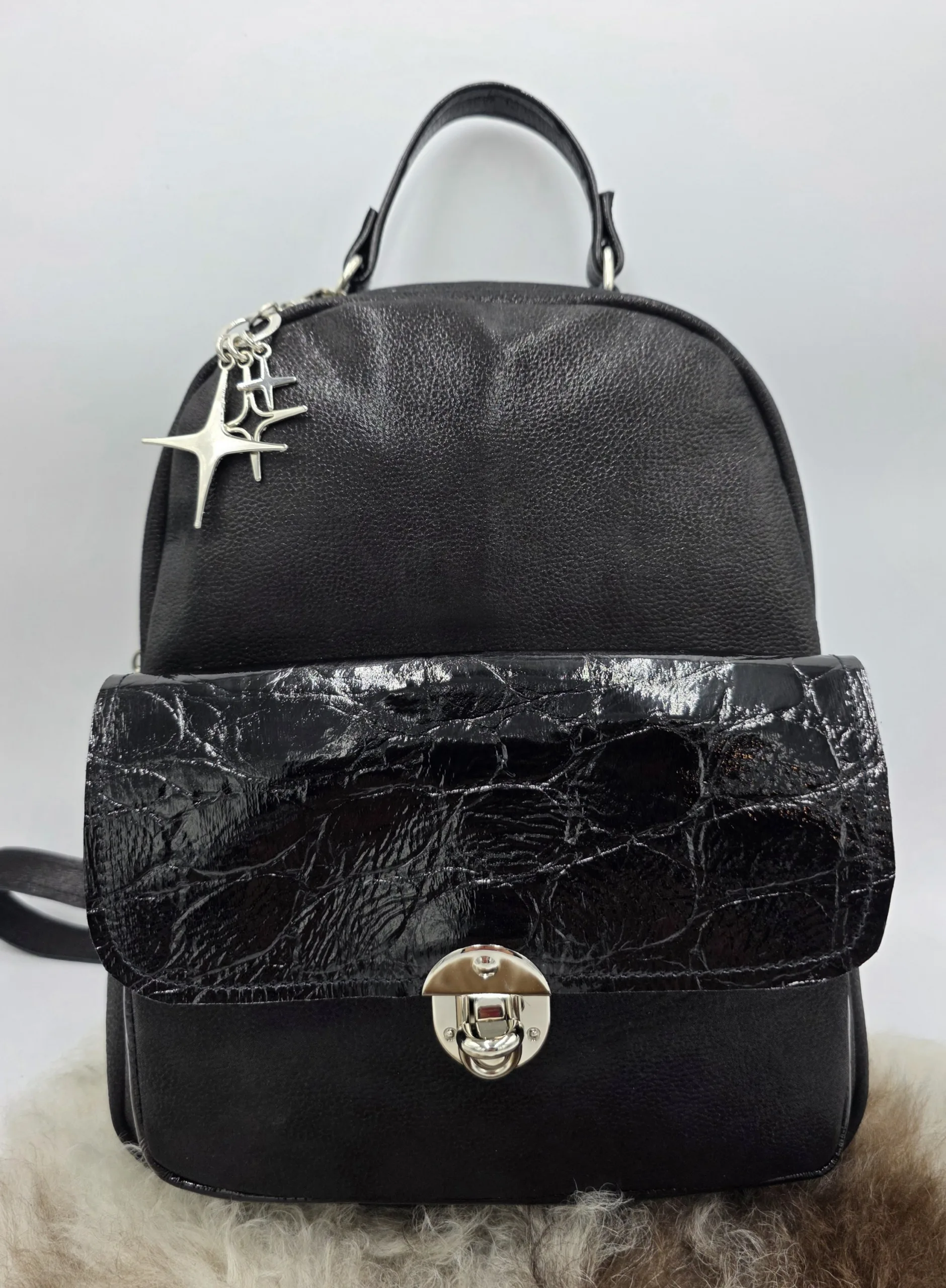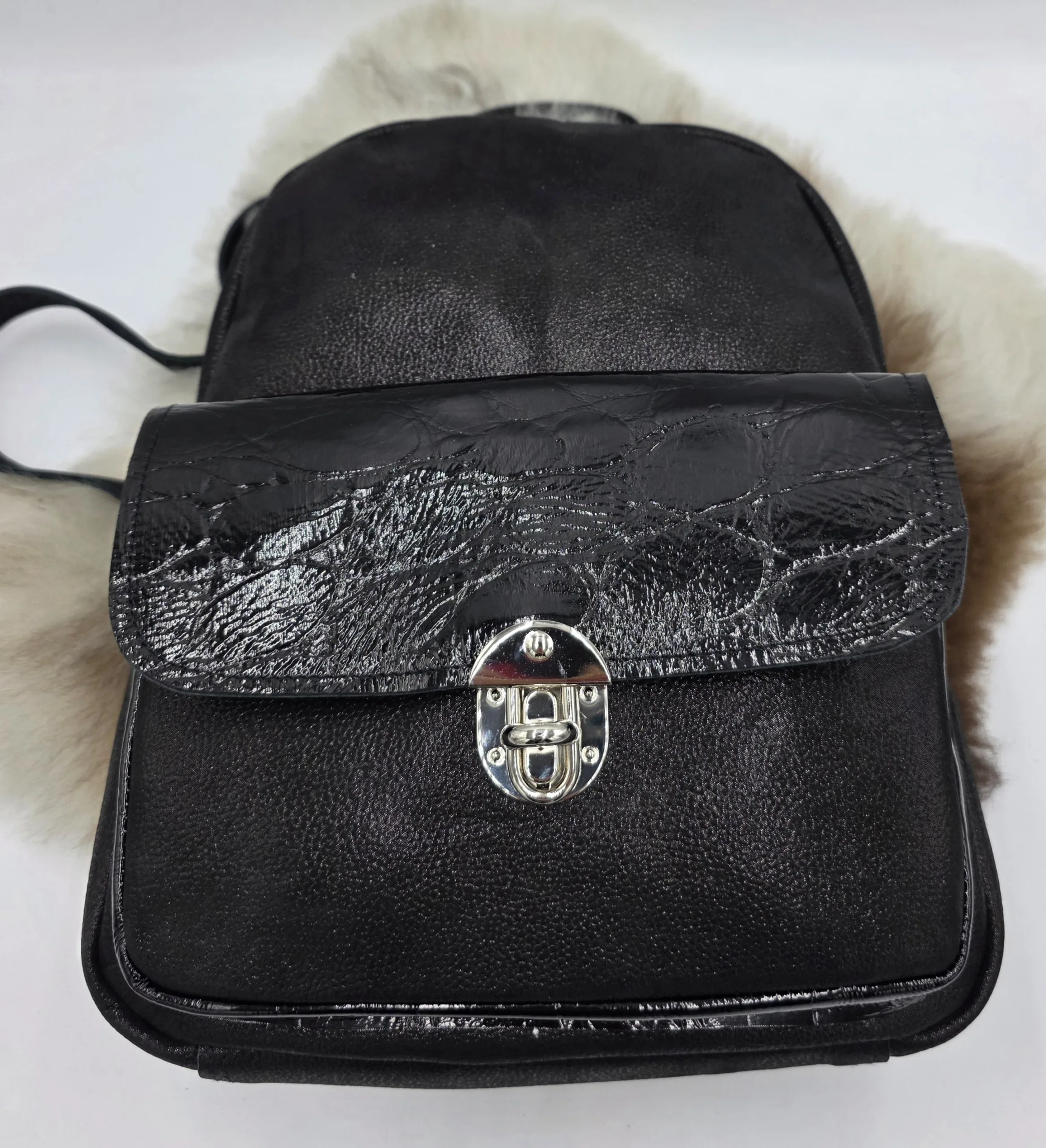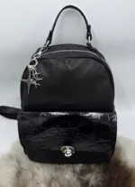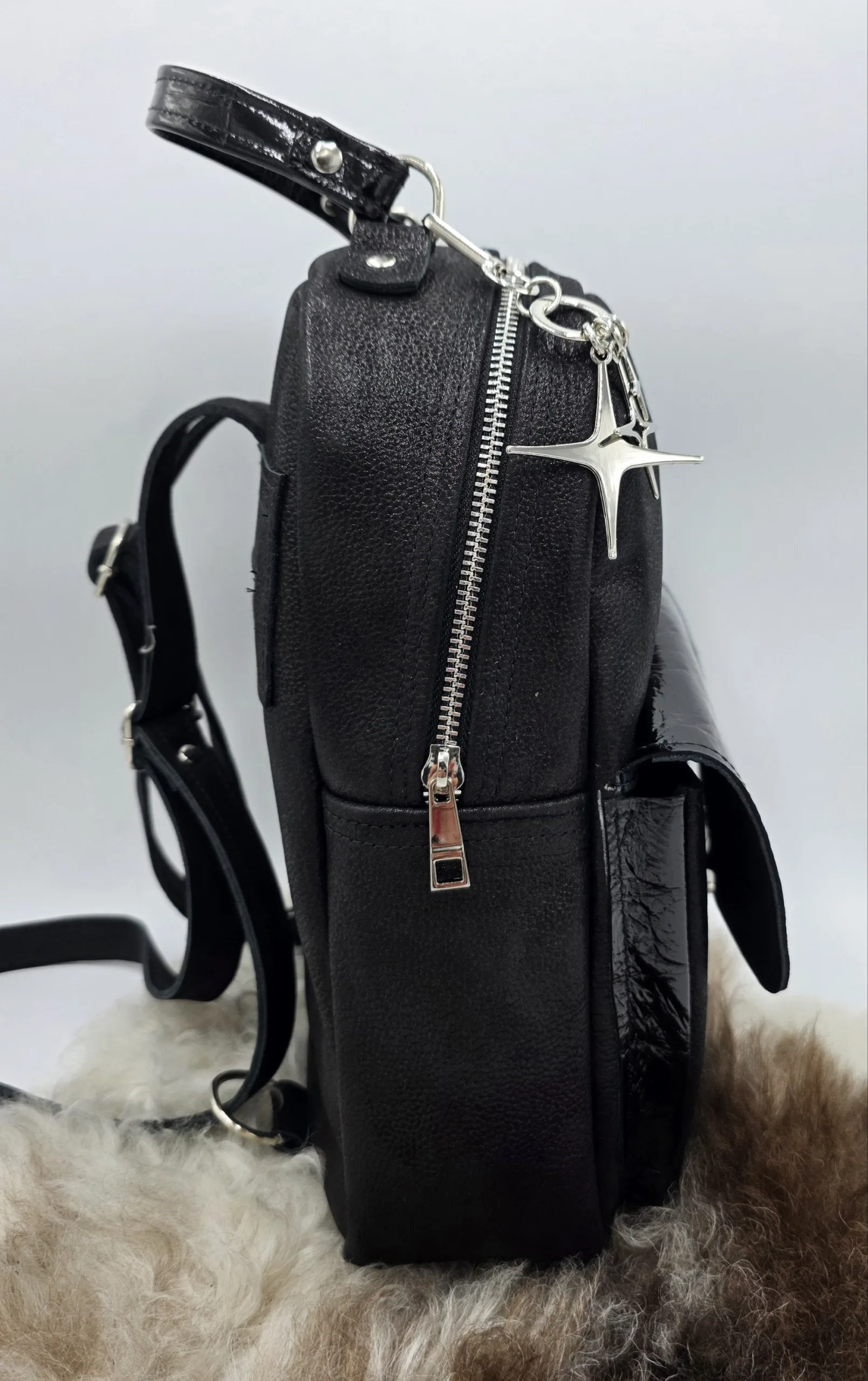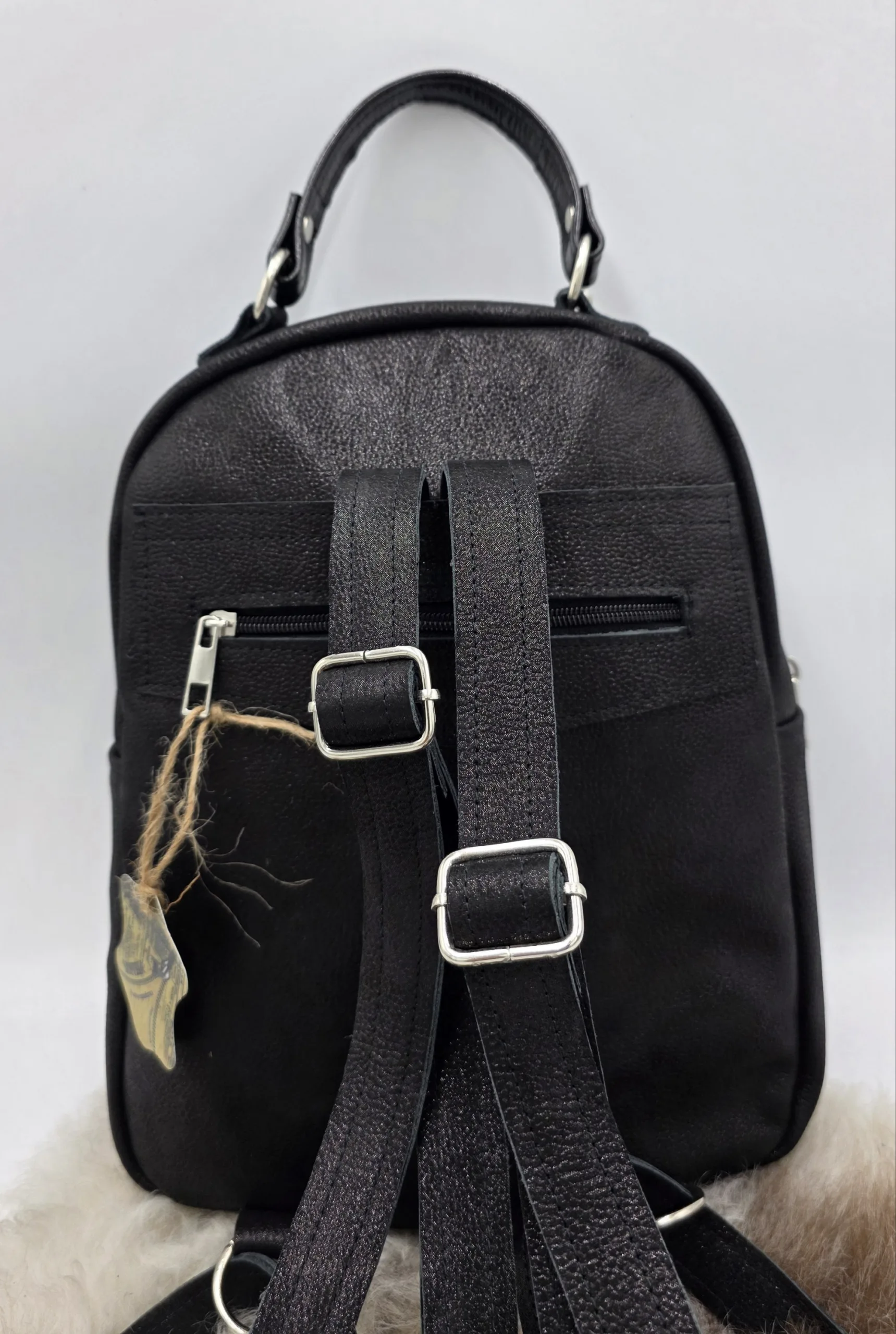 Уникална раница от естествена кожа, ръчна изработка,преден външен джоб с копче,заден външен джоб с цип, вътрешен джоб с, преграда с цип и допълнителен джоб за телефон, ширина 27см, височина 32см, дъно 25см/10см