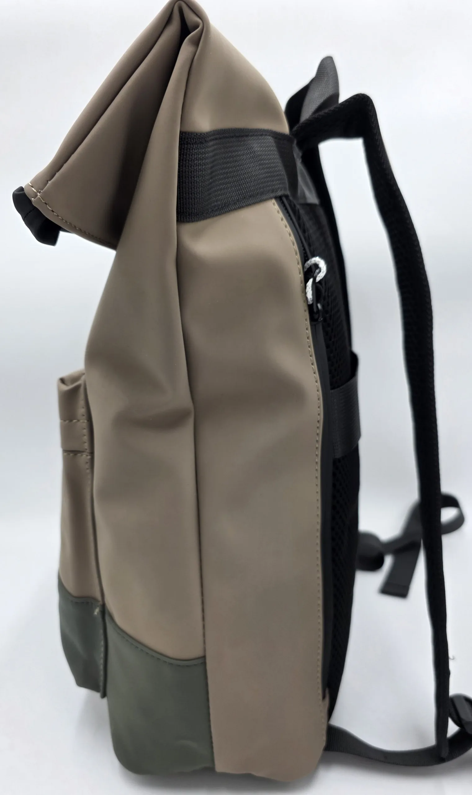 Раница от гумиран непромокаем текстил с непромокаеми ципове,с капак, два външни джоба с цип, вътрешен джоб с цип и подсилена преграда за компютър.Ширина 35см, височина 40см,дъно 29см/13см .