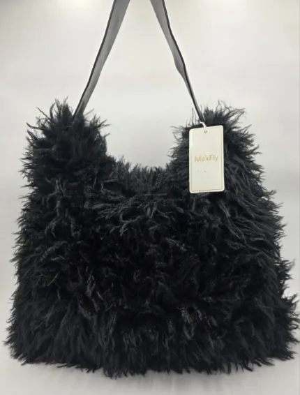Пухена чанта от еко косъм, тип торба, закопчаване с цип, с една дръжка 46см, допълнителна дълга регулираща се дръжка 150см,