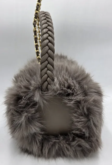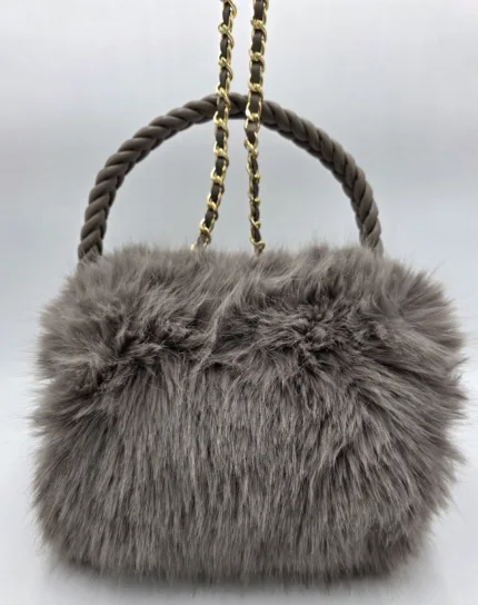 Пухена чанта от еко косъм с една дръжка 48см, дълга дръжка синджир,закопчаване с цип, вътрешен джоб с цип и допълнителен
