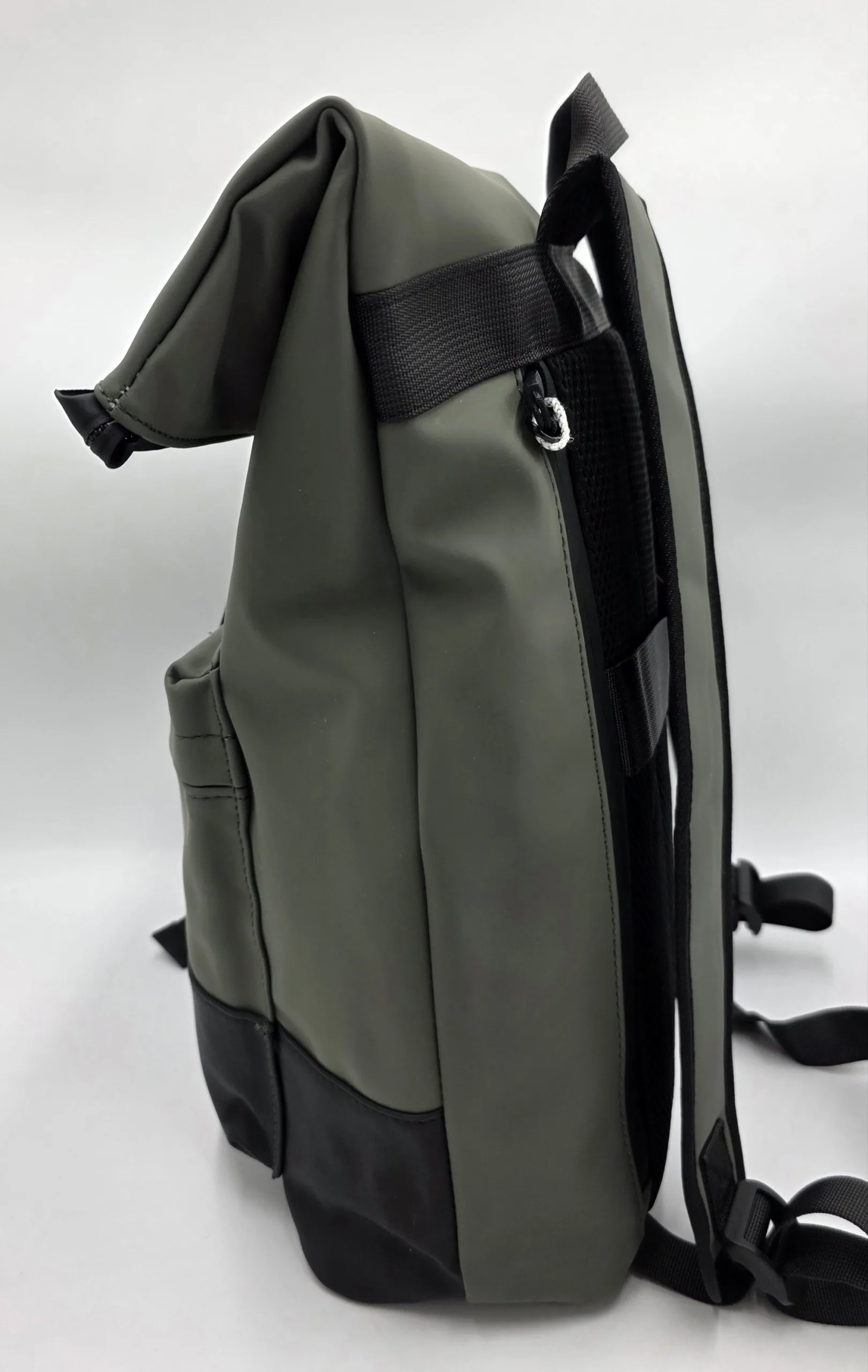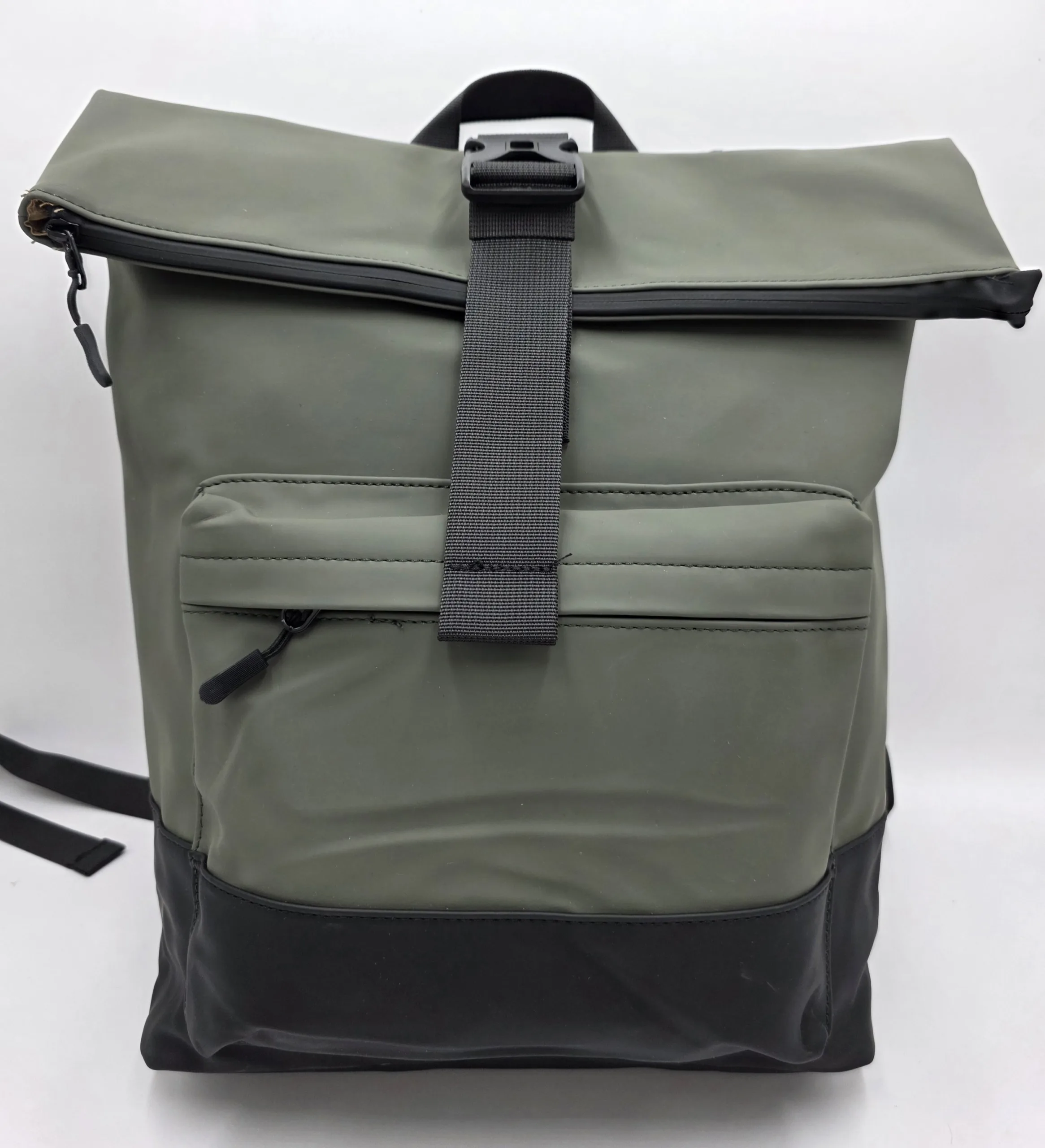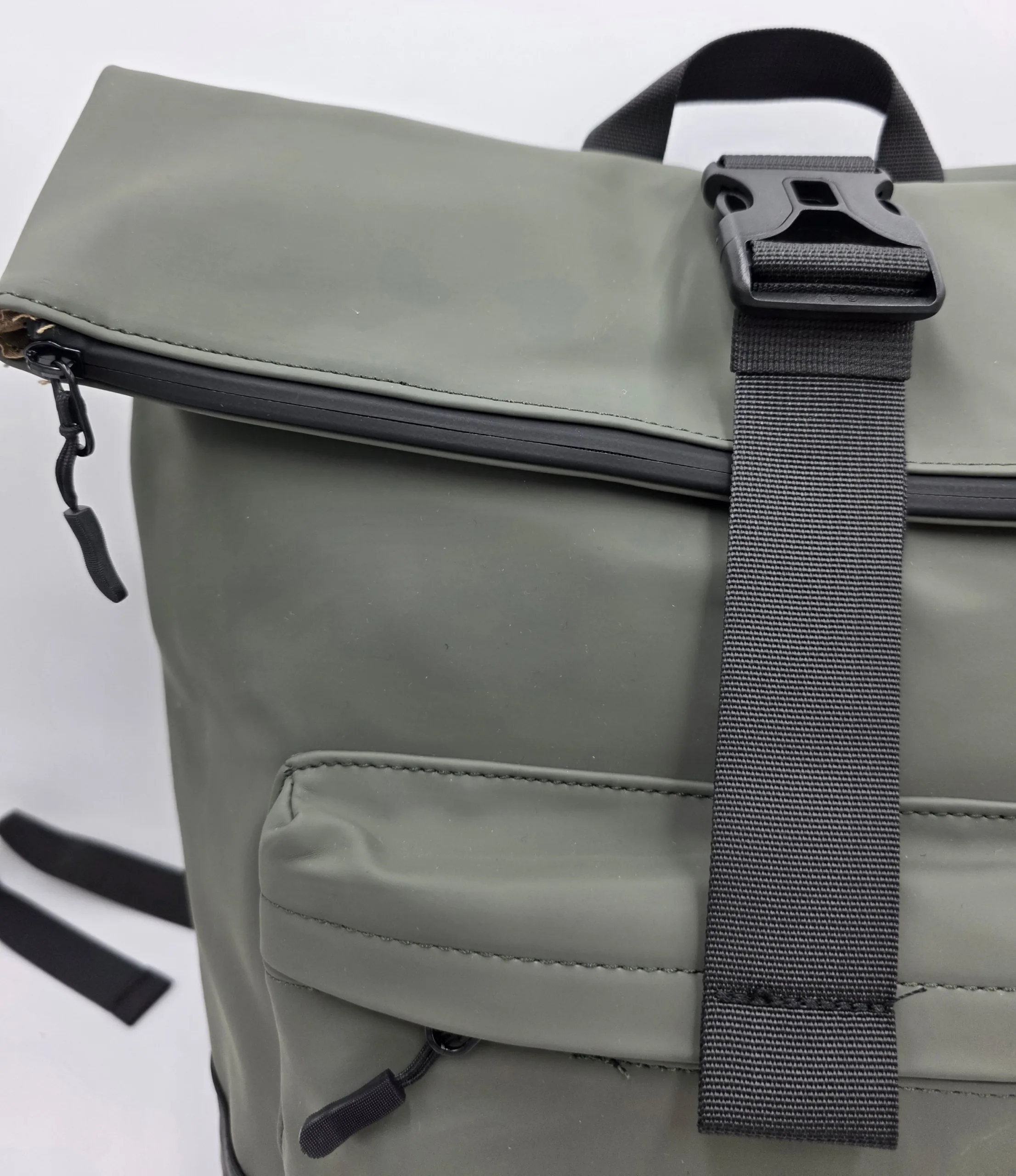 Раница от гумиран непромокаем текстил с непромокаеми ципове,с капак, два външни джоба с цип, вътрешен джоб с цип и подсилена преграда за компютър.Ширина 35см, височина 40см,дъно 29см/13см .