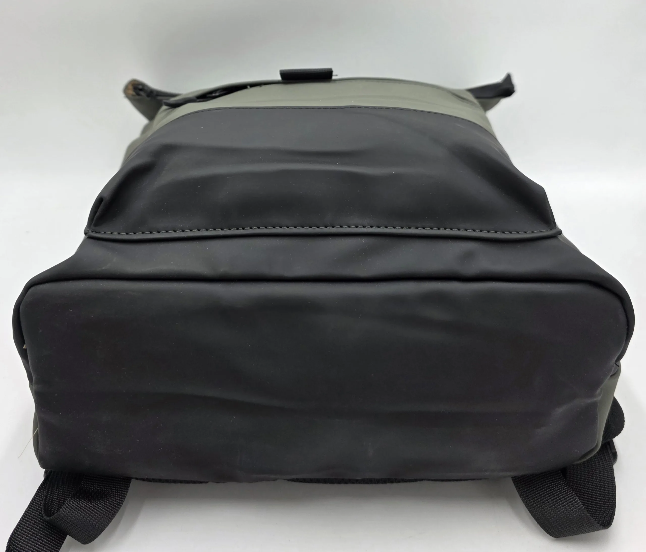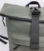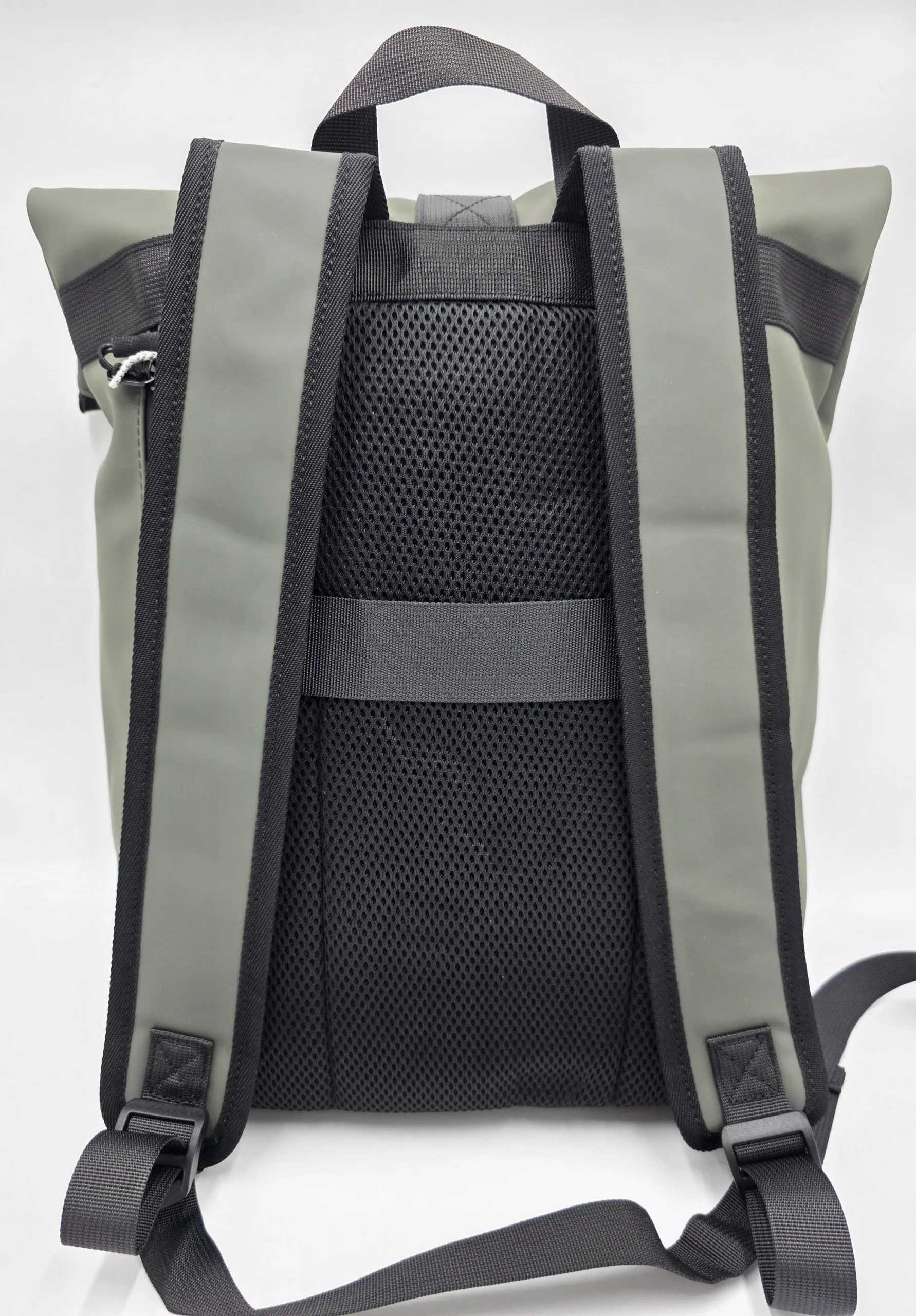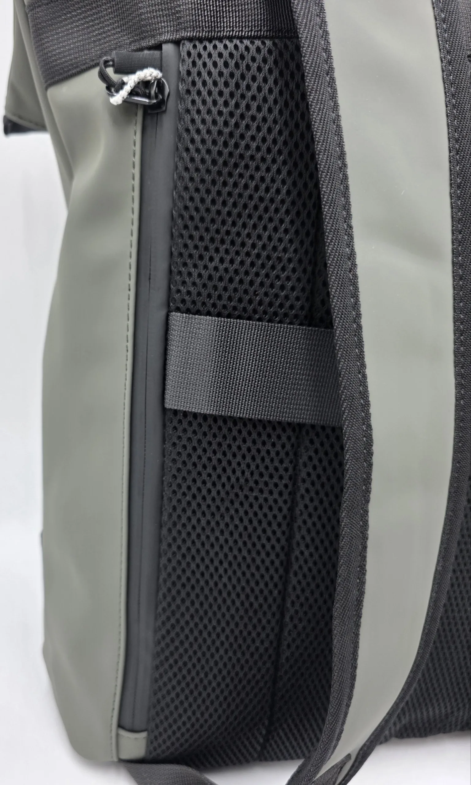 Раница от гумиран непромокаем текстил с непромокаеми ципове,с капак, два външни джоба с цип, вътрешен джоб с цип и подсилена преграда за компютър.Ширина 35см, височина 40см,дъно 29см/13см .