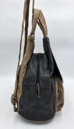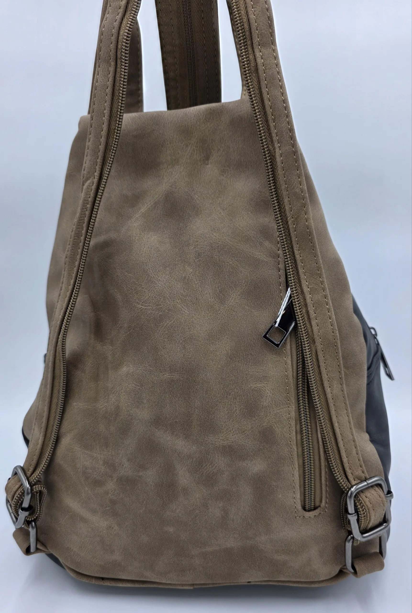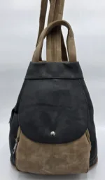 Раница от еко набук,височина 33см,ширина в долната част 28см,дъно 29/17см. Преден джоб с цип и капак,вътрешен заден с цип,вътрешен с цип и допълнителни джобове за телефон.