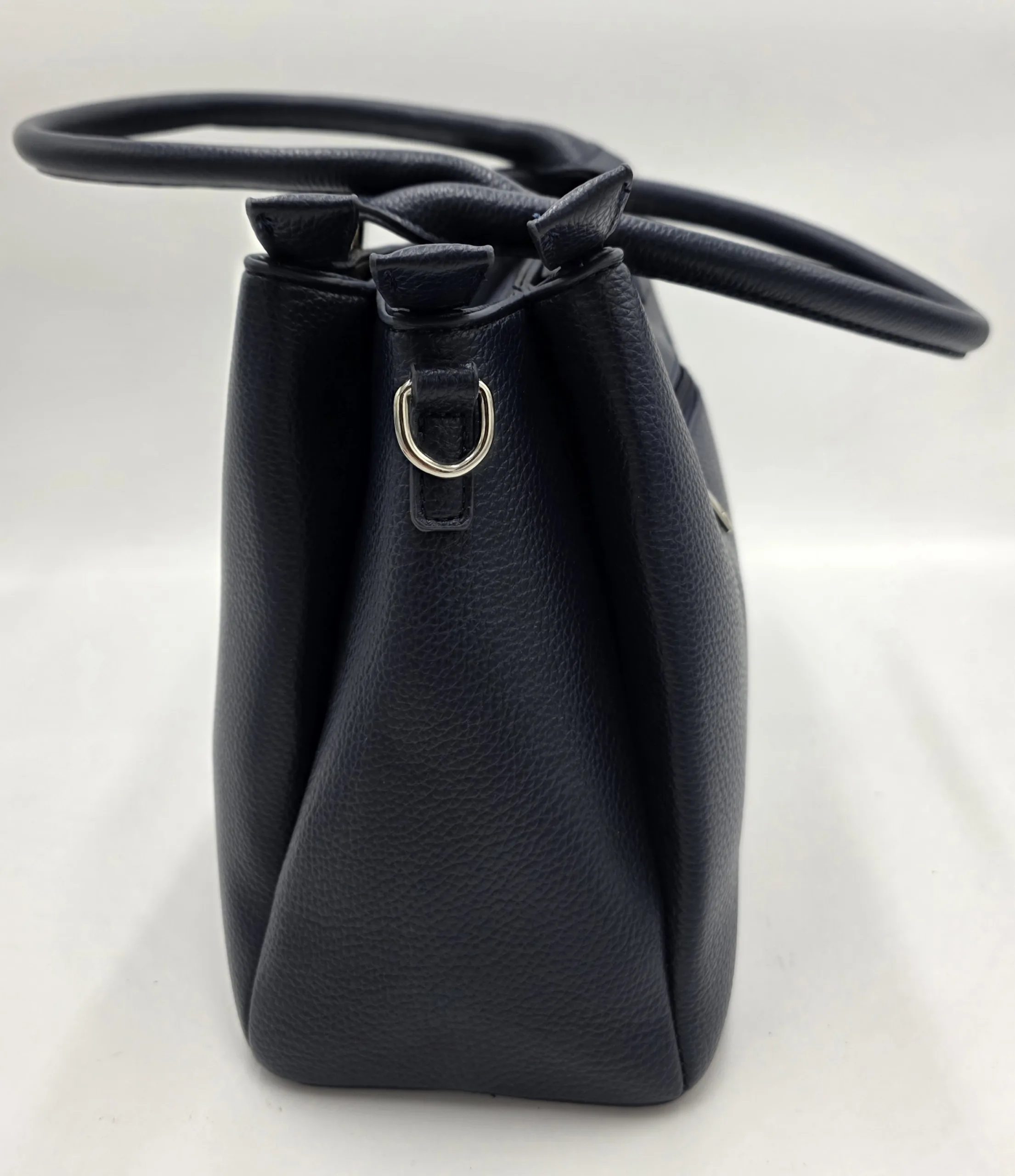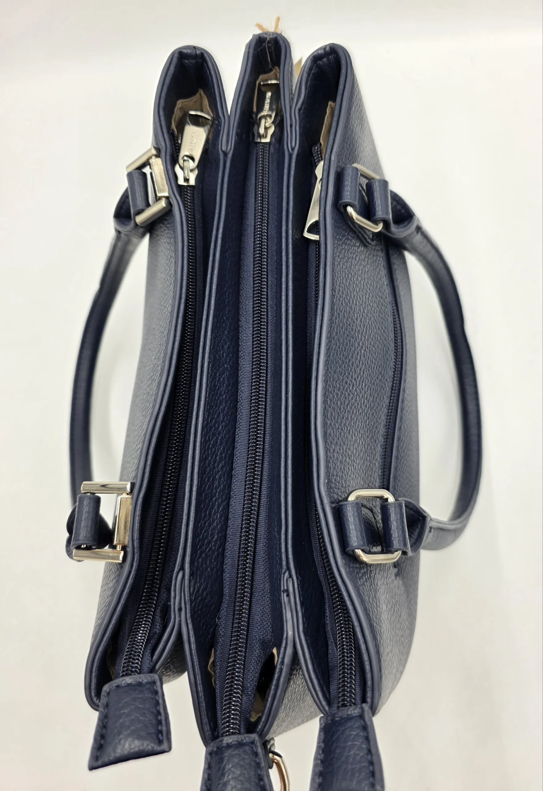 Чанта от еко кожа с три отделни прегради затварящи се с цип, две дръжки 56см,допълнителна дълга регулираща се дръжка 150см, заден външен джоб с цип, вътрешен джоб с цип и допълнителни джобове за телефон. Ширина 36см,височина 24см,дъно 34см/13см.