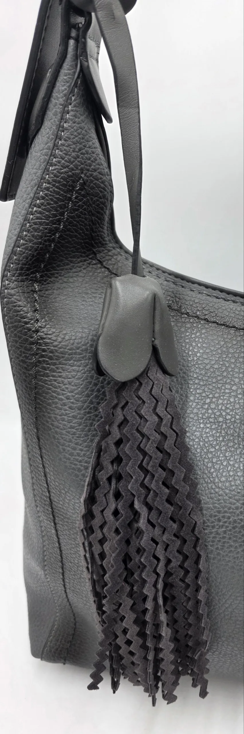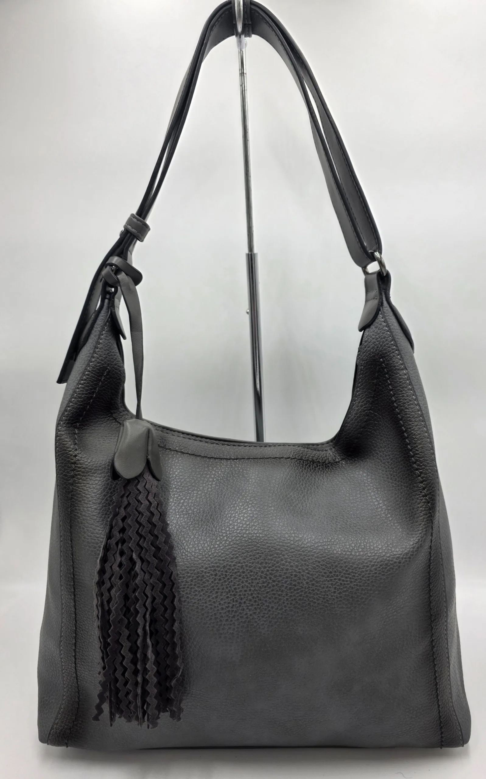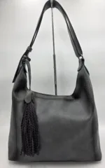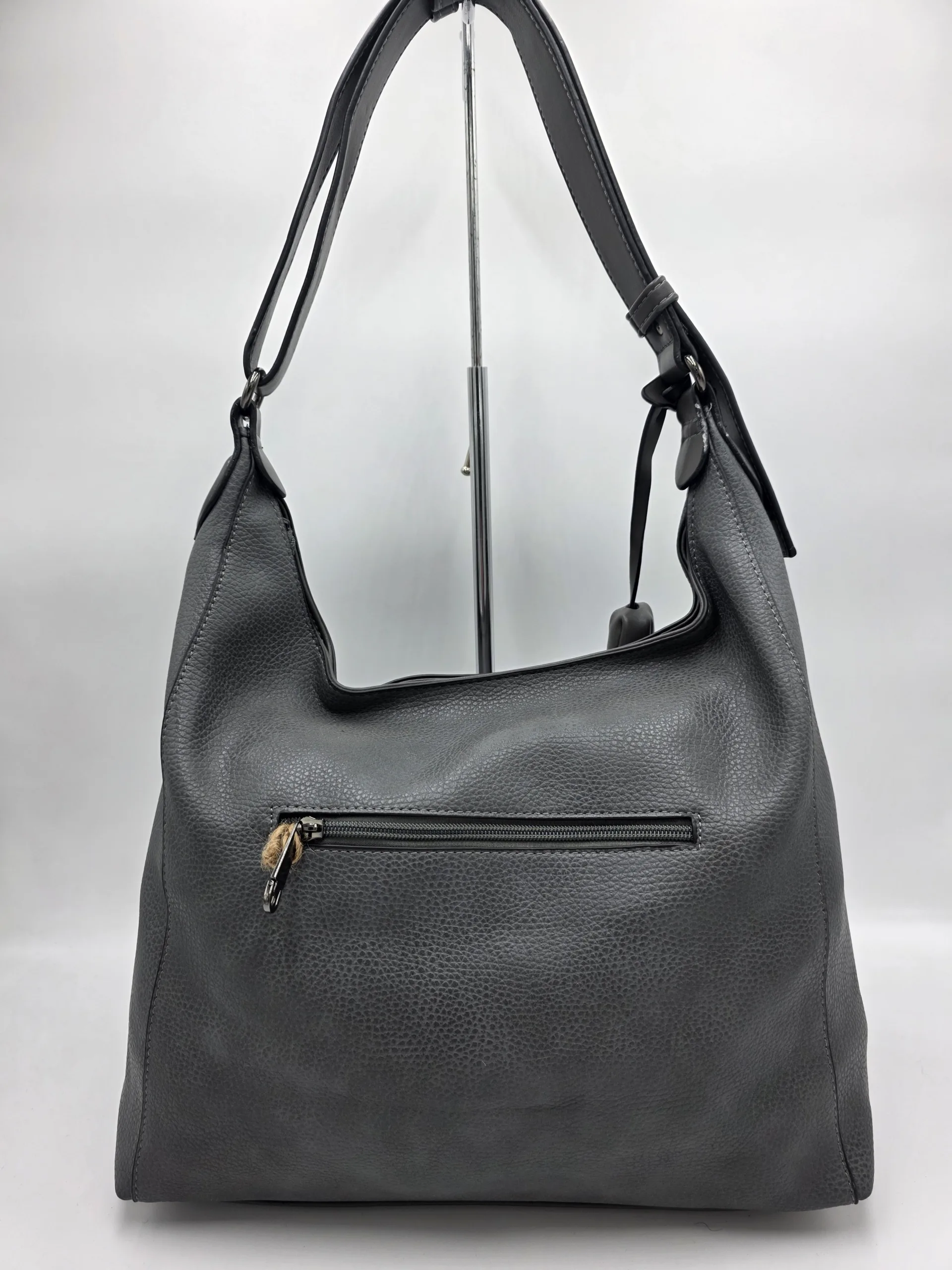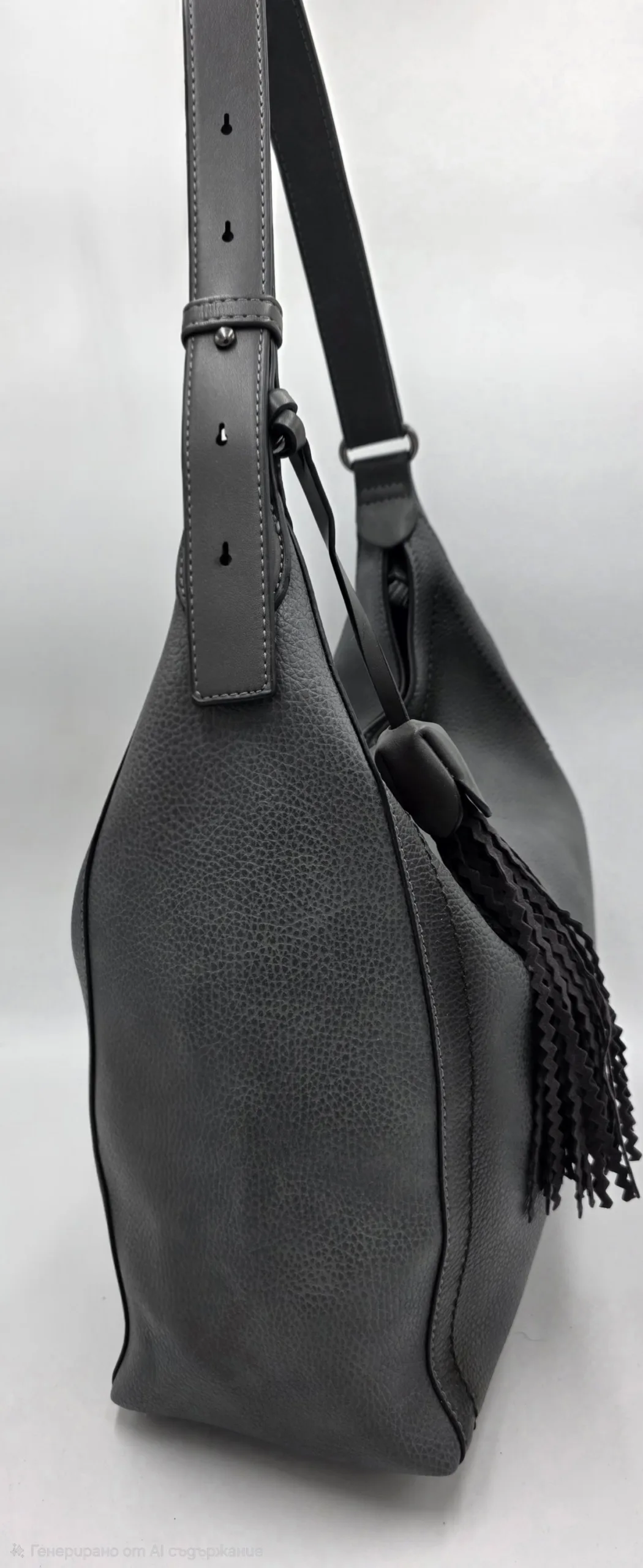 Чанта от еко кожа с една регулираща се дръжка, с външен заден джоб с цип, вътре със средна преграда с цип, вътрешен джоб с цип и допълнителни джобове за телефон. Ширина 35см, височина 30см, дъно 34см/12см