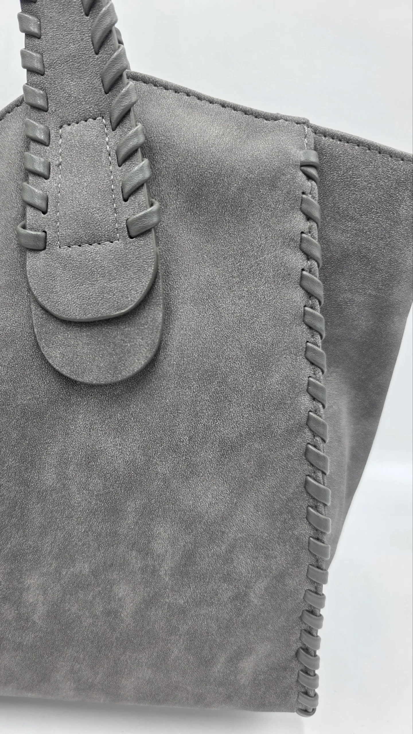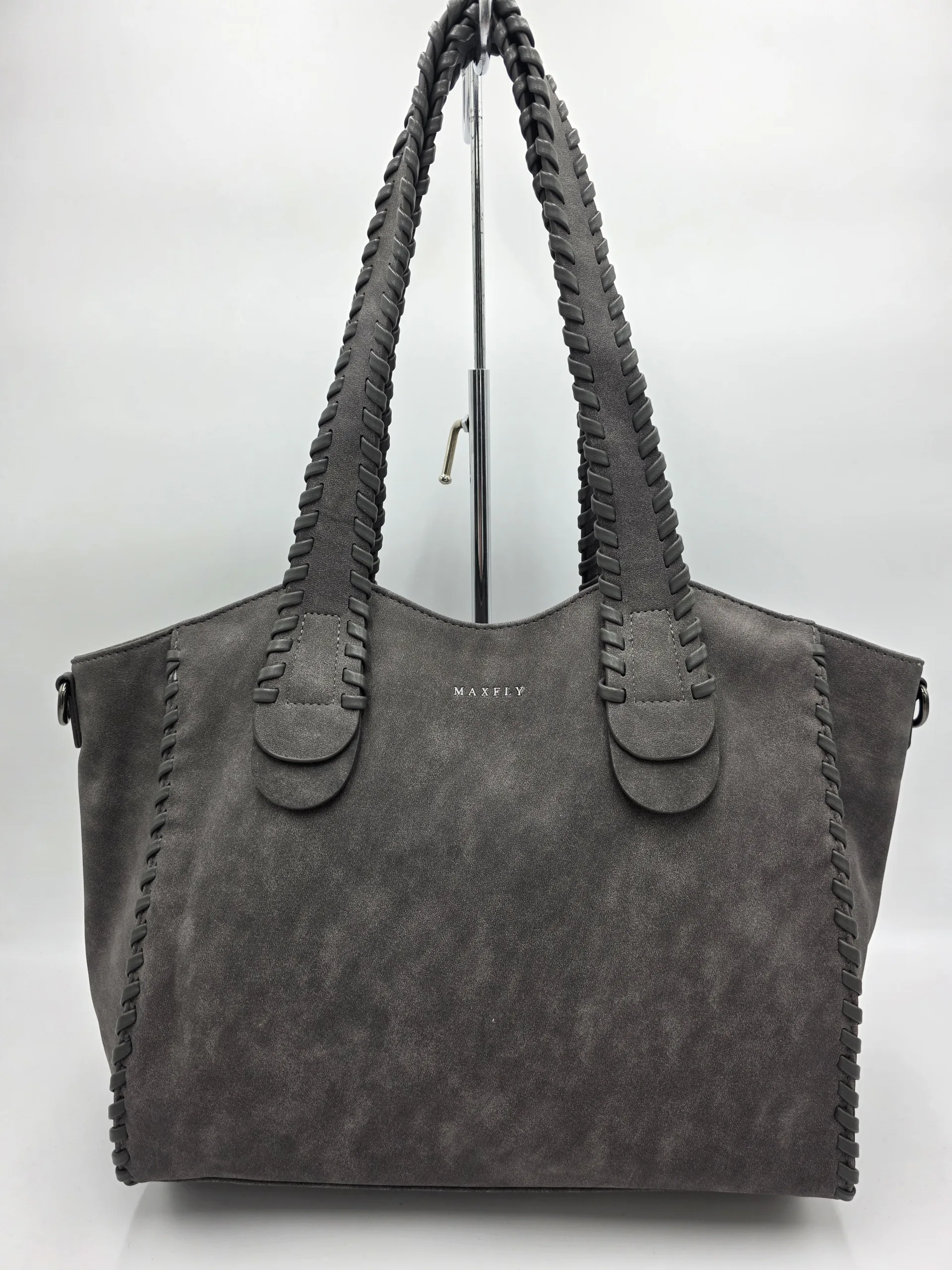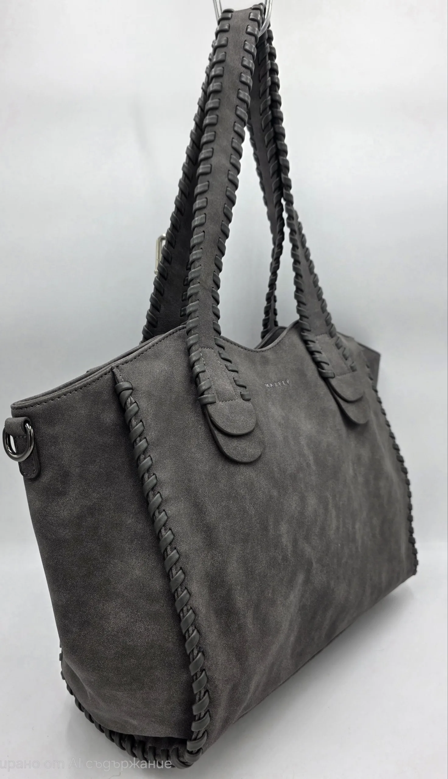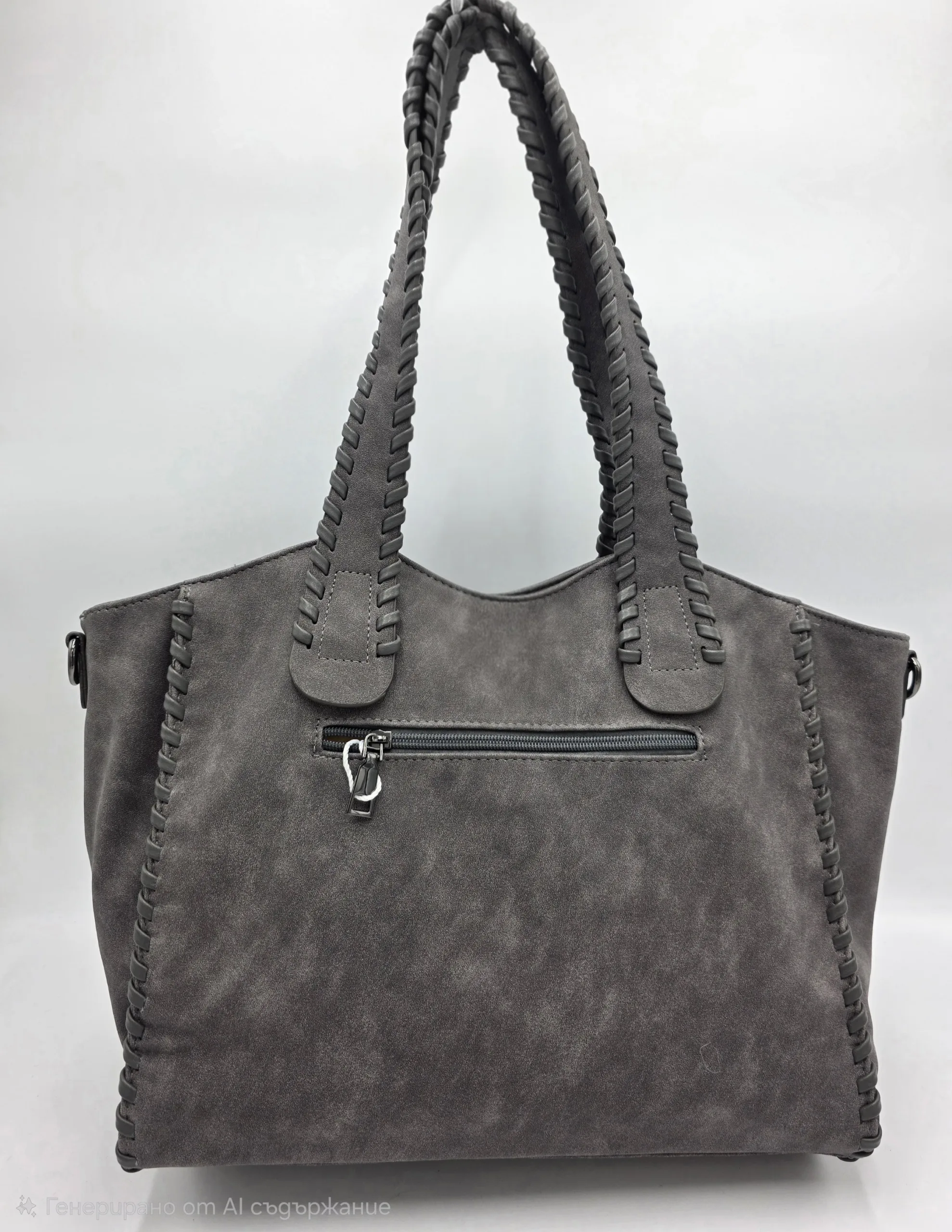 Чанта от еко велур с две дръжки 60см и допълнителна дълга регулираща се дръжка 150см, закопчаване с цип, заден външен джоб с цип, вътре със средна преграда с цип,вътрешен джоб с цип и допълнителни джобове за телефон. Ширина 37см,височина 29см,дъно 34см/12см.