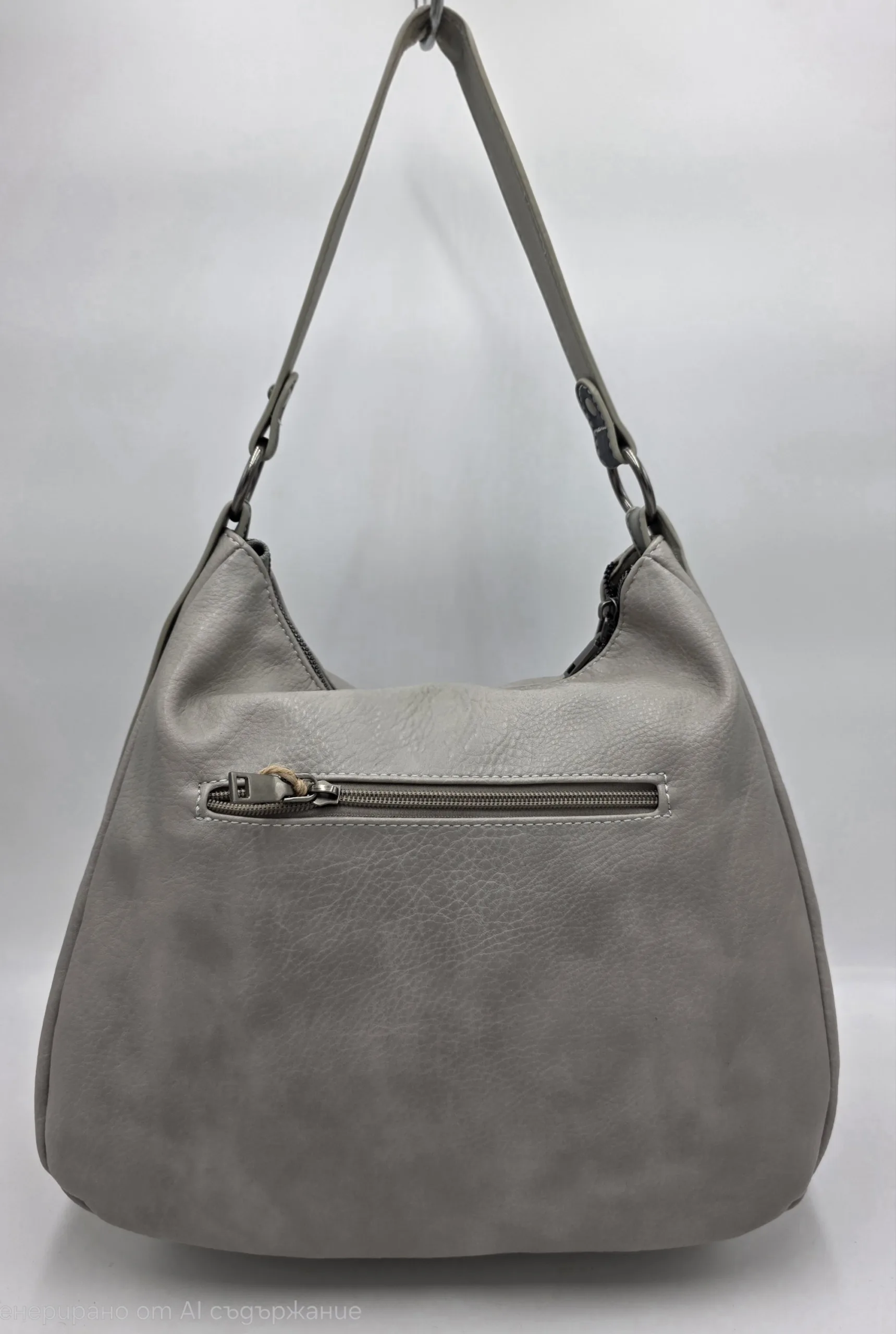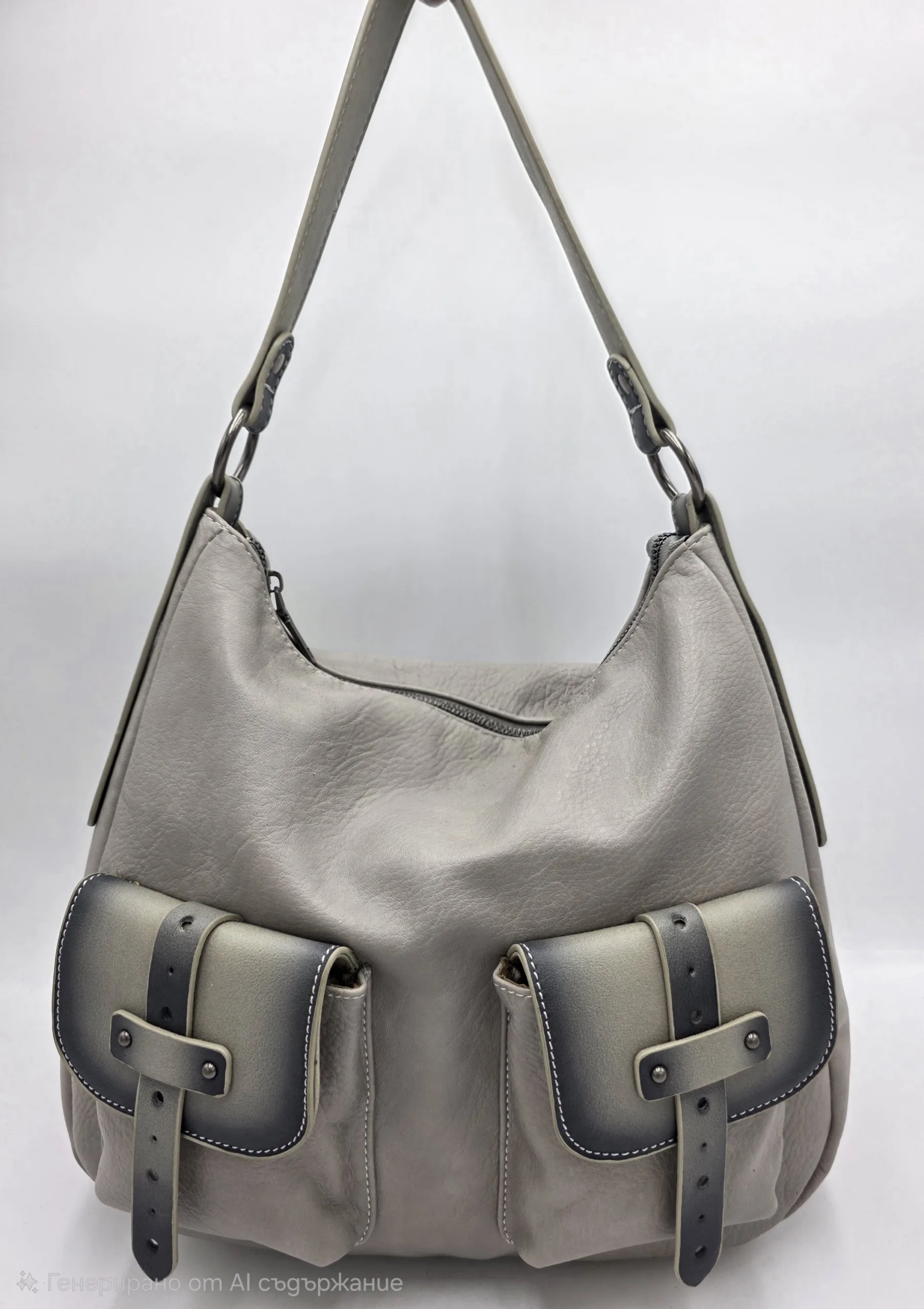 Чанта от еко кожа с една дръжка 44см и допълнителна регулираща се дръжка 150см, с два предни джоба ,заден външен джоб с цип,вътре с преграда към едната страна с цип, вътрешен джоб с цип и допълнителни джобове за телефон. Ширина 33см,височина 30см,дъно 34см/11см.