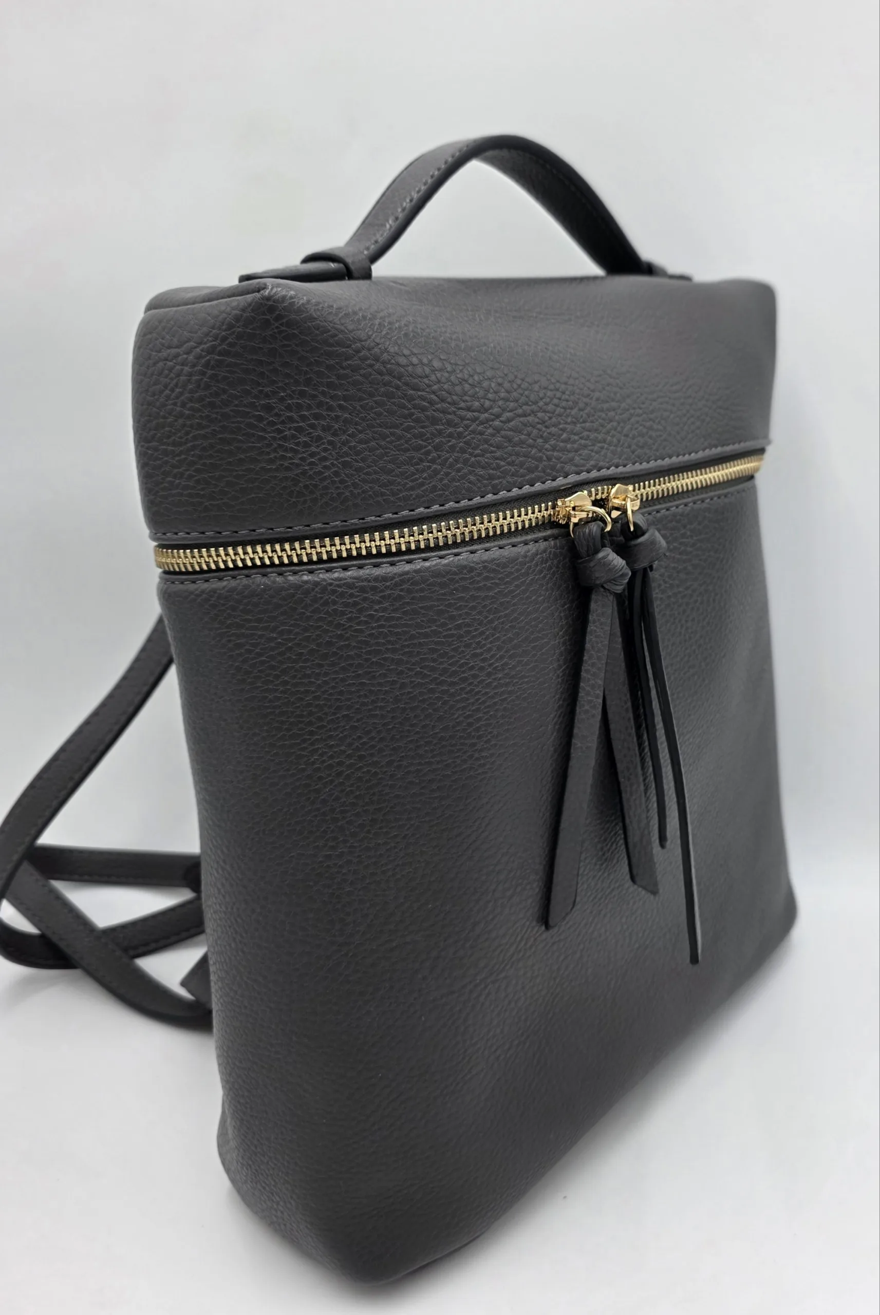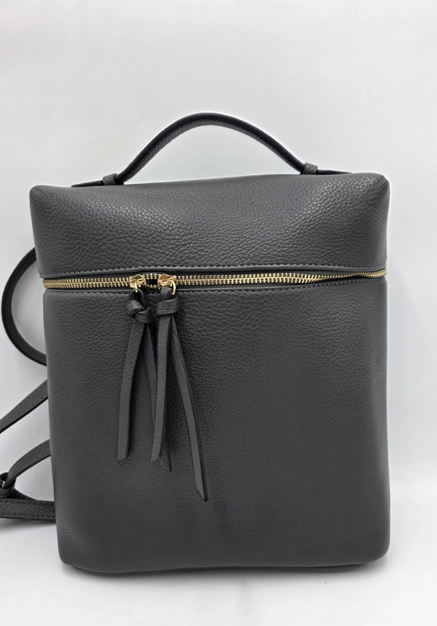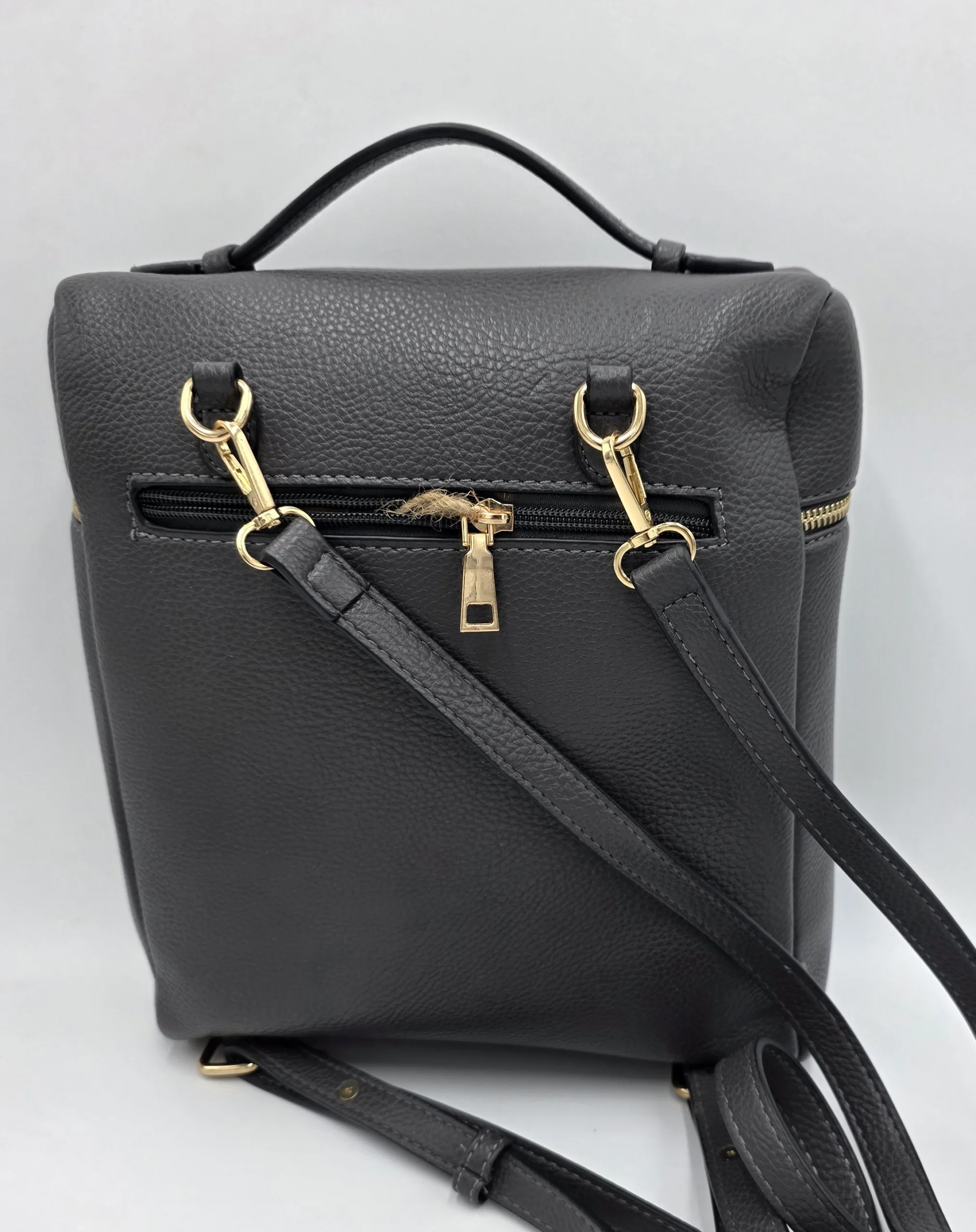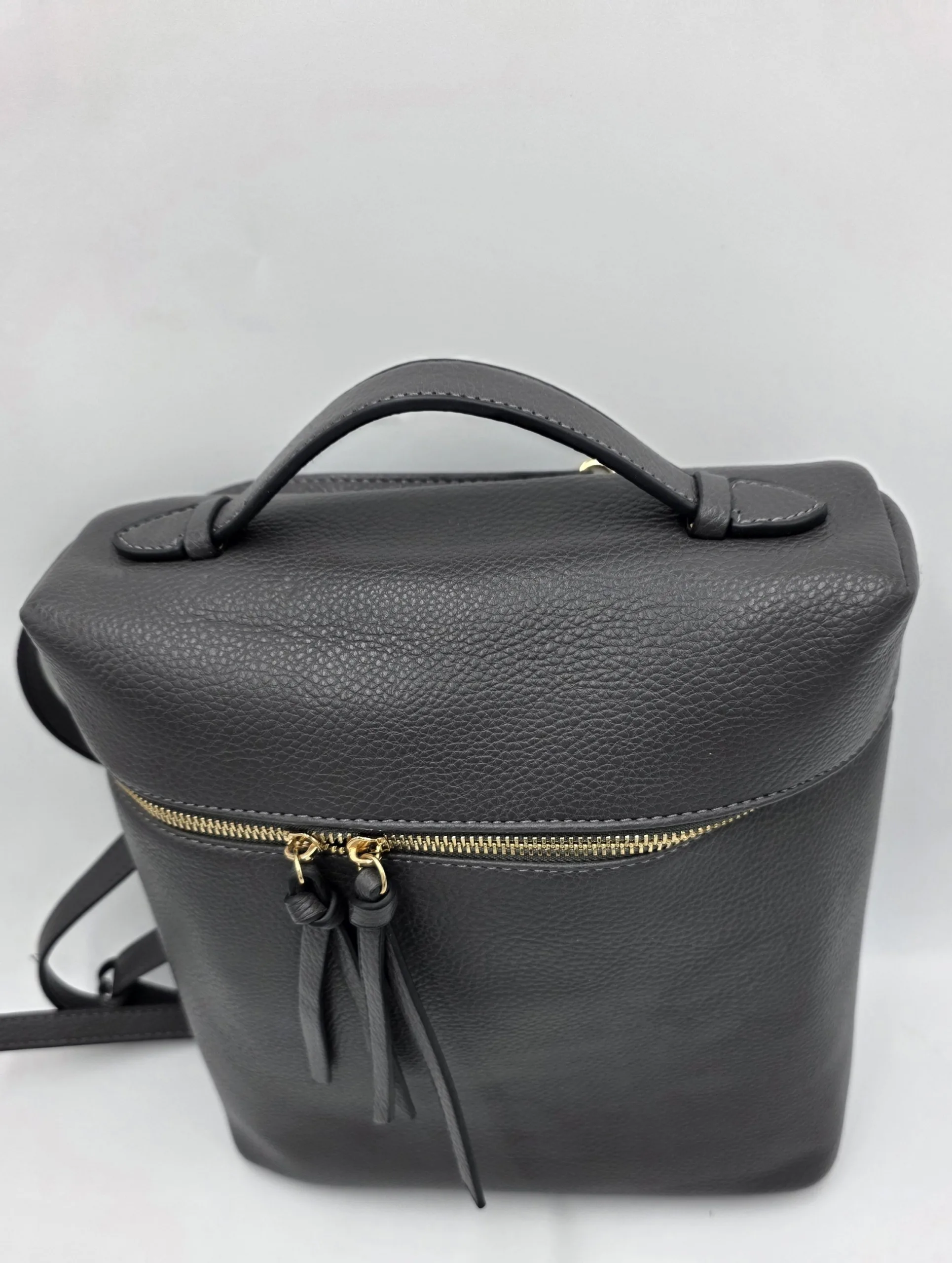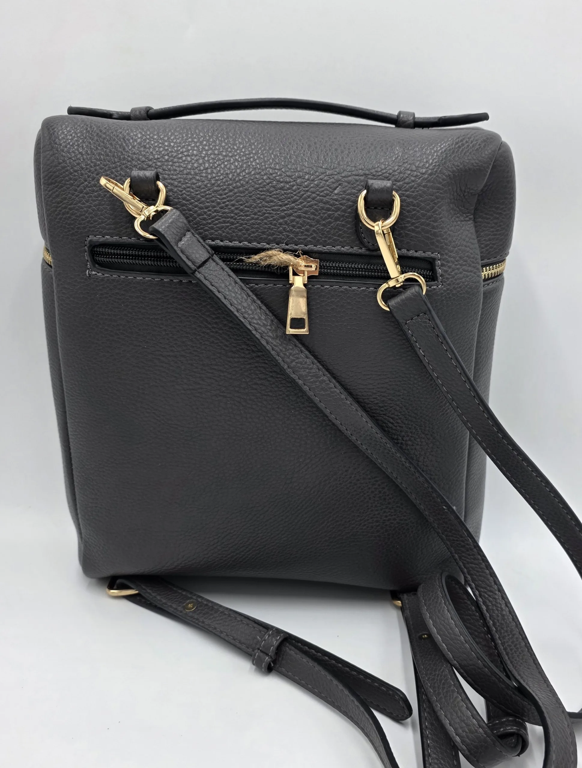 Раница от еко кожа с интерсно закопчаване с цип, външен заден джоб с цип, вътрешен джоб с цип и допълнителни джобове за телефон. Височина 28см,ширина 26см,дъно 26см/8см.