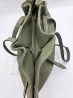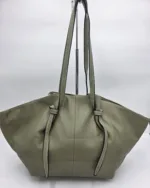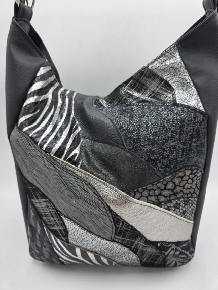 Чанта от еко кожа с нестандартна форма с две вързани регулиращи дръжки 120см максимална дължина, закопчава се с цип и две тик так копчета в двата края ,вътрешен джоб с цип и допълнителни джобове за телефон,ширина в горната част 52см,ширина в долната част 25см,височина 27см,дъно 26см/13см