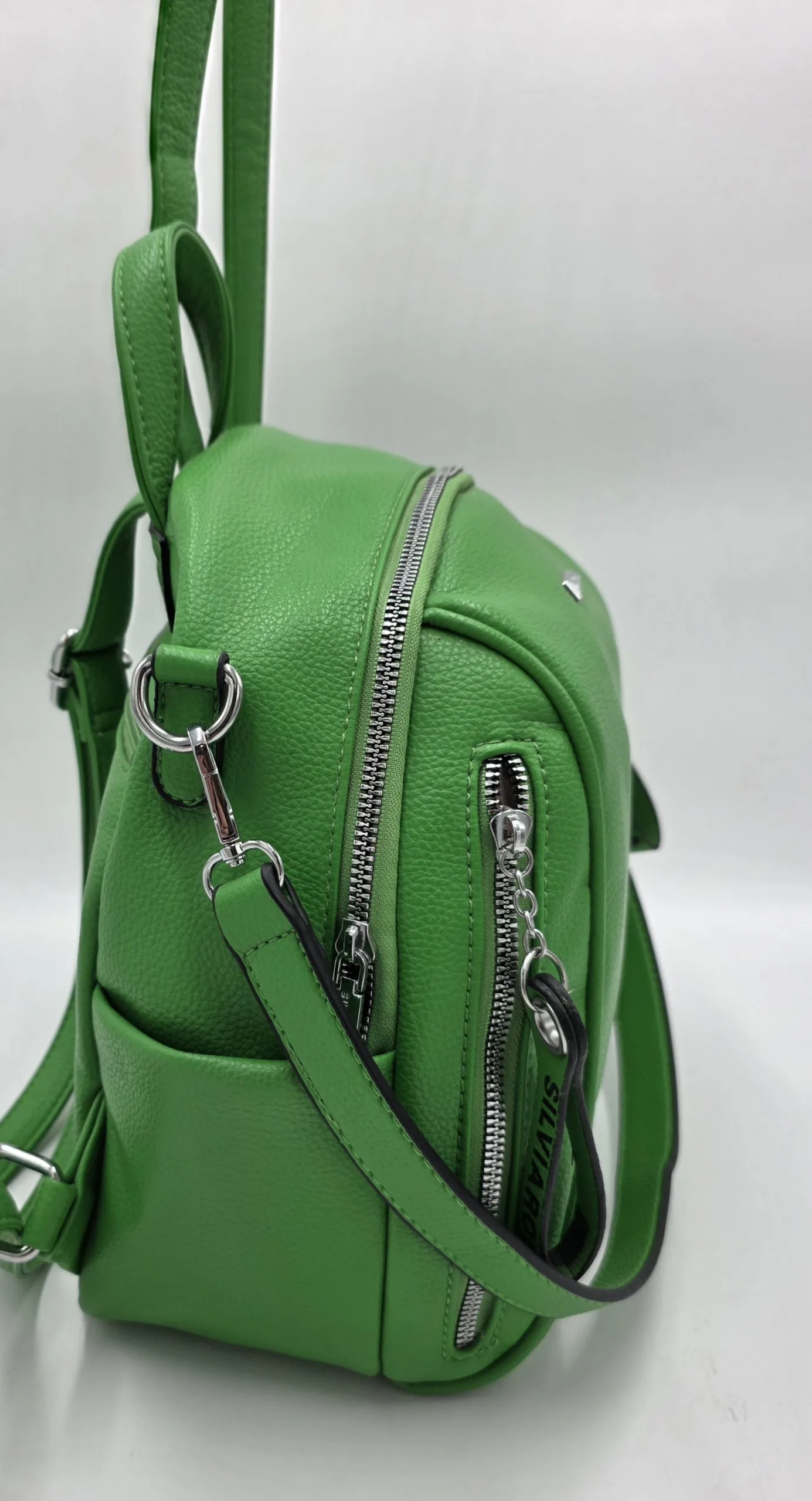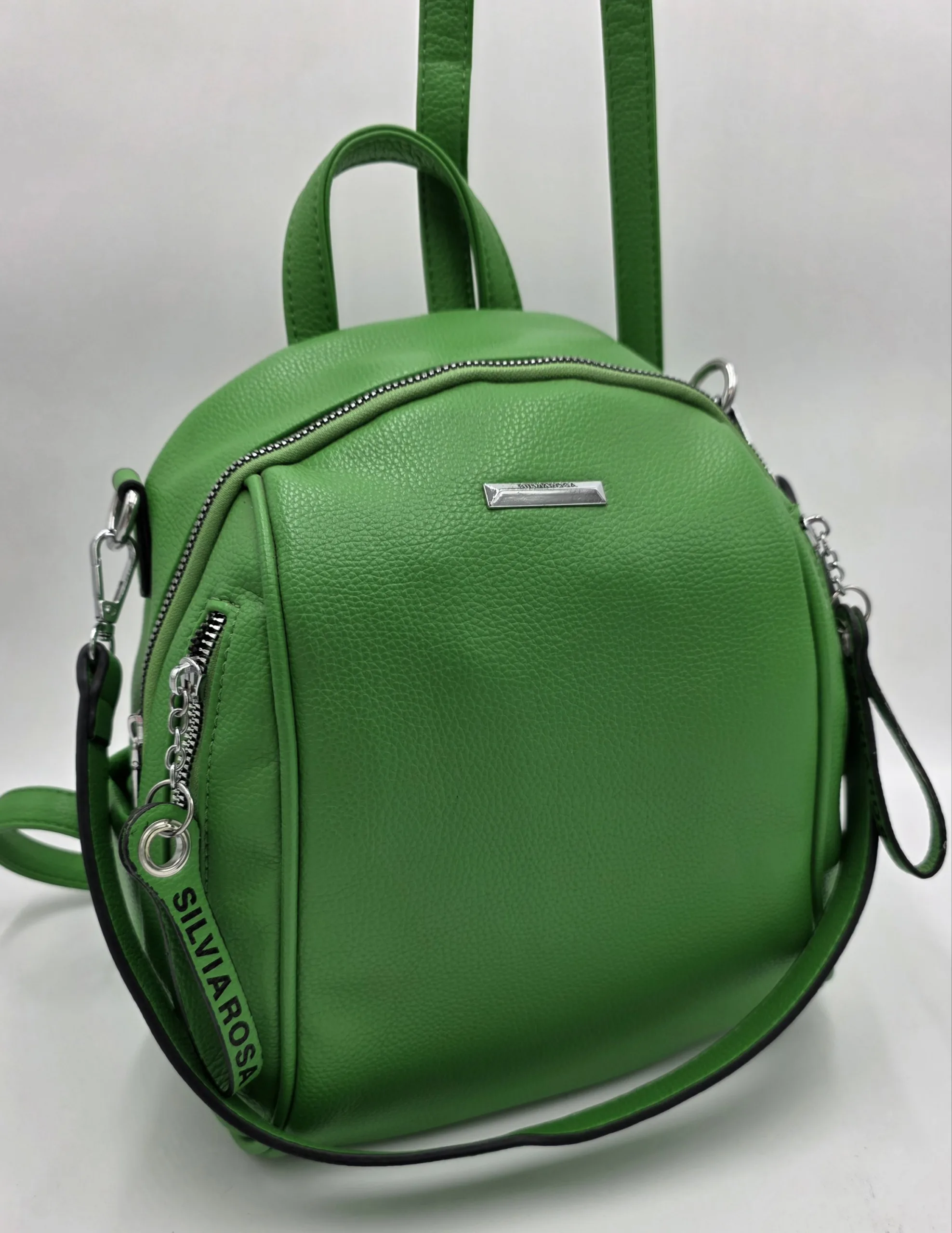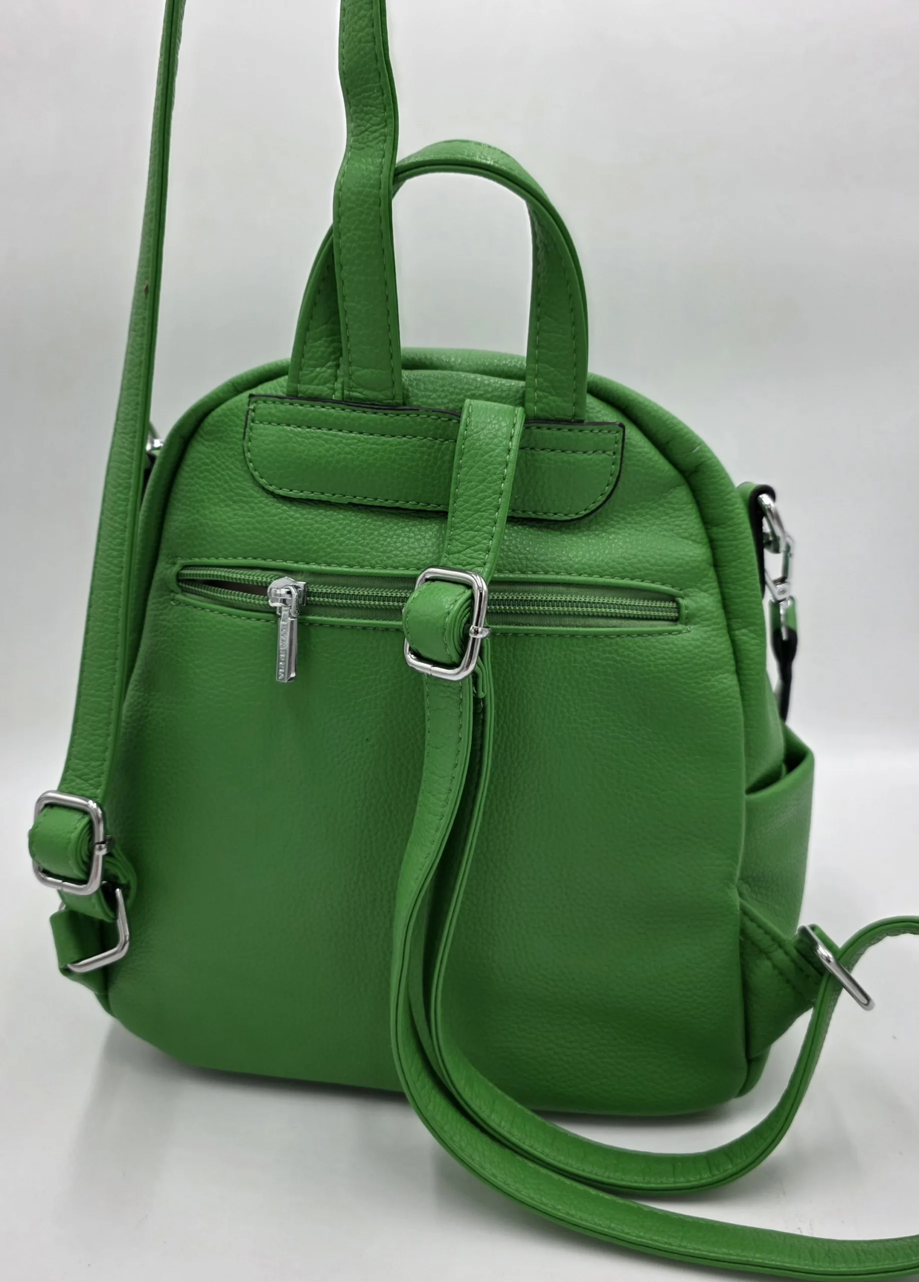 Раница от еко кожа с едно отделение,два предни джоба с цип, заден външен джоб с цип, вътрешен джоб с цип и допълнителни джобове за телефон, допълнителна дръжка за рамо. Височина 26см, ширина 25см,дъно 25см/14см.